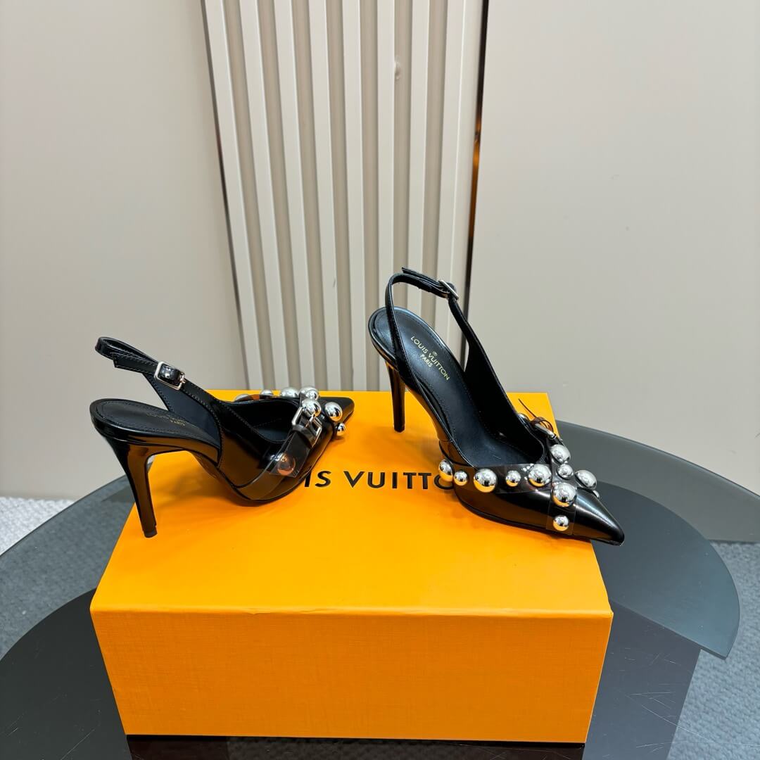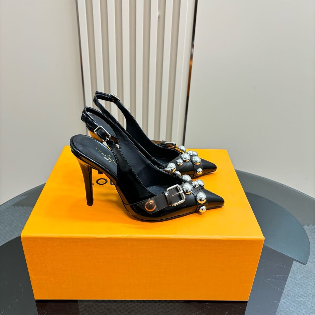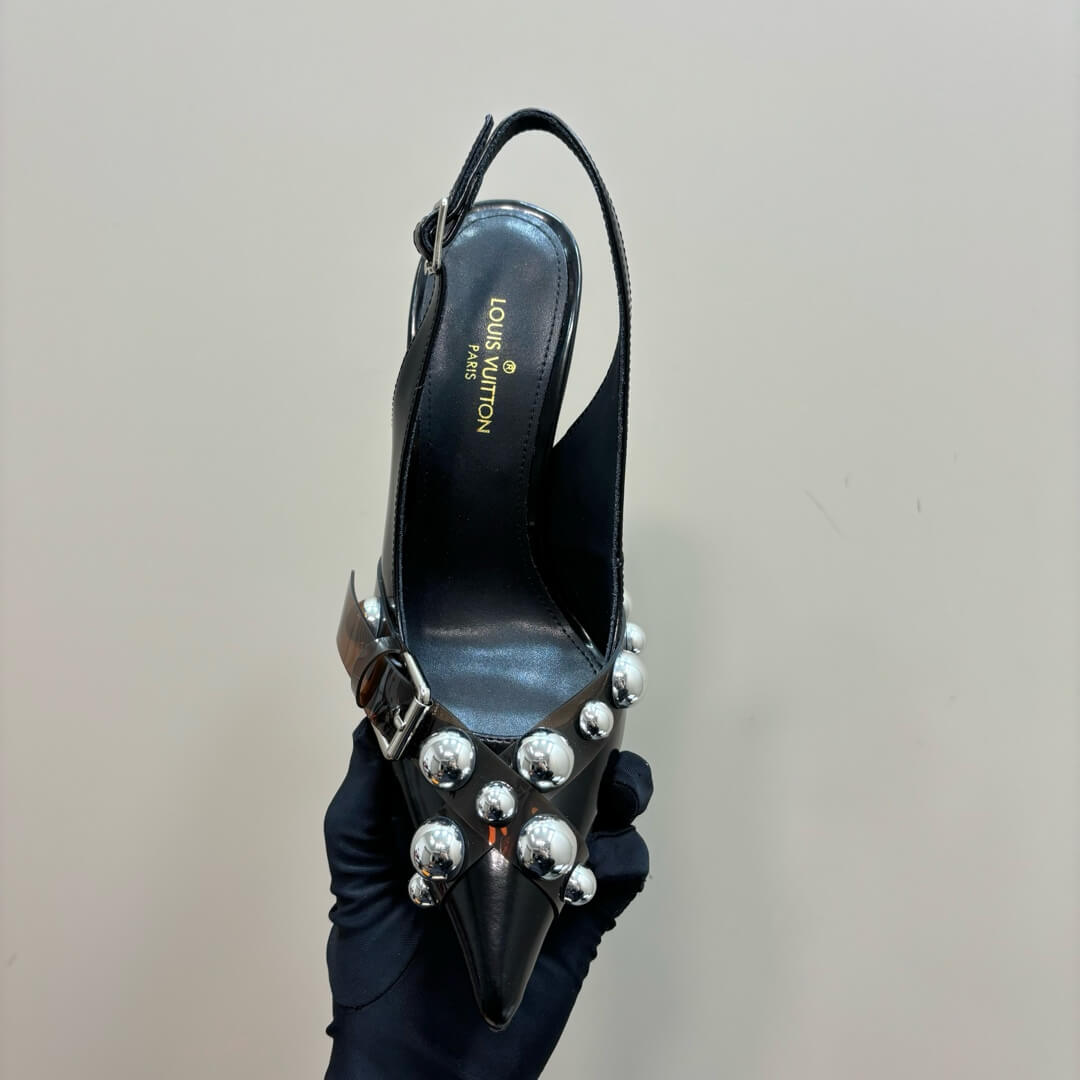 Turn heads with these Louis Vuitton Black Monogram Slingback Stiletto Heels, a perfect blend of bold style and timeless luxury. Crafted from black monogram canvas, these heels feature an elegant pointed toe, slender stiletto heel, and adjustable slingback strap for a secure fit. The highlight is the stunning silver-tone stud embellishments and sleek buckle detail, adding an edgy yet sophisticated touch.