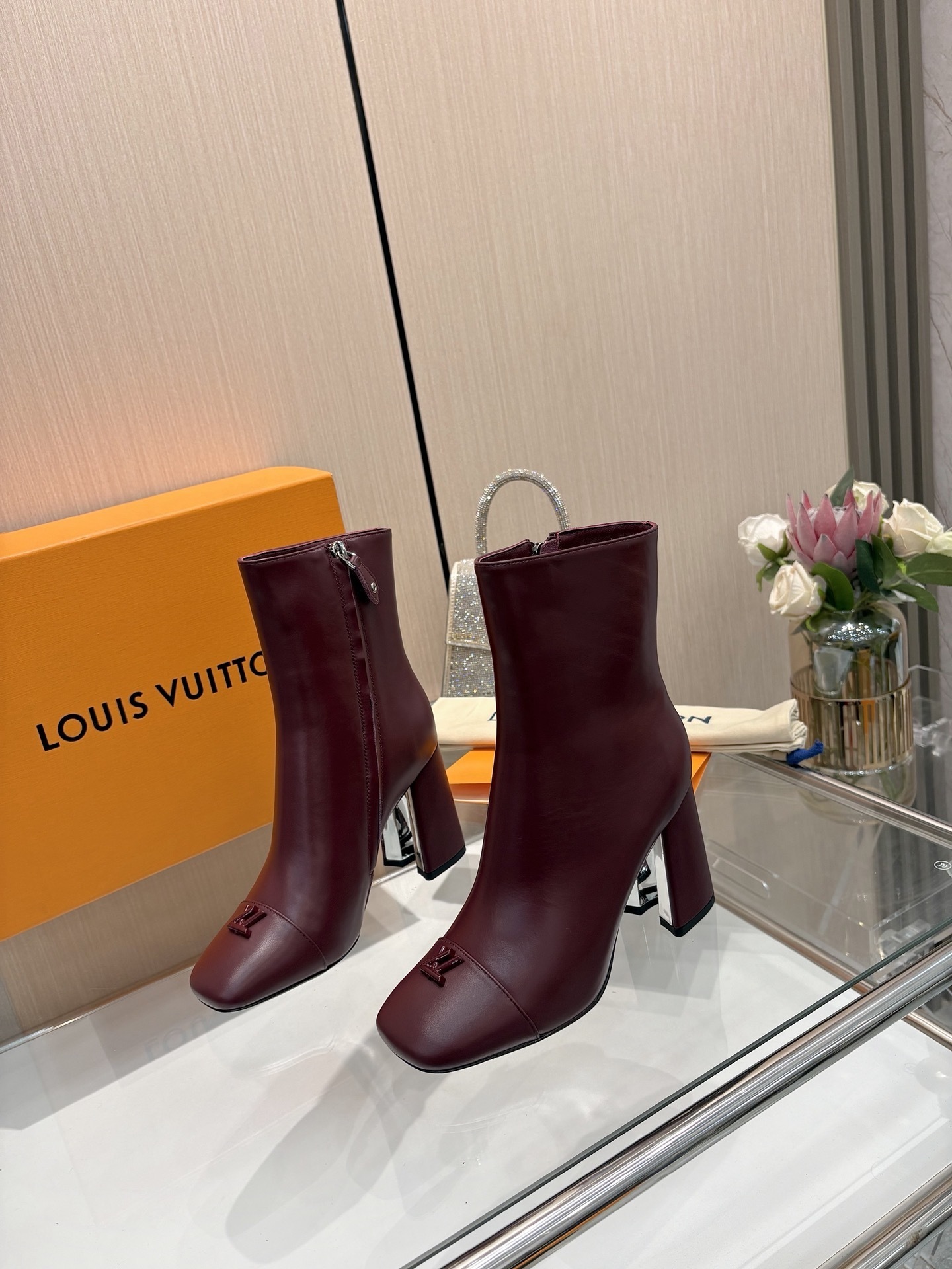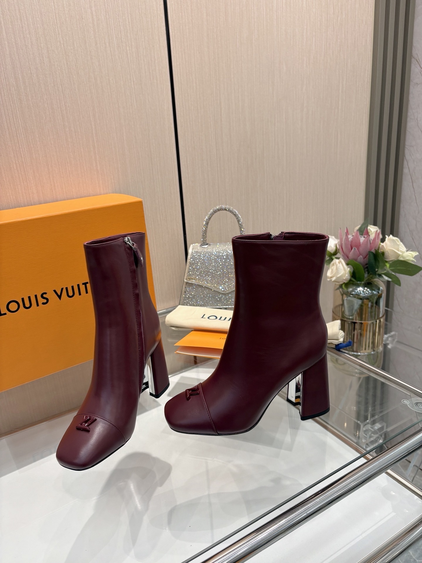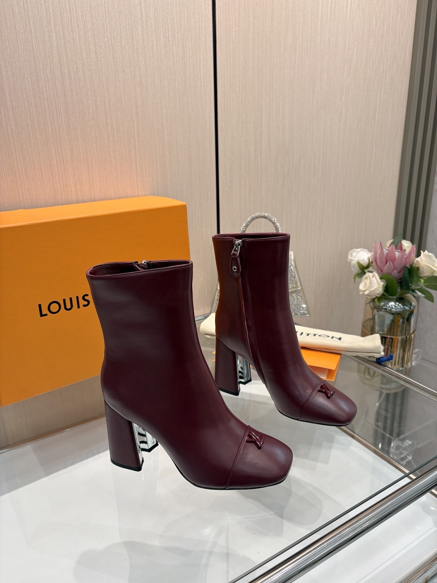 Elegant and contemporary, these Louis Vuitton Burgundy Leather Ankle Boots are crafted from smooth calf leather, offering a sophisticated silhouette perfect for day-to-night transitions. The design features a sleek square toe adorned with a tone-on-tone LV Twist accessory, adding a subtle yet iconic touch of luxury. A side zip ensures easy wear, while the sturdy block heel provides height and comfort in equal measure. Finished with a polished heel accent, these boots embody timeless Parisian elegance with a modern edge.