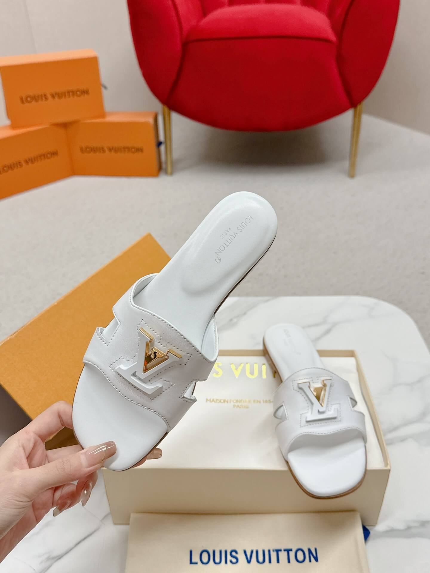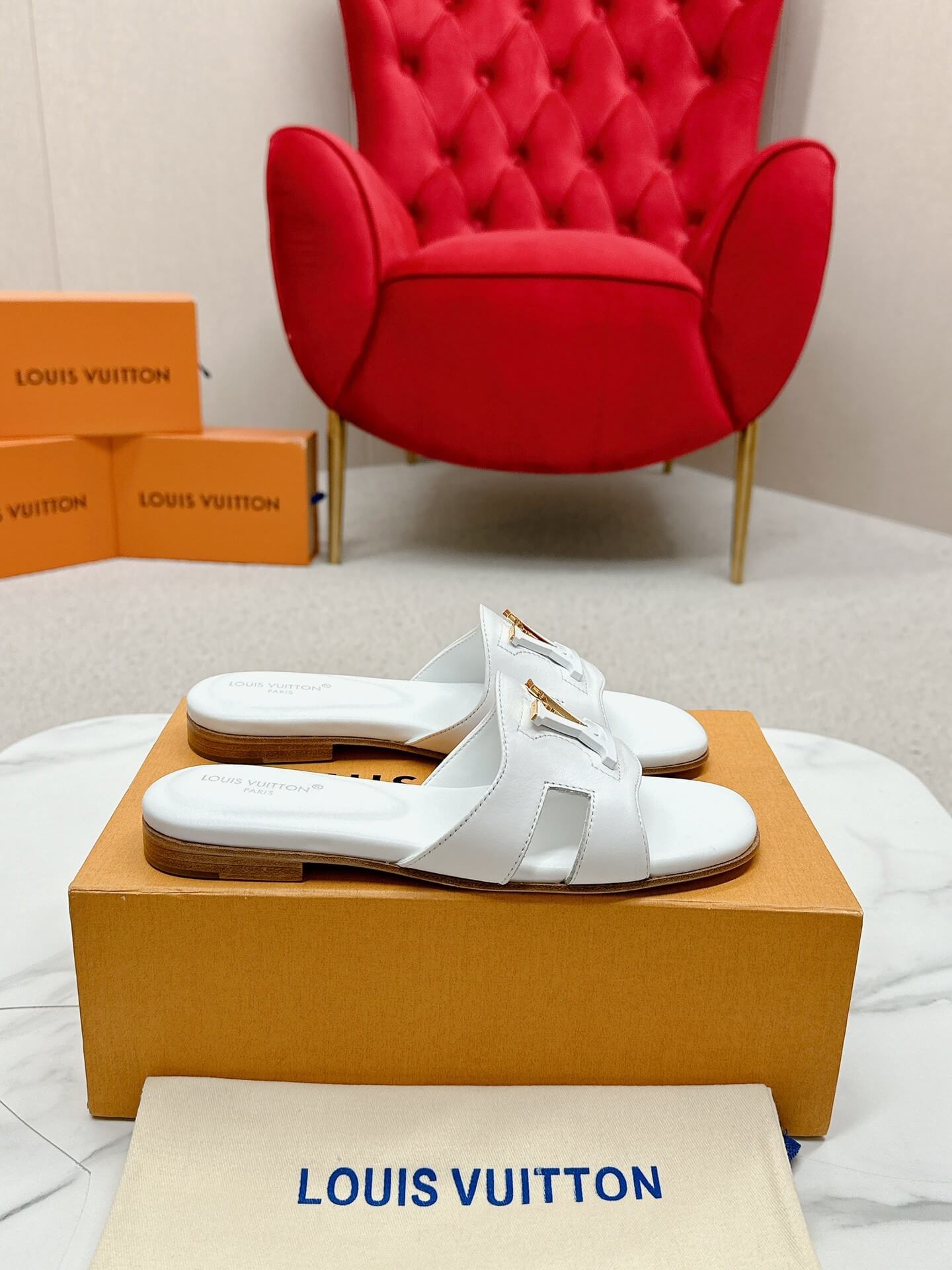 Elevate your warm-weather style with the Louis Vuitton Capri Flat Mules in crisp white leather. Designed with a structured wide strap featuring elegant cut-out details and the signature Louis Vuitton monogram hardware, these mules exude timeless luxury. The flat sole ensures effortless wearability, making them perfect for vacations, brunch outings, or casual-chic ensembles. Whether paired with summer dresses, linen pants, or tailored shorts, these mules bring sophistication to every step.