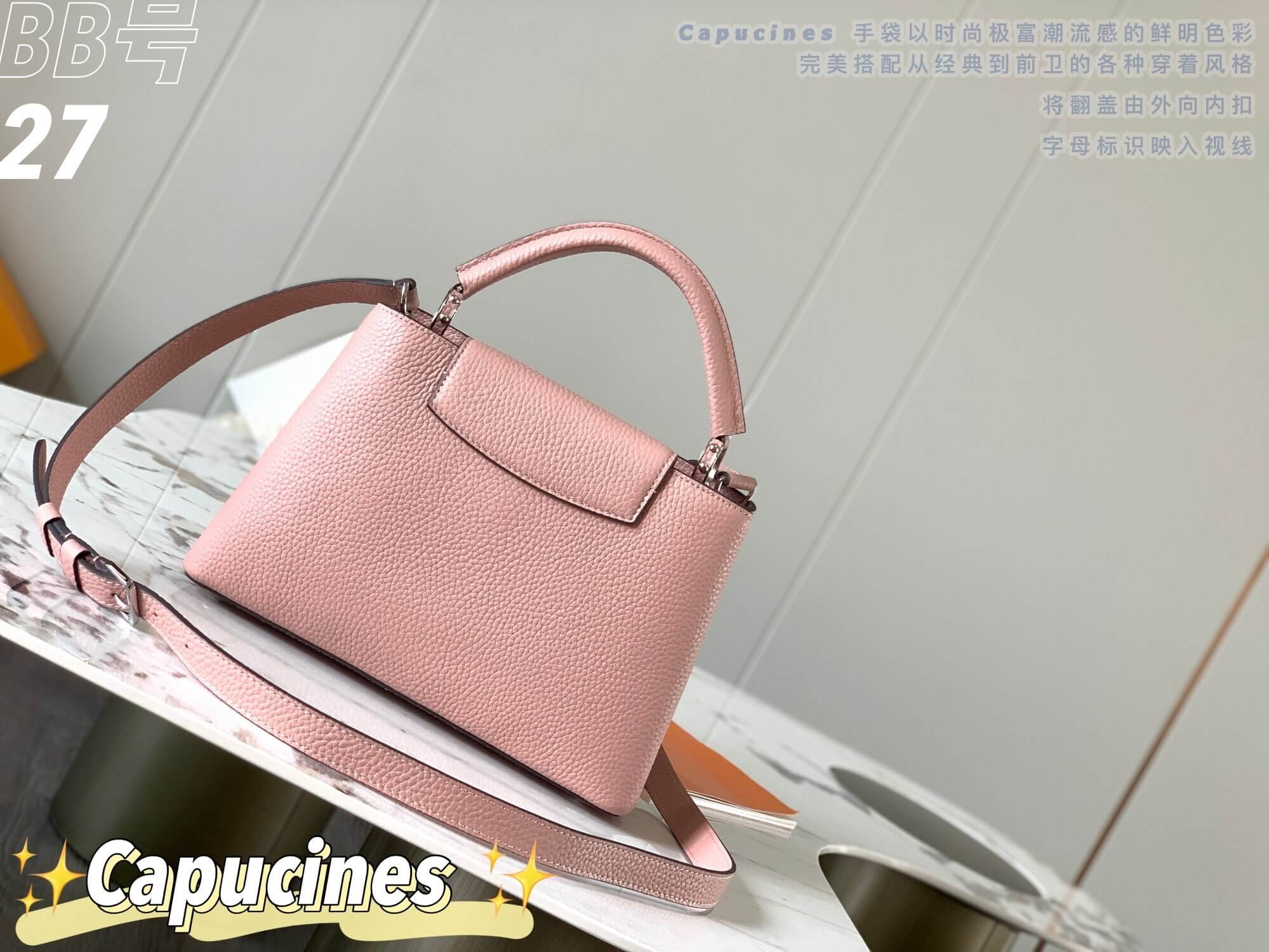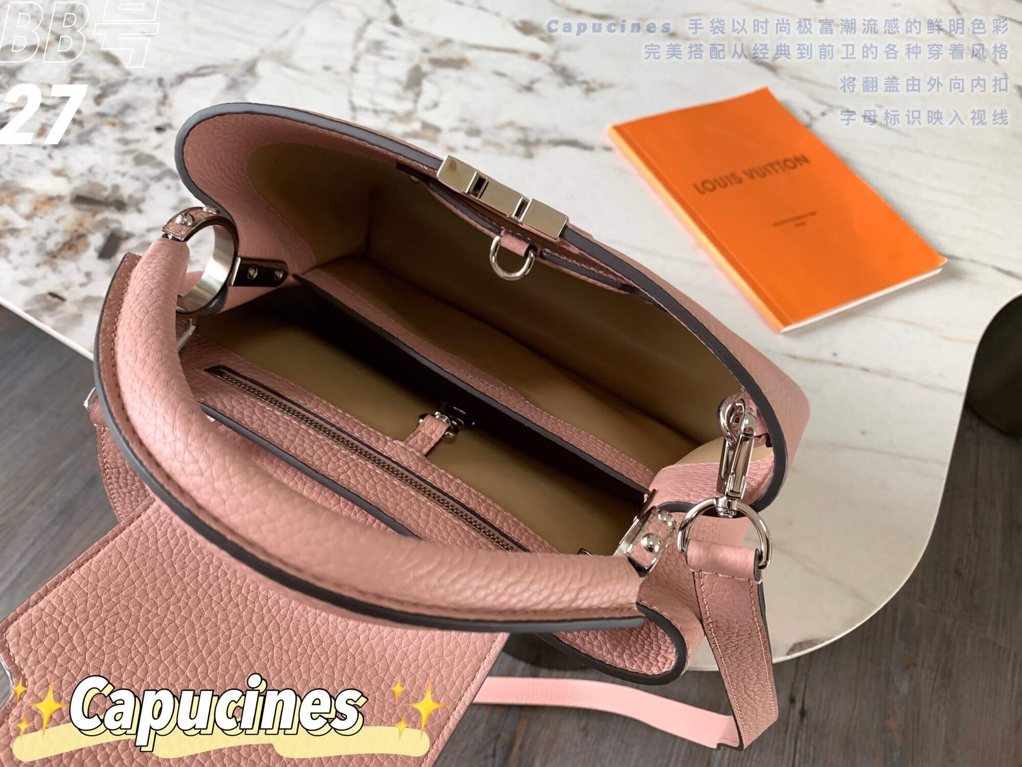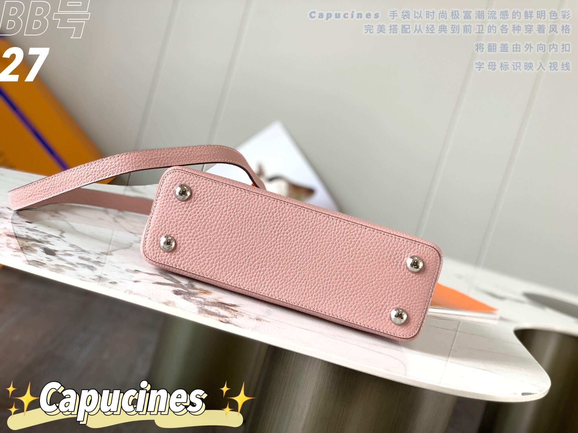 Delicate yet sophisticated, the Louis Vuitton Capucines BB Taurillon Leather Handbag in Rose Trianon Pink is a statement of understated luxury. The gentle pink hue brings a romantic and polished touch, making it perfect for both daytime refinement and evening elegance.