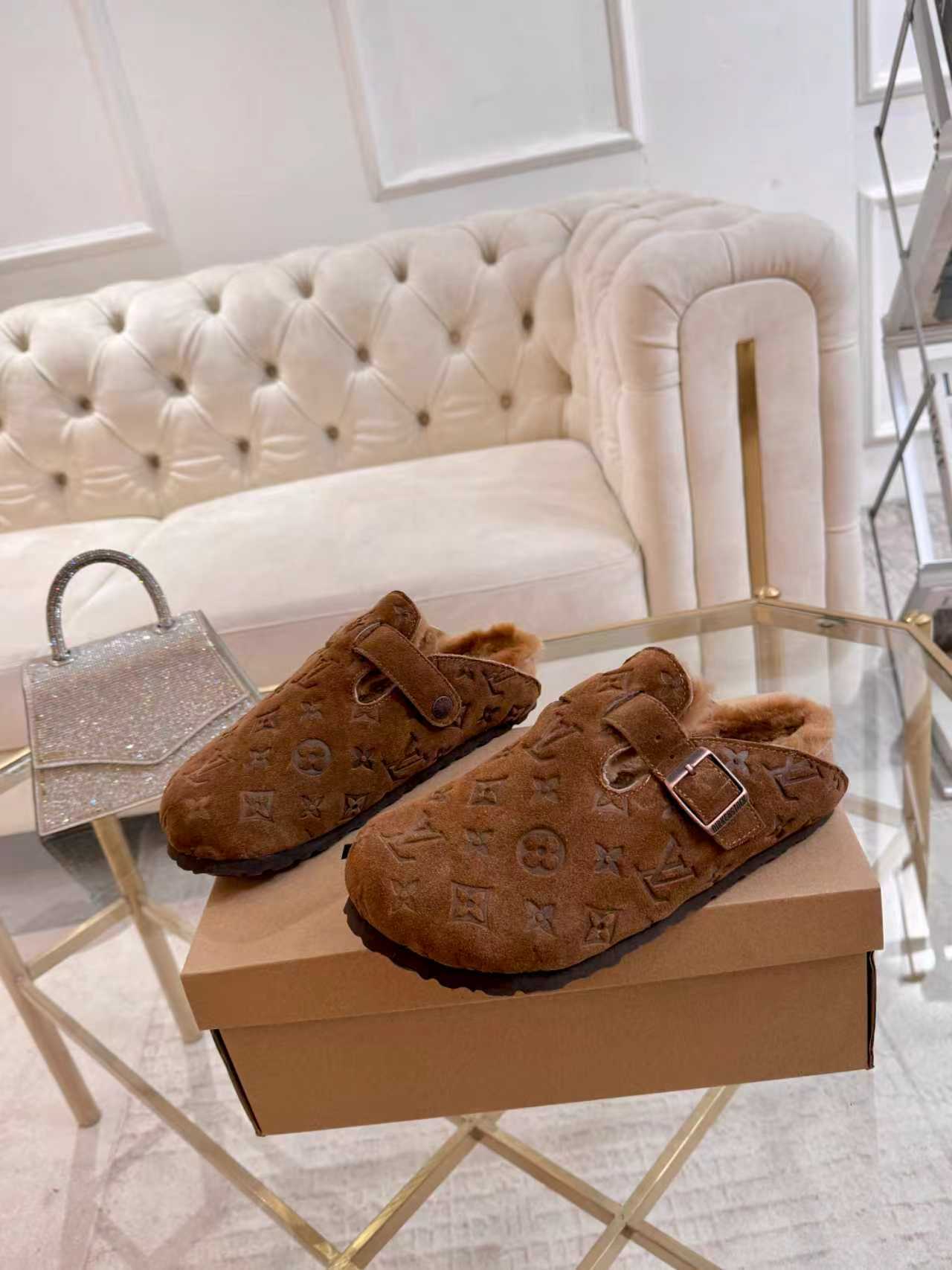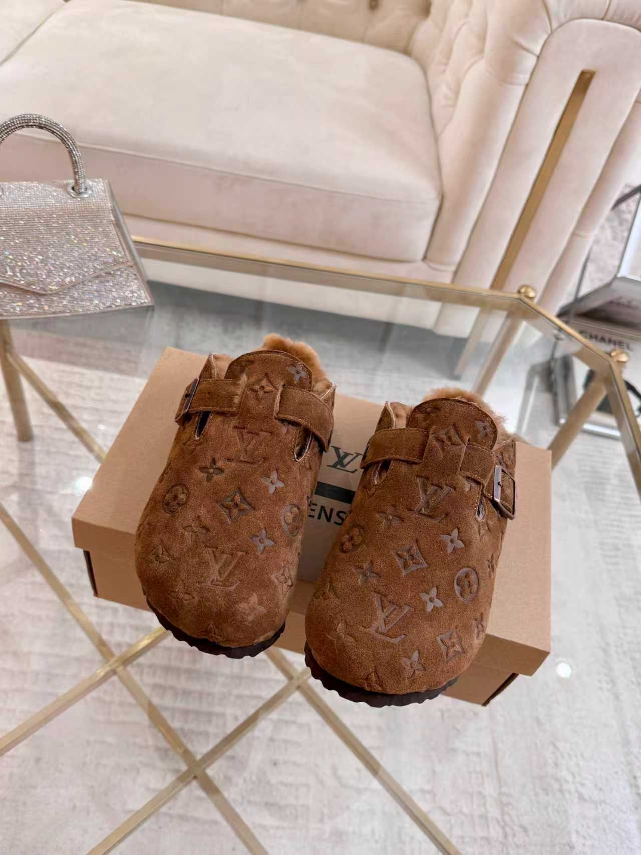 The soft chestnut brown suede upper, embossed with the signature LV Monogram, exudes understated sophistication. Inside, the rich shearling lining offers exceptional warmth and plush comfort, ideal for cozy indoor wear or chic off-duty styling. The adjustable bronze-tone buckle strap engraved with Birkenstock allows for a personalized fit, while the cork-latex footbed ensures natural support and cushioning.