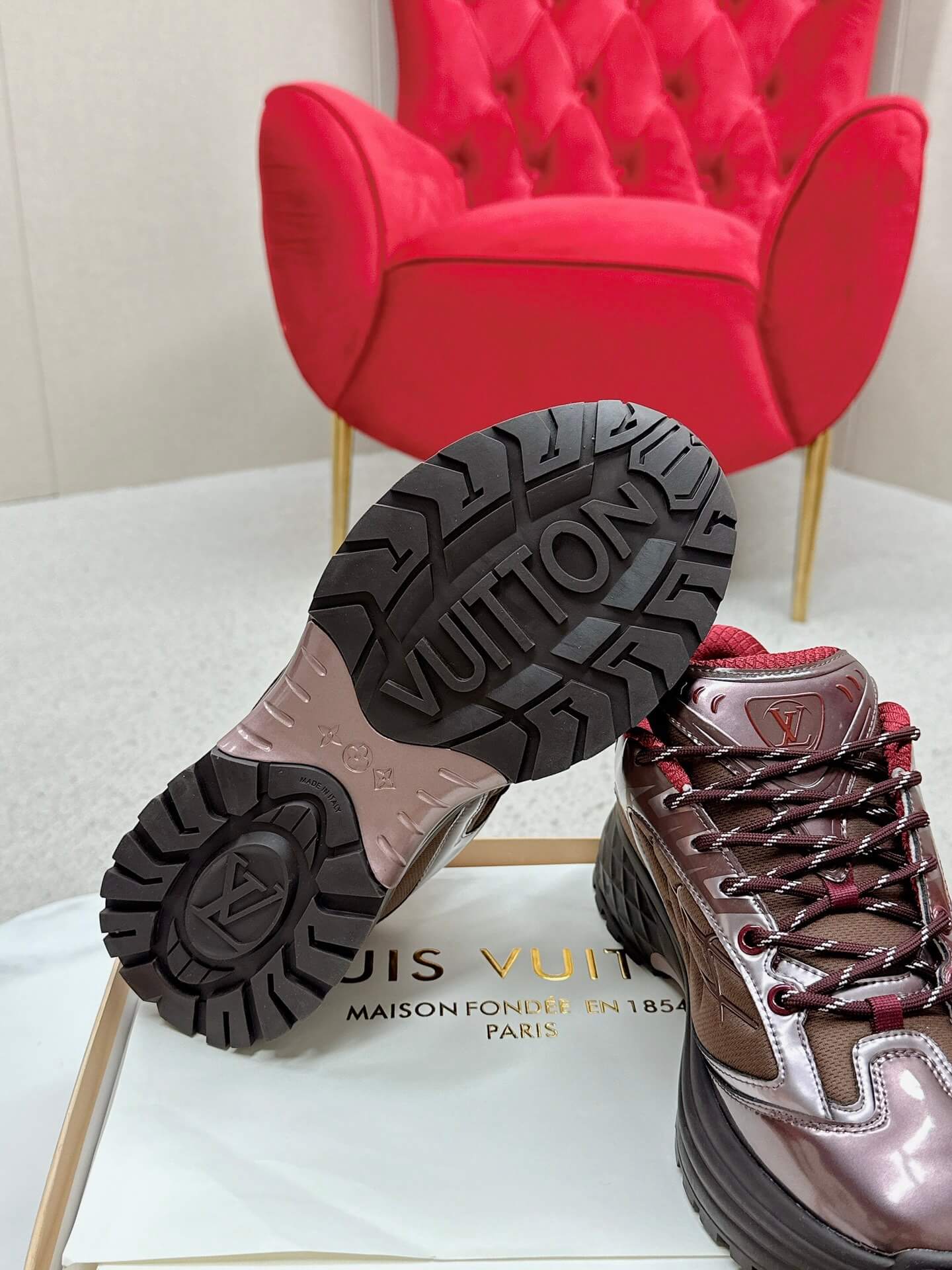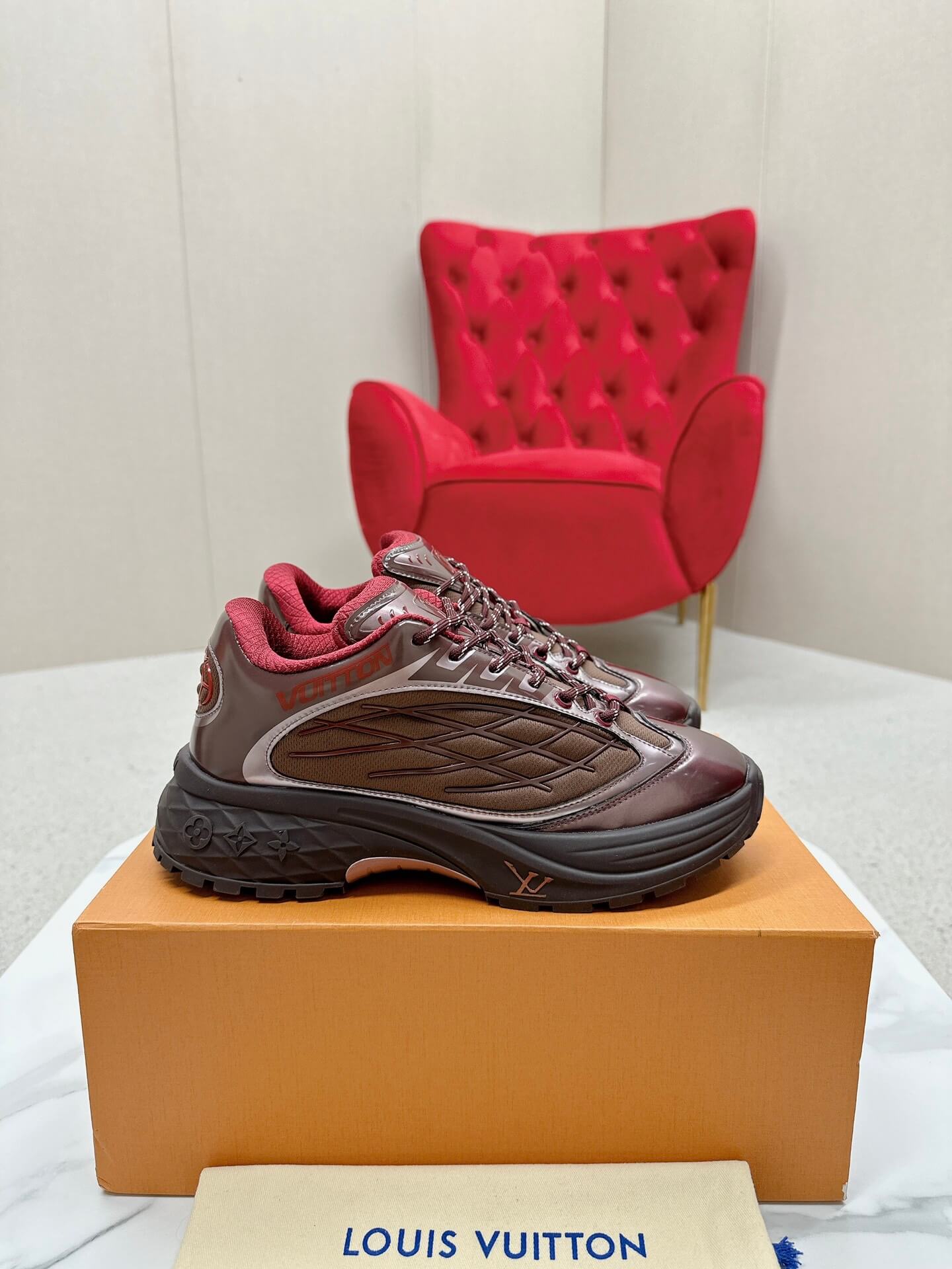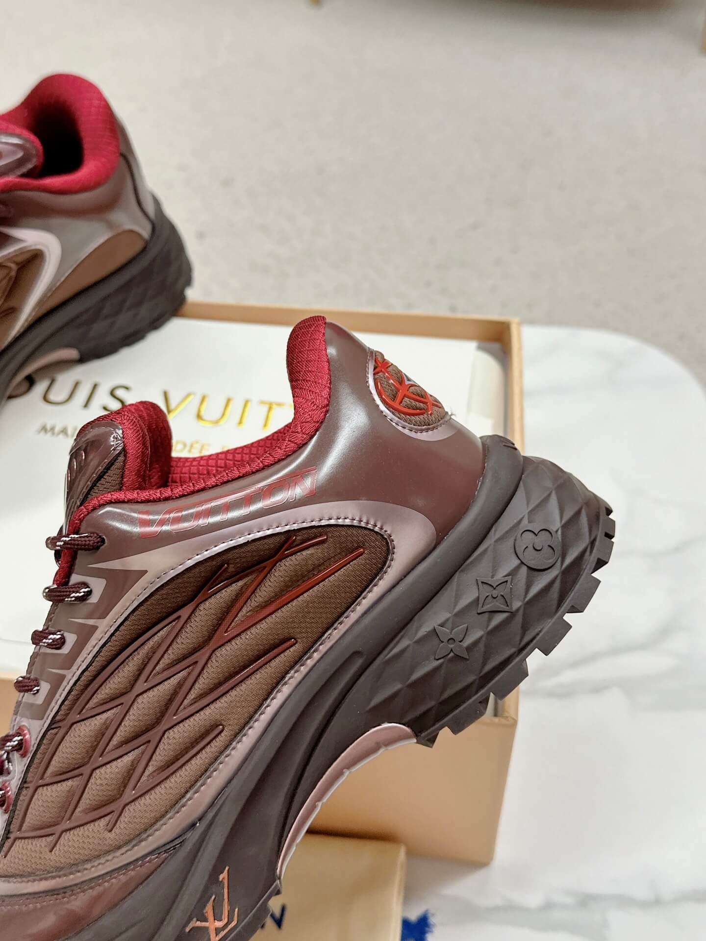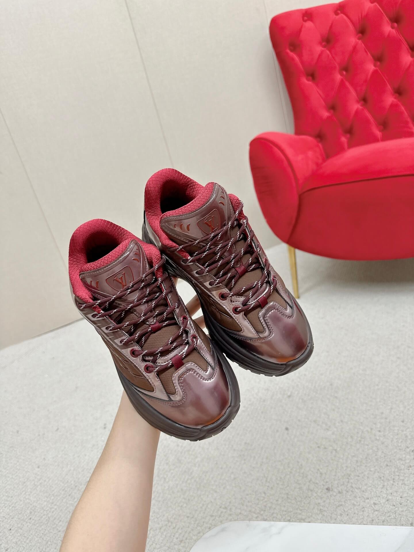 - Features: Layered design, “Vuitton” branding on the side, contrasting laces, cushioned insole, textured rubber outsole.