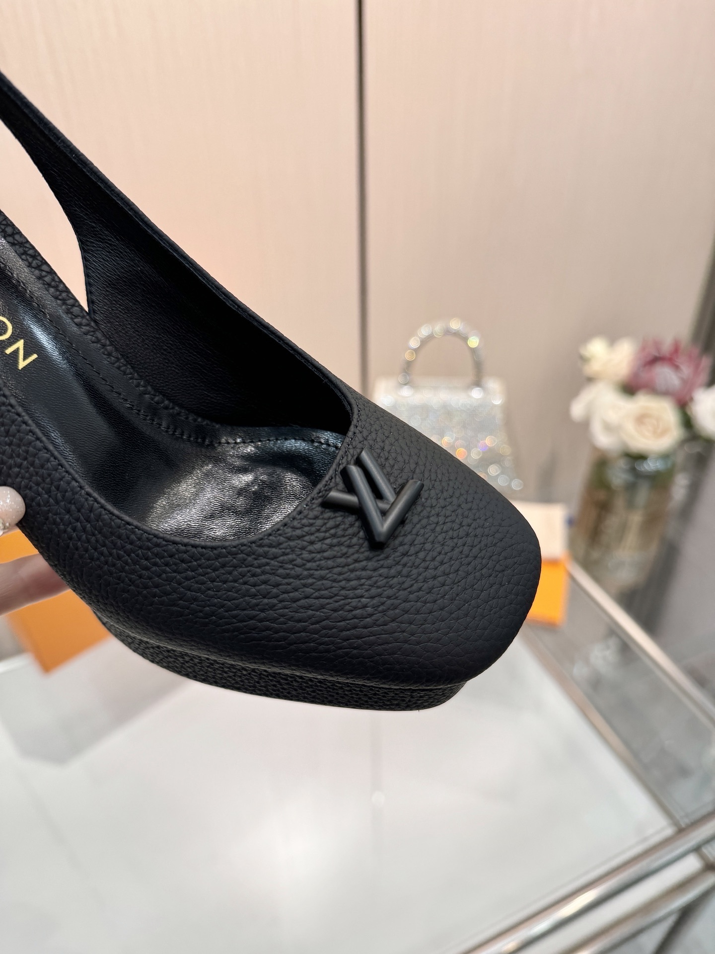 The Louis Vuitton Cherie Slingback Platform Pumps in Black Grained Leather offer a fresh reinterpretation of the house’s modern classic. Crafted in supple, textured calf leather, these pumps feature a daring slingback silhouette that combines sensuality with structure.