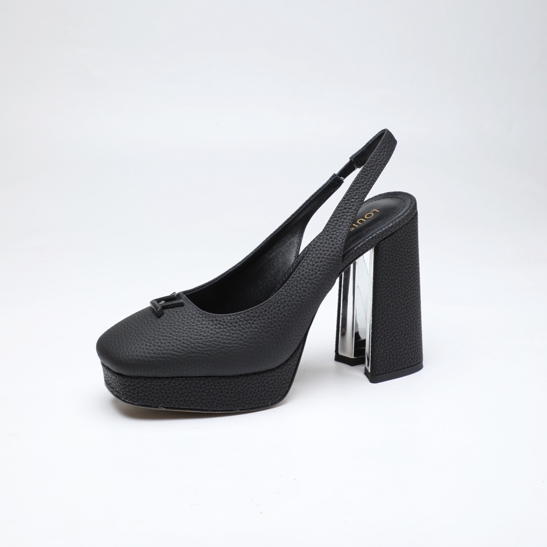 The signature tone-on-tone LV Initials adorn the toe for a sleek, monochromatic effect, while the statement block heel with its mirrored metallic accent adds architectural appeal. Designed with a comfortable platform and adjustable slingback strap, this model blends bold design with everyday elegance — perfect for both sophisticated daywear and evening allure.