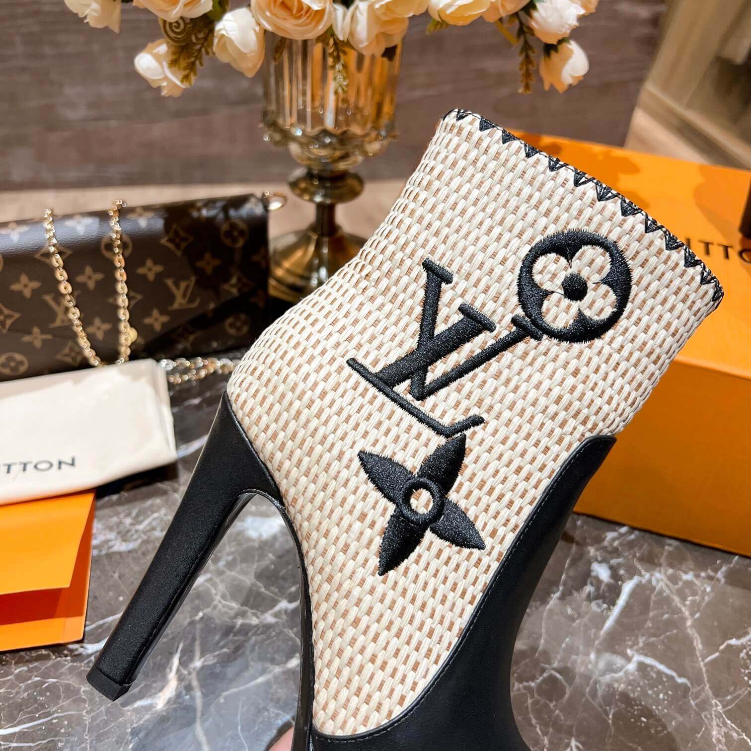 Elevate your style with the authentic Louis Vuitton High-Heeled Ankle Boots, a sophisticated blend of classic elegance and unique design. These striking boots feature a sleek, rounded toe and a luxurious black leather lower section. The design transitions beautifully into an off-white/beige woven or textured canvas shaft, prominently adorned with large, black Louis Vuitton Monogram elements (LV initials and flowers) in a captivating embroidered pattern. Designed for a commanding presence, these boots are set on a high stiletto heel with a platform sole, ensuring both elegance and comfort. Completed with black leather trim and a convenient side zipper, these boots are an exquisite fusion of iconic luxury and contemporary artistry.