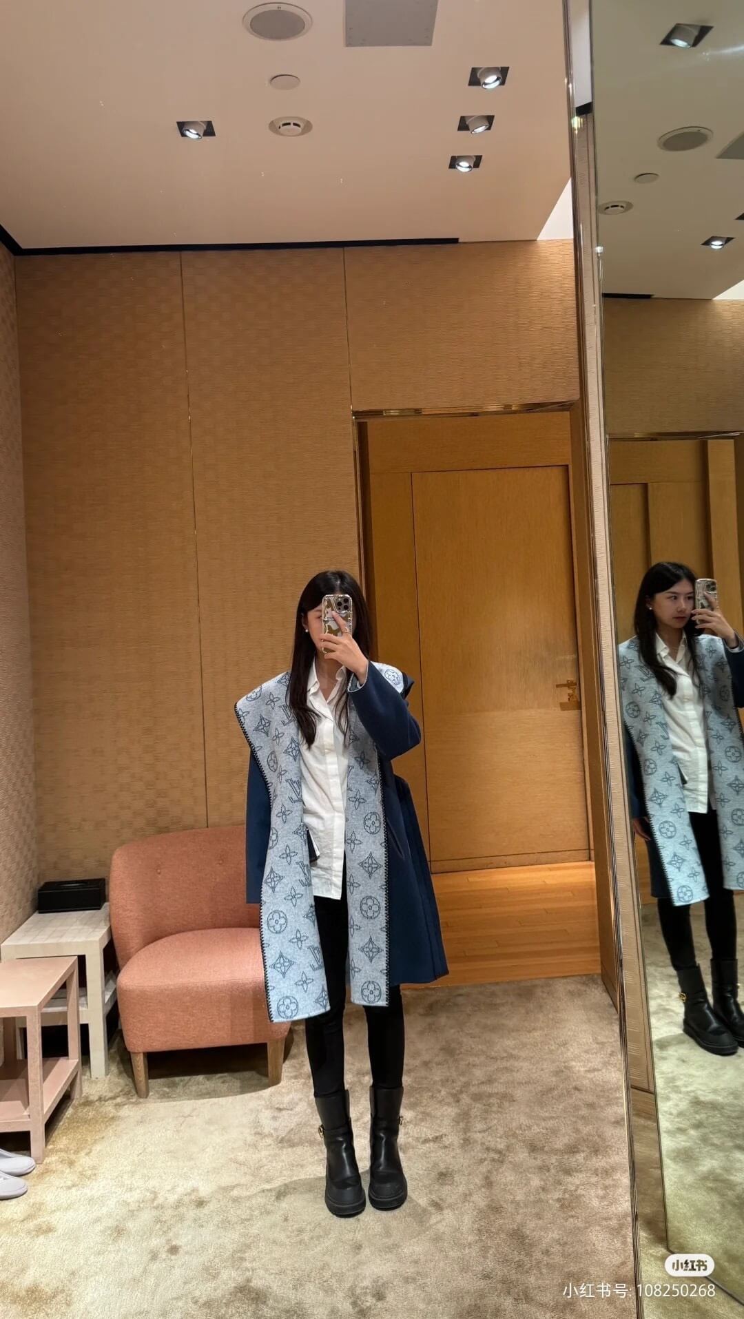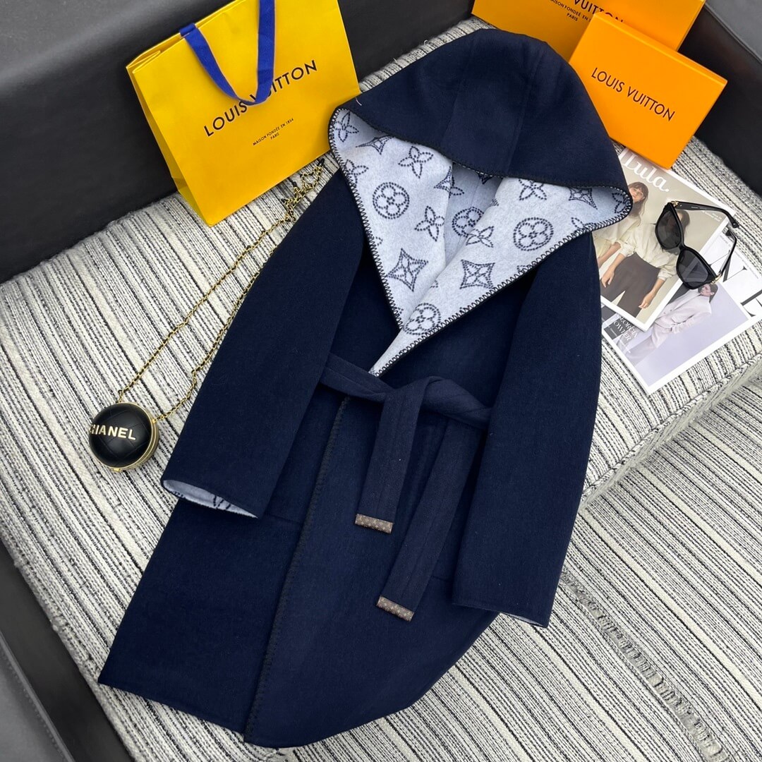 Designed for the modern woman who moves gracefully between sophistication and comfort, the Louis Vuitton Hooded Long Wrap Coat in navy blue is the perfect outerwear companion for city days and evening travels alike. Its plush wool-cashmere blend offers refined warmth, while the iconic monogram-lined interior adds a discreet touch of luxury. Whether layered over tailored ensembles or relaxed knits, this piece captures the effortless poise and quiet confidence that defines Louis Vuitton’s enduring aesthetic.