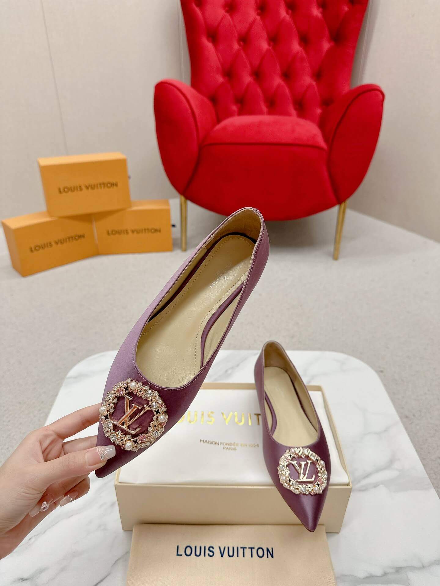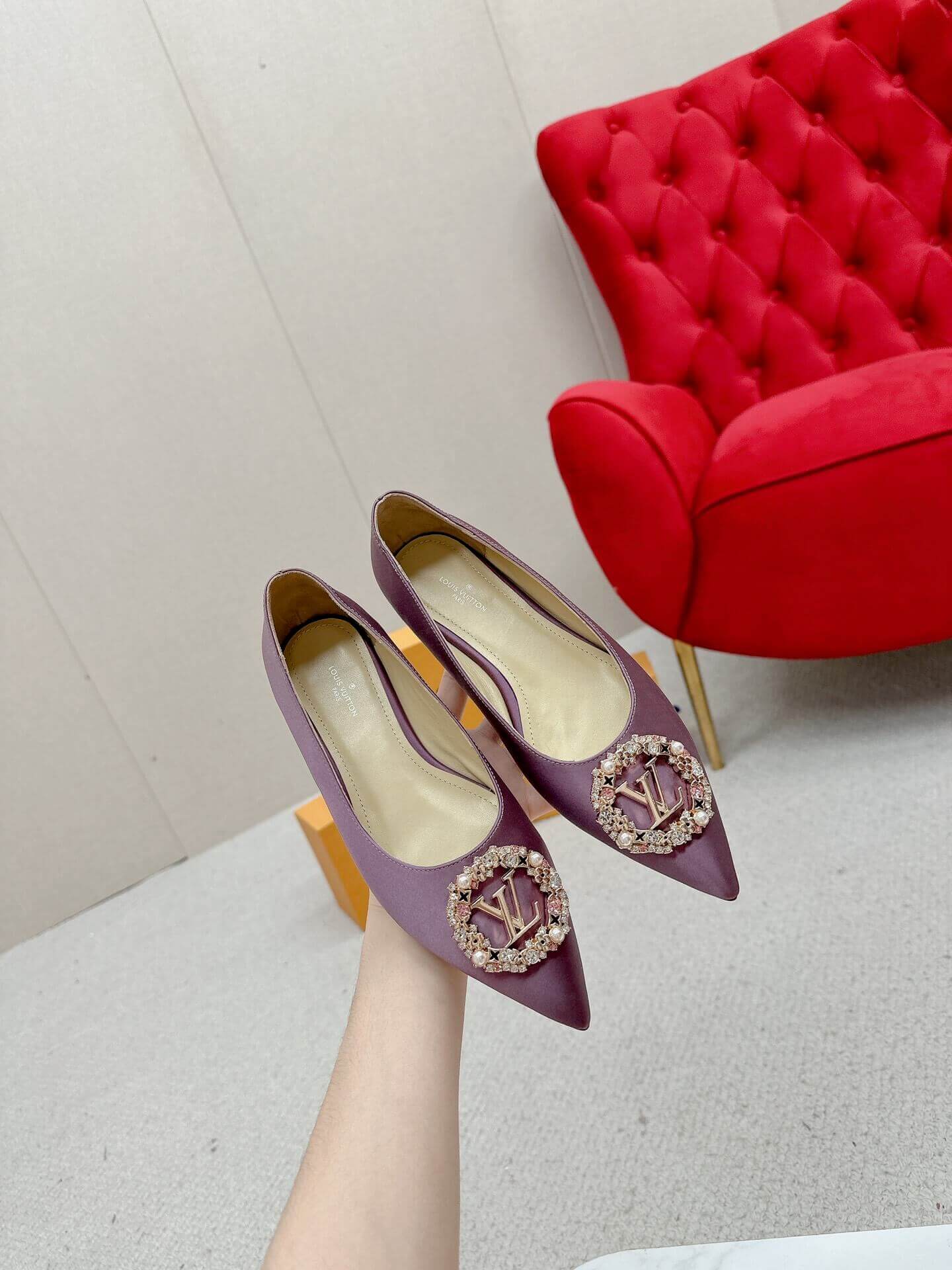 Bring a pop of glamour to your wardrobe with these Louis Vuitton-Inspired Satin Jeweled Flats. Designed with a pointed toe and finished with a crystal-embellished LV-style brooch, they’re perfect for weddings, evening wear, or elevating your everyday look. The soft satin fabric and classic silhouette combine comfort and elegance in a timeless design that stands out effortlessly.