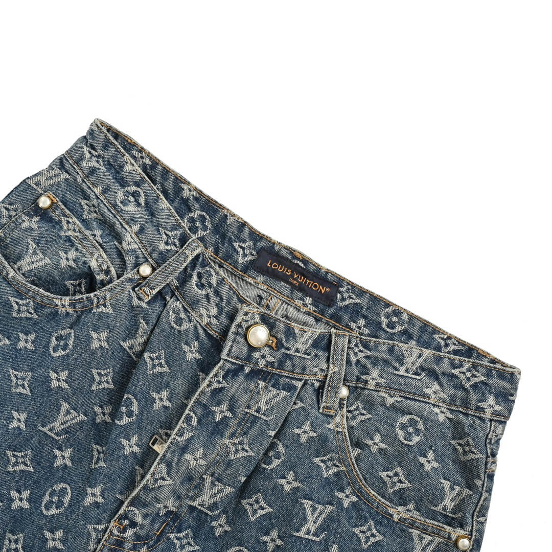 These Louis Vuitton Jacquard Monogram Denim Jeans offer a luxurious take on classic denim. Crafted from 480g denim, they feature a breathable and comfortable design, even after washing. The meticulously aligned monogram pattern creates a striking visual effect, reminiscent of the iconic Y2K aesthetic.