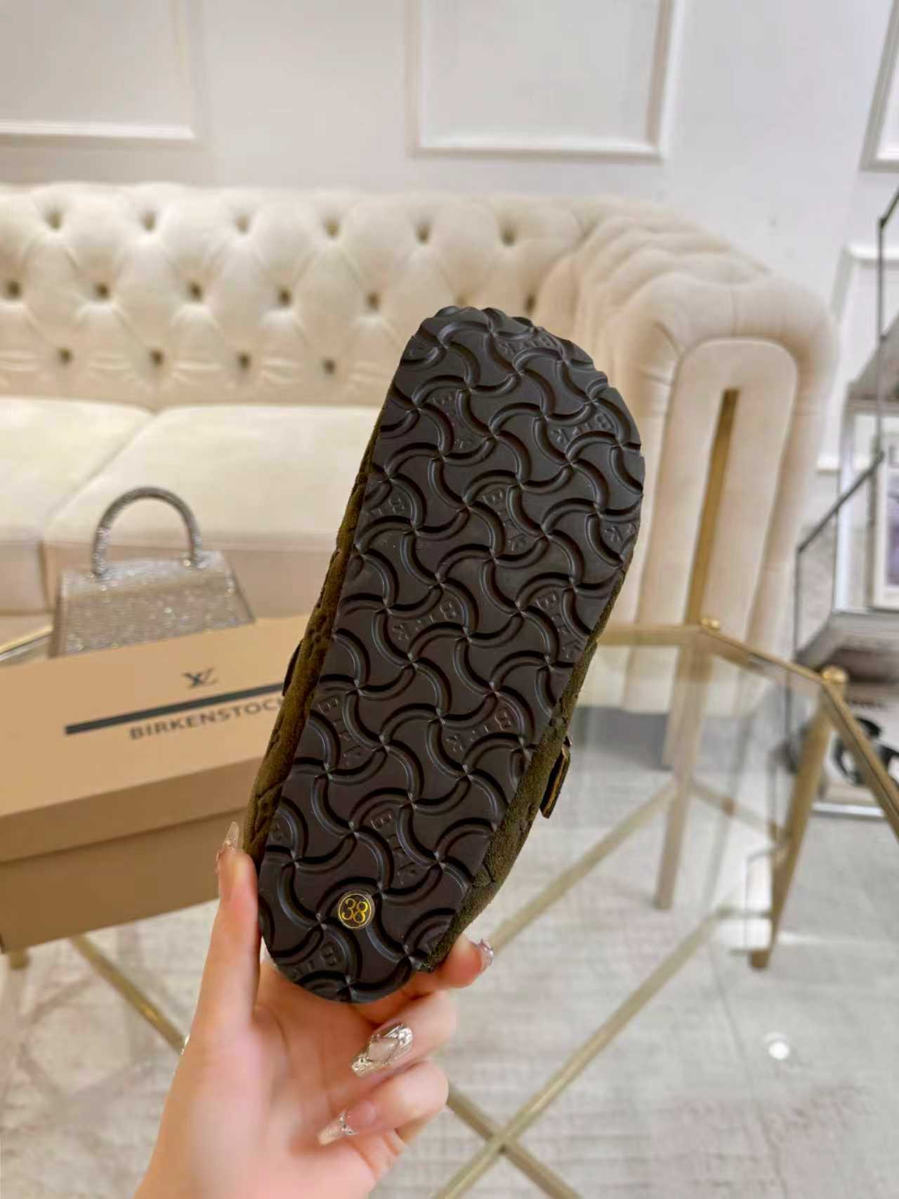 The Louis Vuitton Khaki Green LV Cosy Flat Comfort Clog is a luxurious fusion of heritage craftsmanship and everyday ease. Designed in collaboration with Birkenstock, this clog captures refined leisure with its plush materials and iconic design details.