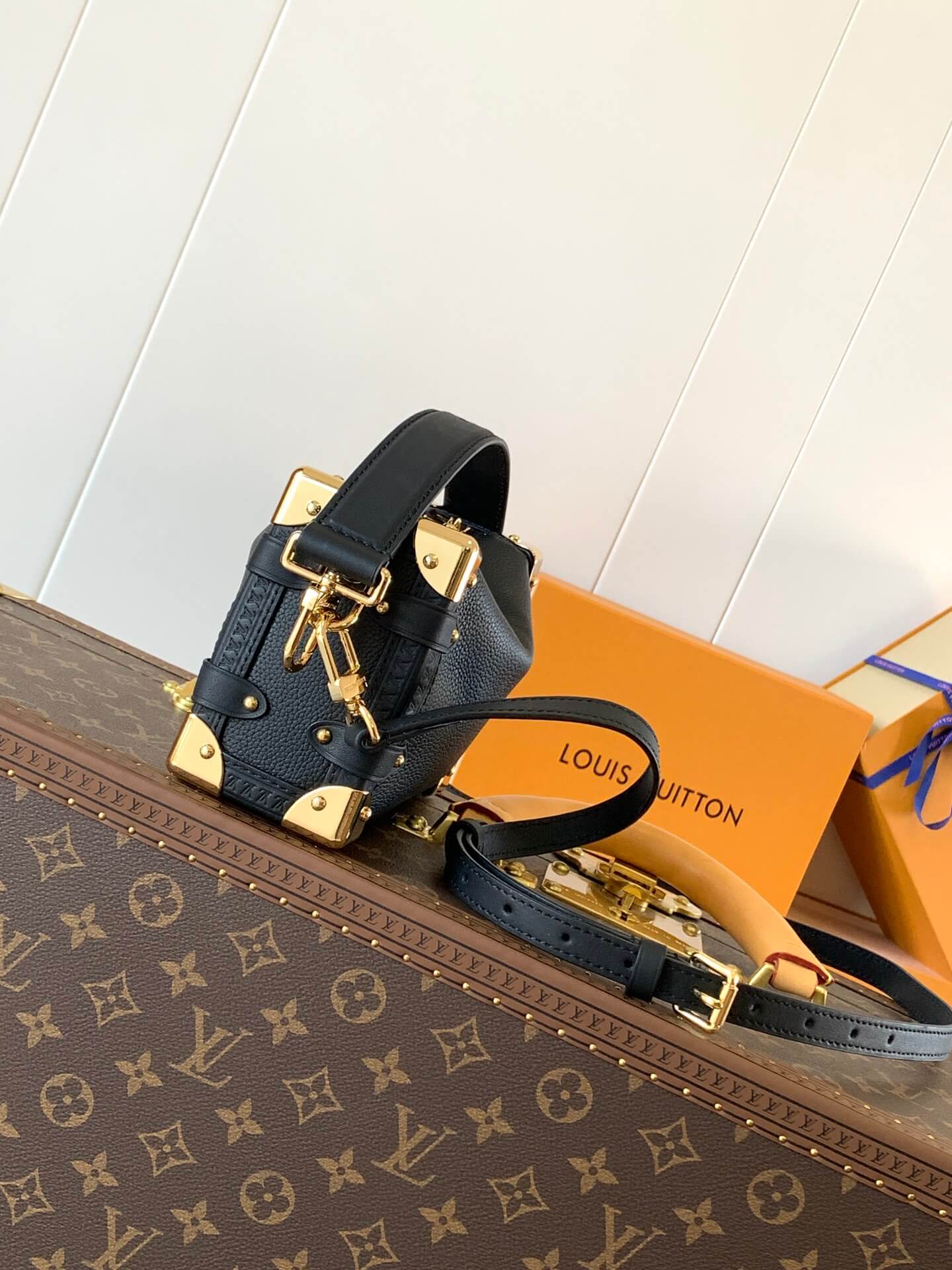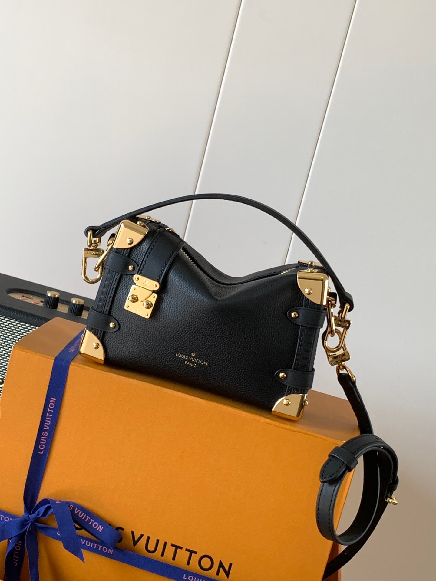 A bold tribute to Louis Vuitton’s rich trunk-making heritage, the Side Trunk PM in Black is the epitome of sophistication. Crafted from luxurious grained calf leather with smooth cowhide-leather trim, this compact yet spacious handbag showcases gold-tone metallic accents, reinforced corners, and an iconic S-lock closure.