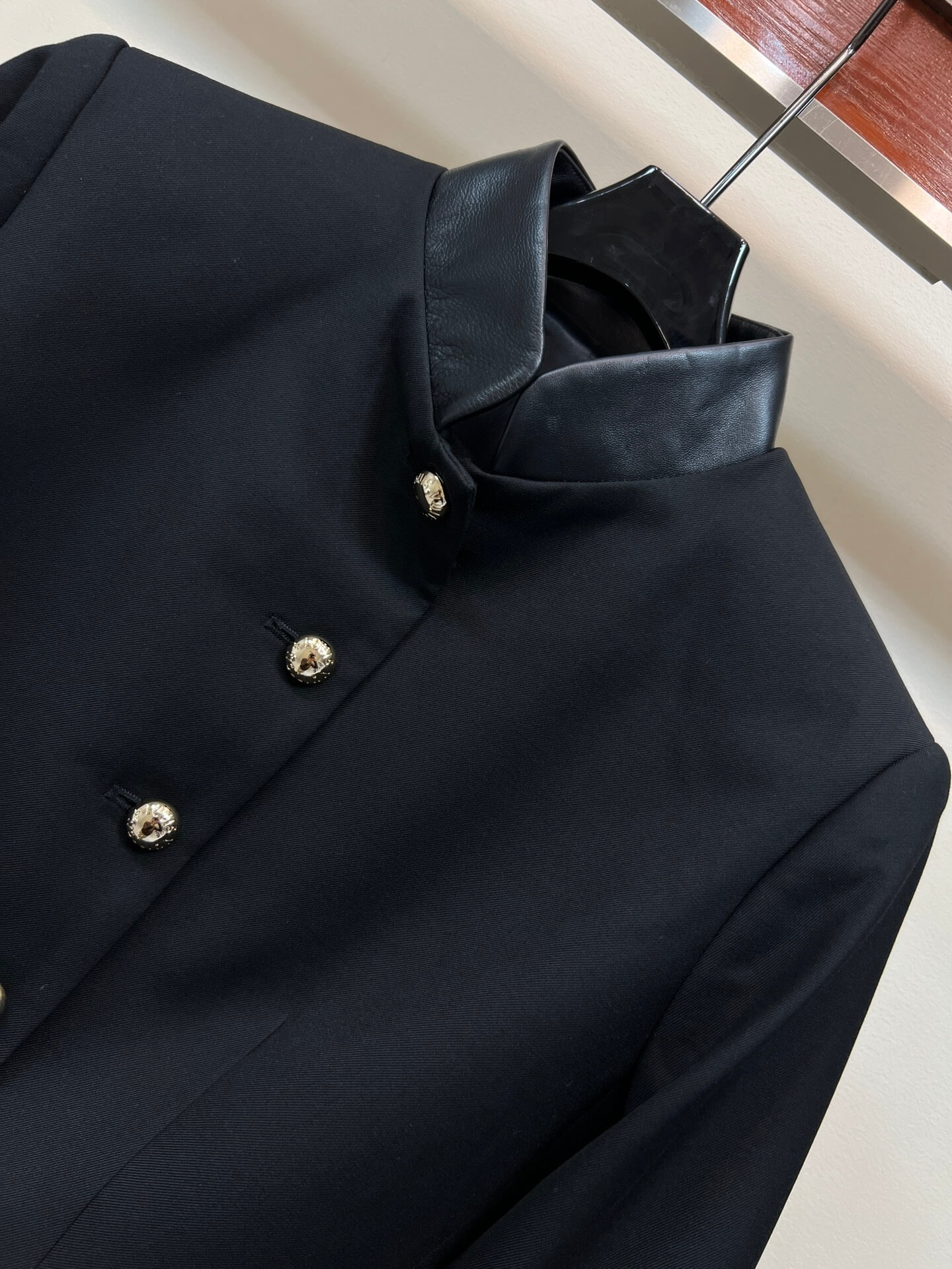 Leather stand-up collar for contrast and elevated detailing