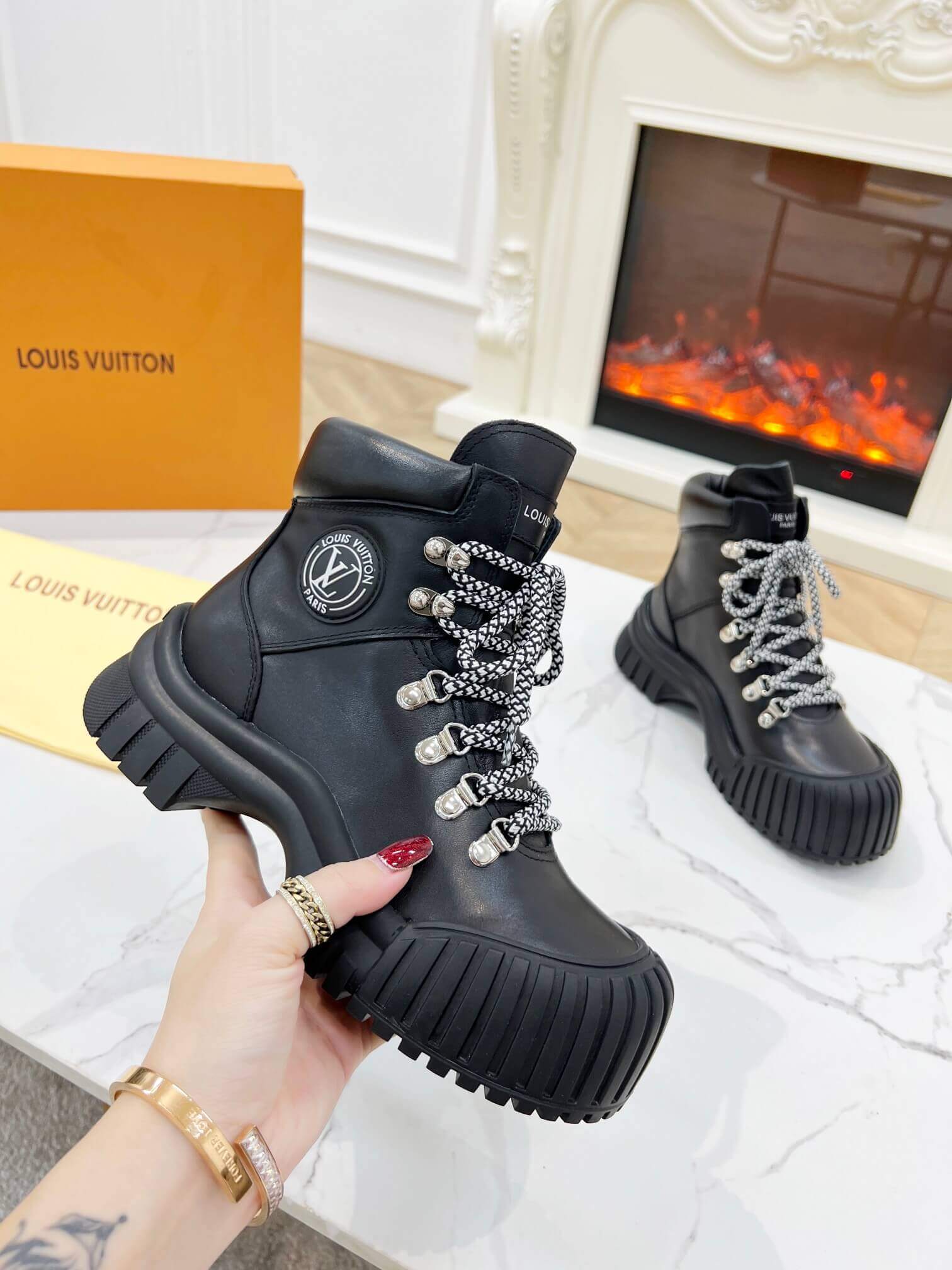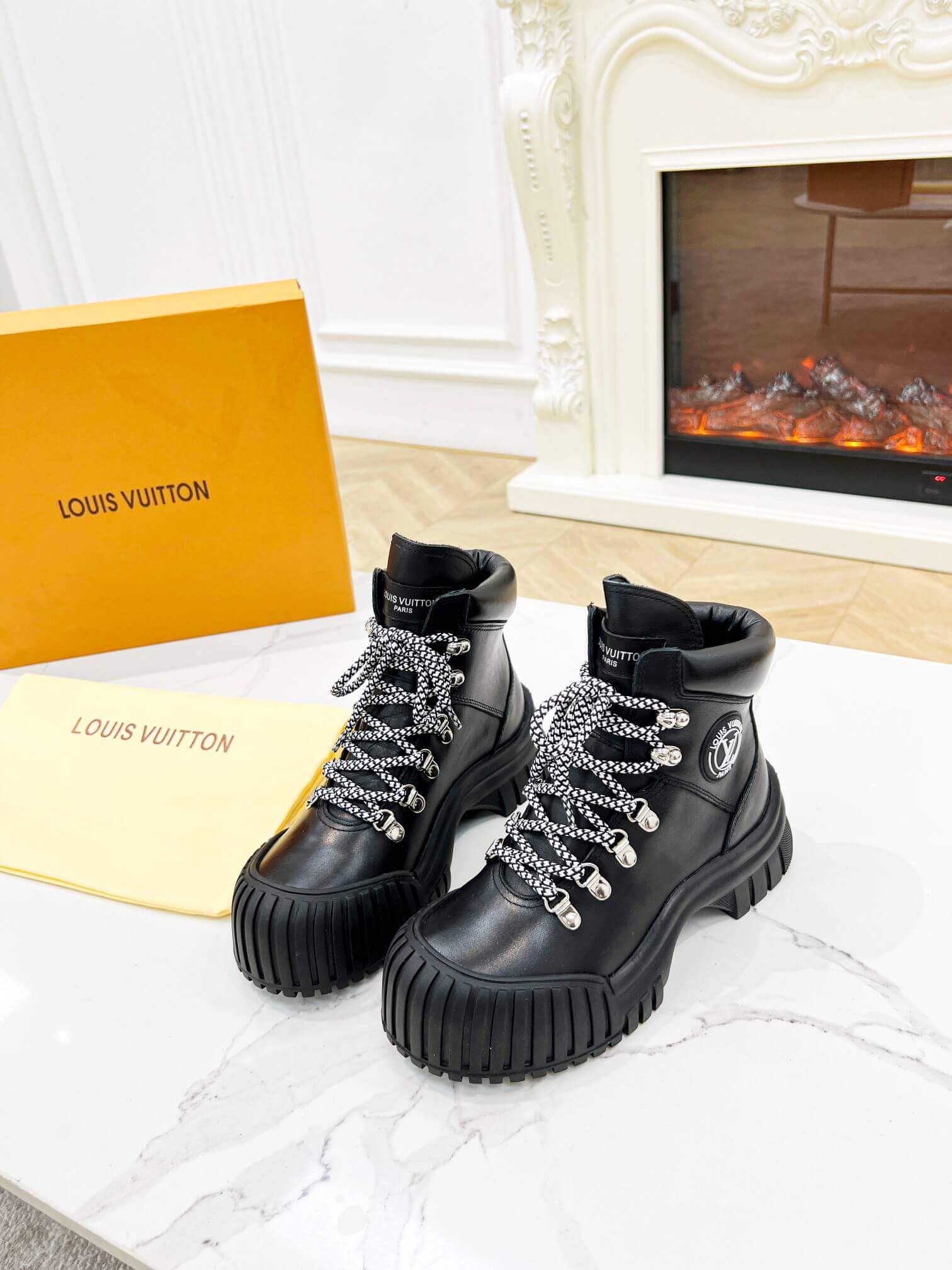 Embrace audacious style with the Louis Vuitton LV Ranger Boot. This robust lace-up boot boasts a sophisticated black leather upper, complemented by striking black and white patterned laces and a bold, chunky black rubber outsole. A powerful reinterpretation of a classic combat boot, it combines signature style with a commanding presence, perfect for making a definitive statement.