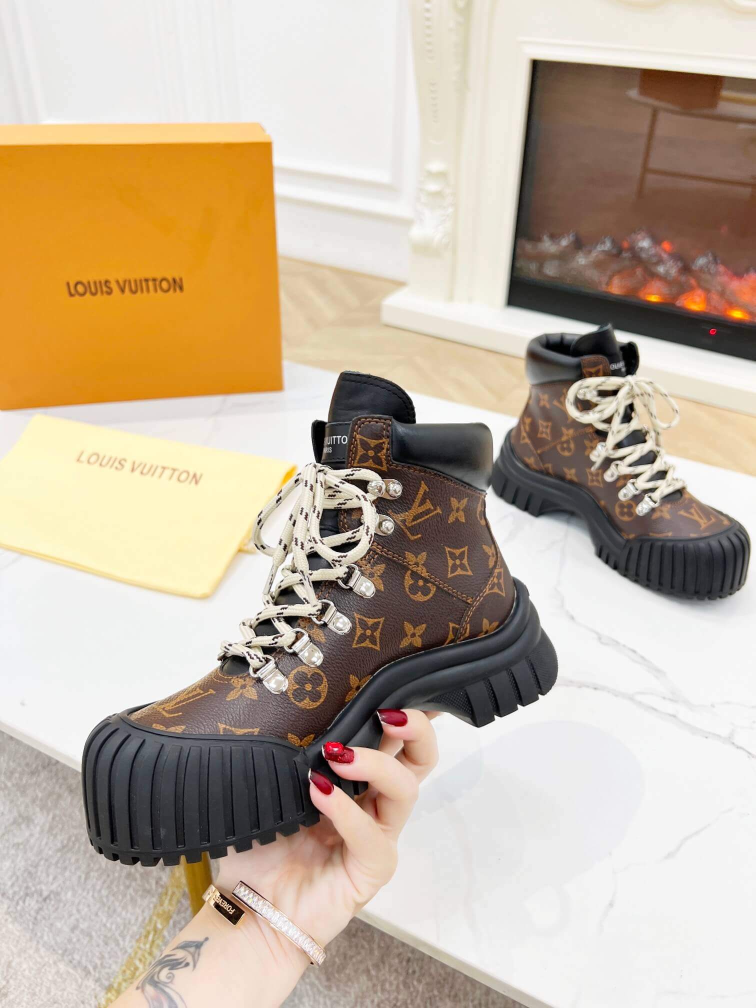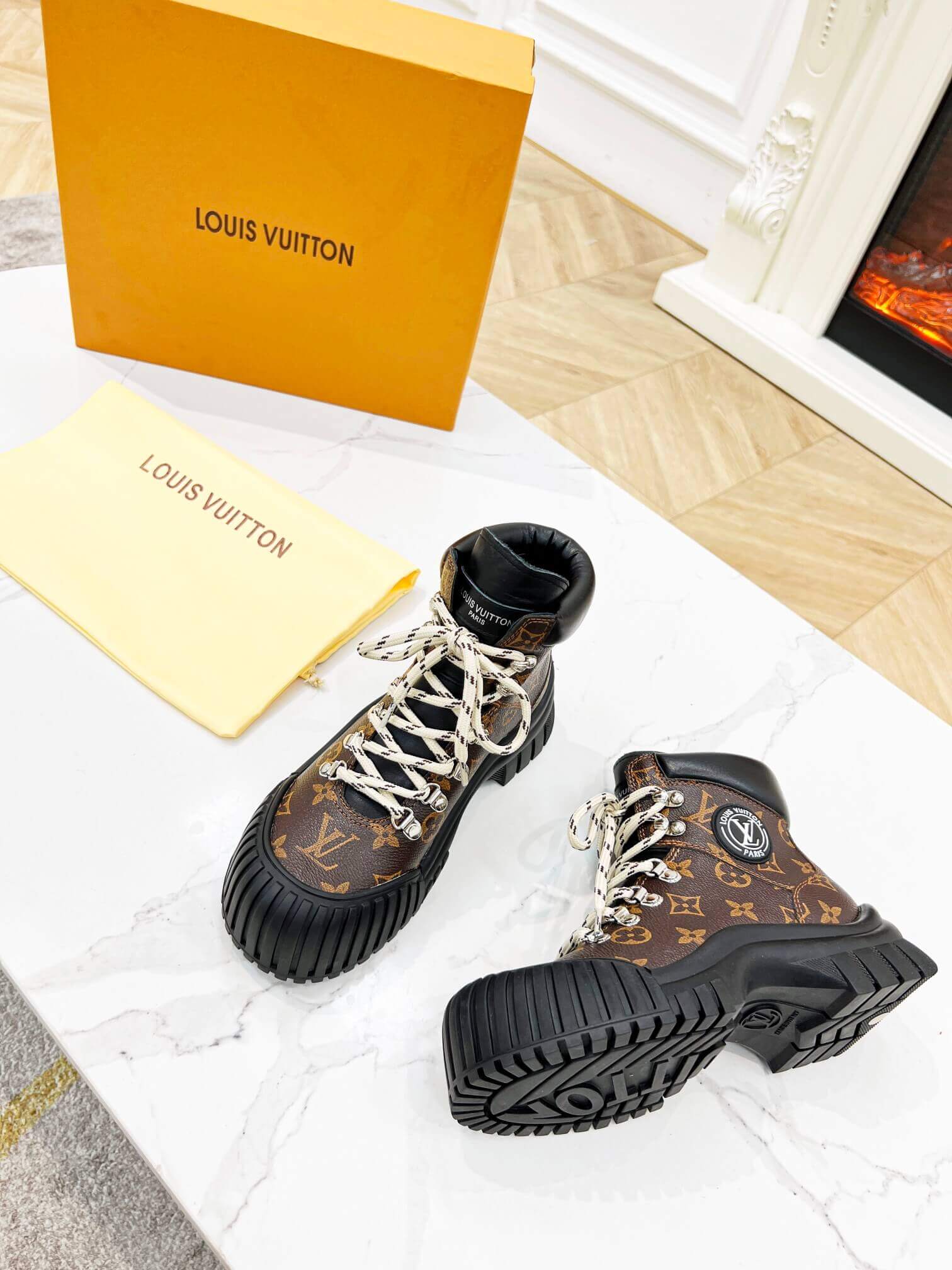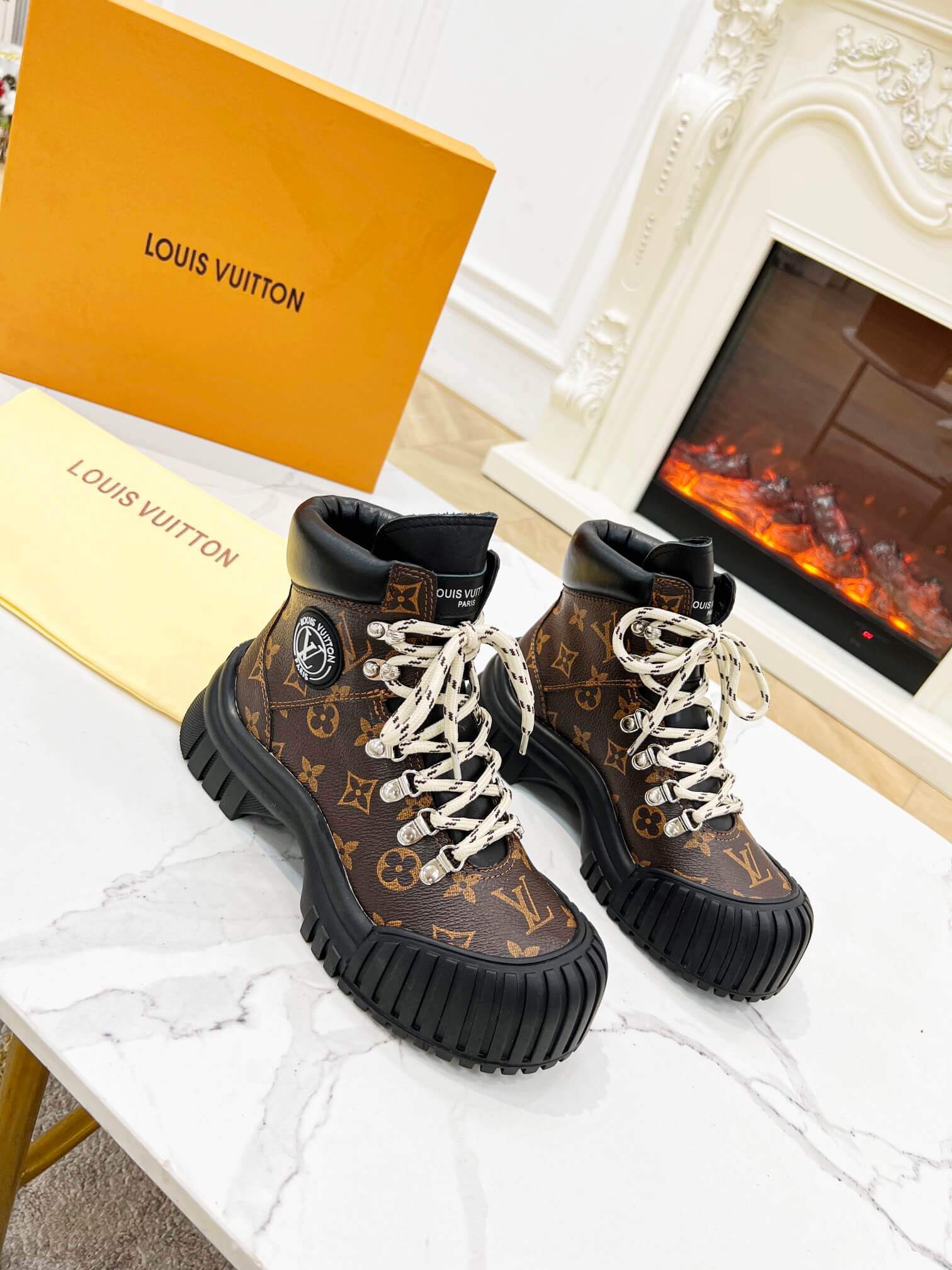 Conquer urban landscapes with the iconicLouis Vuitton LV Ranger Boot. This robust lace-up boot showcases the timeless brown Monogram canvas, perfectly complemented by contrasting white laces and a distinctive chunky black rubber outsole. A powerful reinterpretation of a classic combat boot, it combines signature style with a commanding presence, perfect for making a definitive statement. A bold reinterpretation of a classic combat boot, it combines signature style with a powerful silhouette, ready for any adventure.