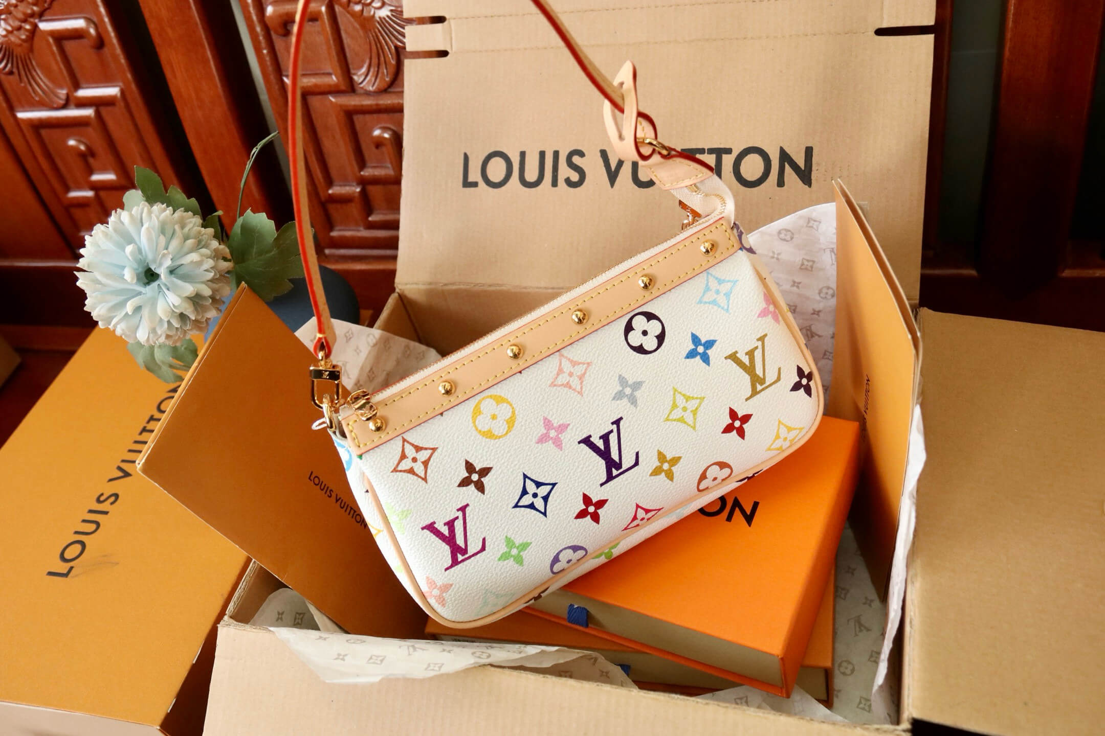 Embrace playfulness and luxury with the LV x Murakami TM Mini Pochette Accessoires in white multicolor Monogram canvas. This iconic collector’s piece blends Takashi Murakami’s artistic vision with Louis Vuitton’s timeless charm, creating a statement mini bag that elevates any look.
