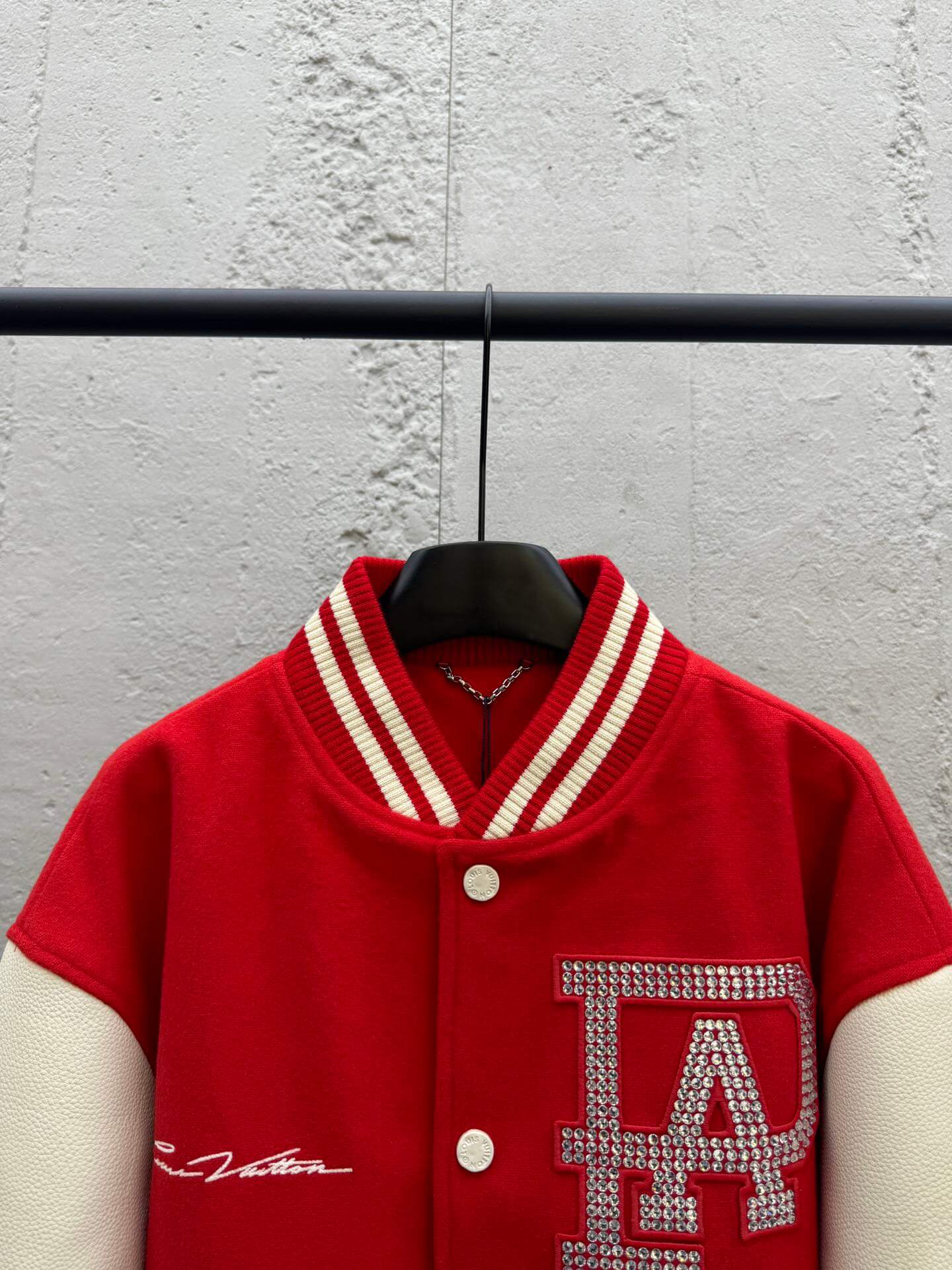 The varsity jacket features intricate embroidery, including the signature Louis Vuitton monogram on the sleeves and a unique “FA” design on the front. The pearl-embroidered “FA” letters add a touch of glamour, while the tonal Damier pattern on the sleeves showcases the brand’s iconic motif.