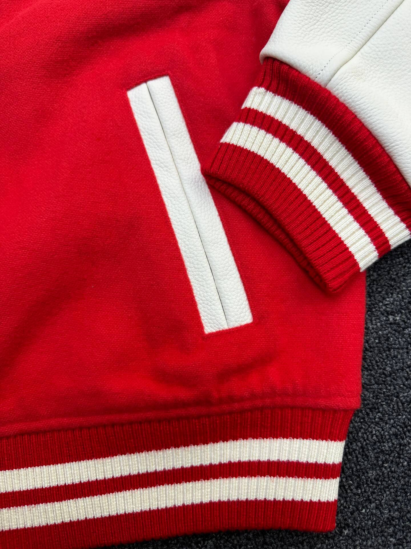 The ribbed cuffs and hem, along with the piped pockets in contrasting leather, add a sporty yet sophisticated touch. The classic varsity silhouette is versatile and comfortable, making it a versatile piece for everyday wear or special occasions.