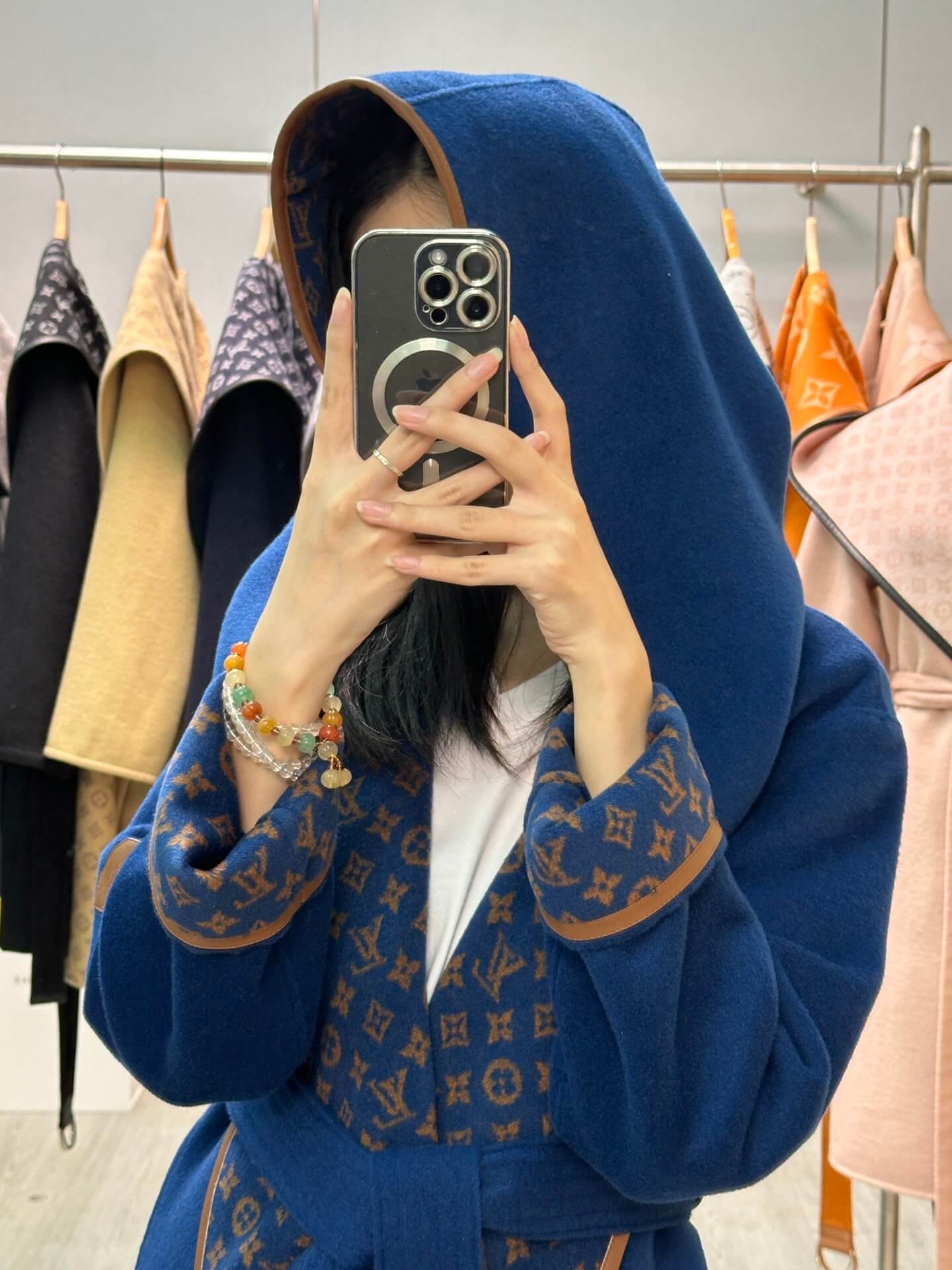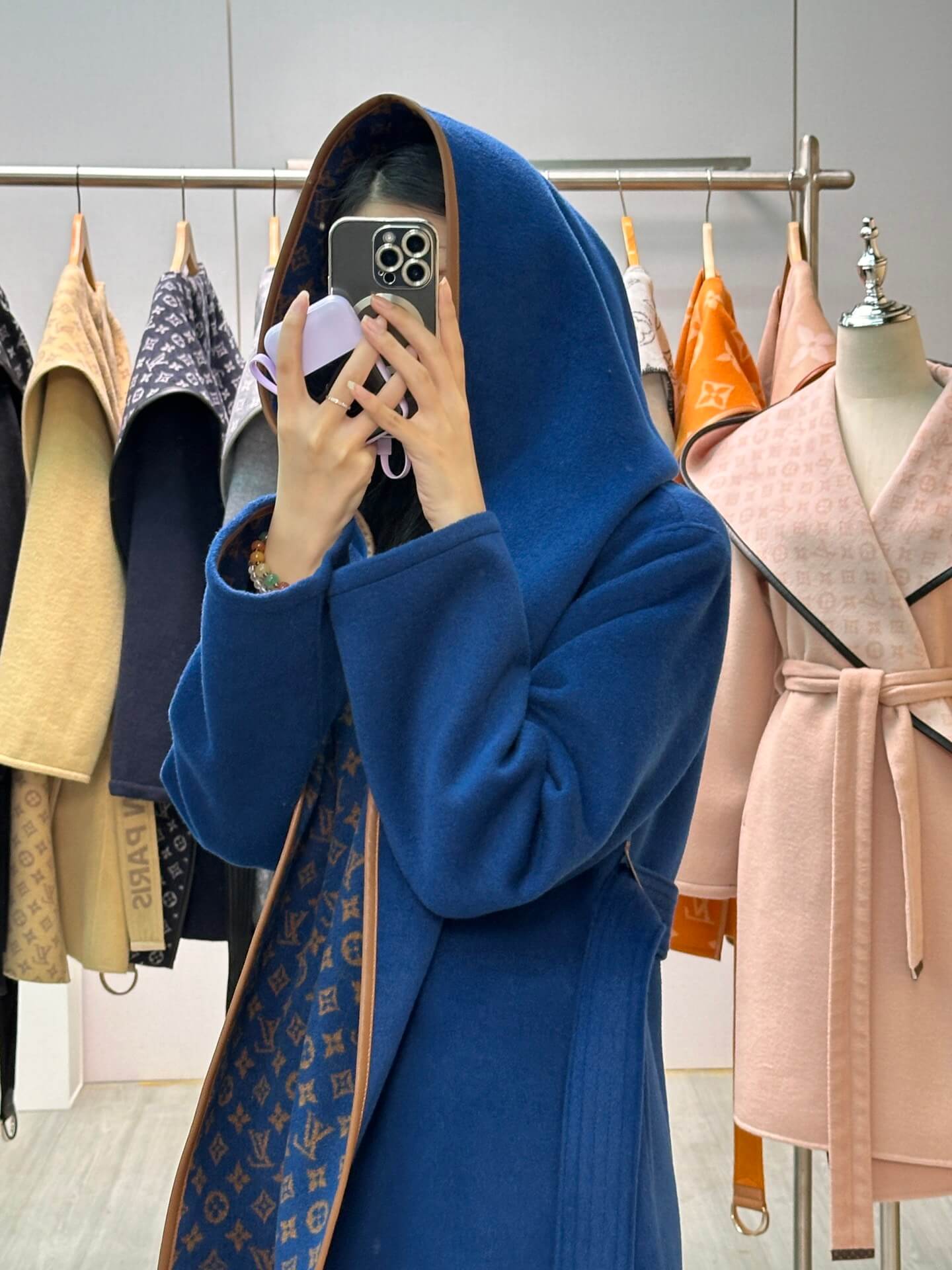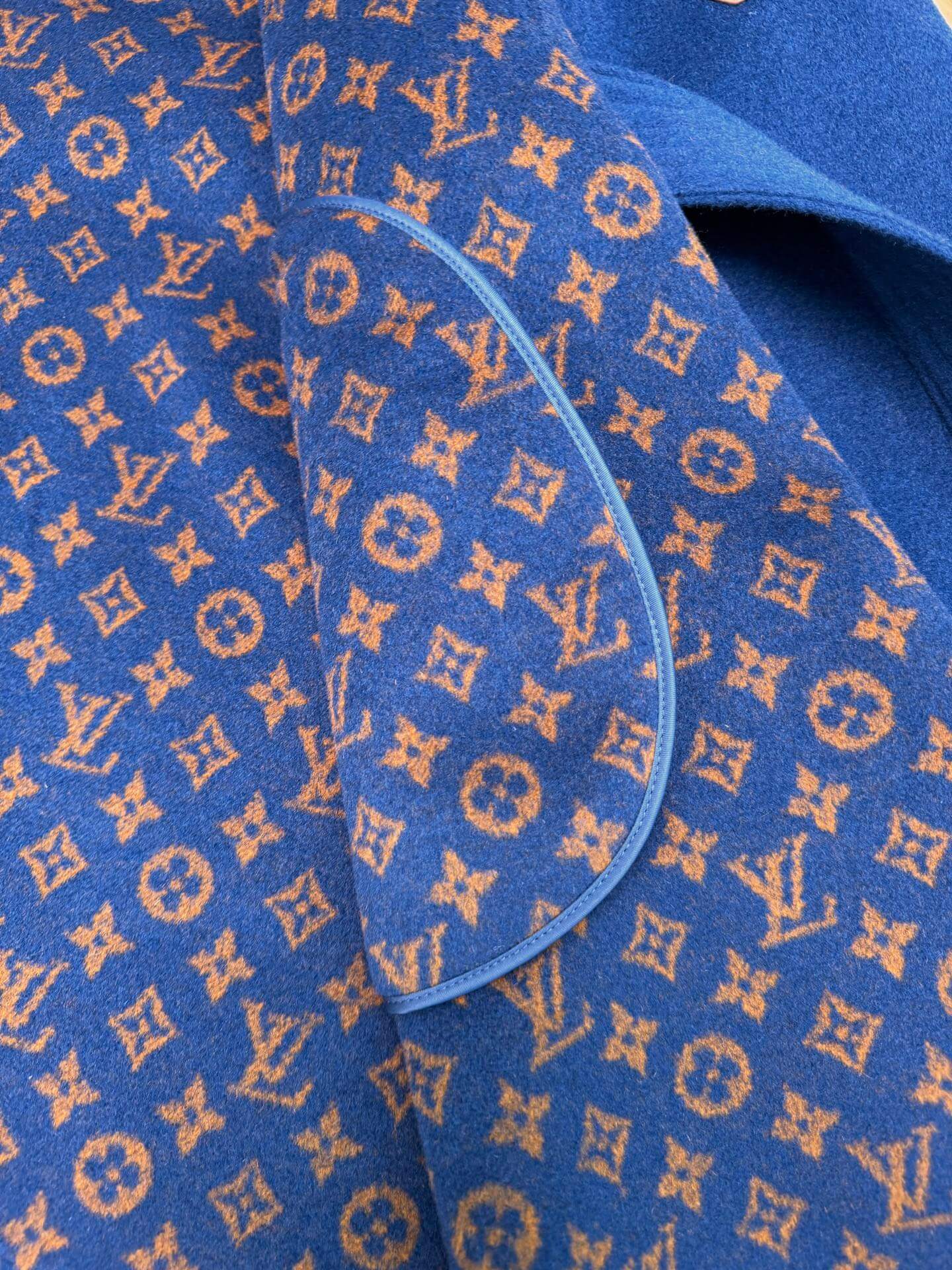 Drape yourself in timeless allure with this royal blue Louis Vuitton wrap coat. Featuring a double-faced design that reveals the iconic monogram in warm brown tones, this belted piece blends heritage elegance with a modern silhouette. The exaggerated hood and sleek trim finish off the look with striking refinement.