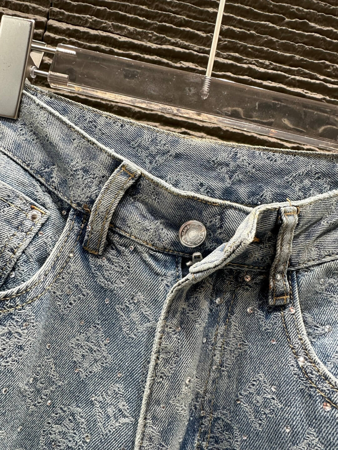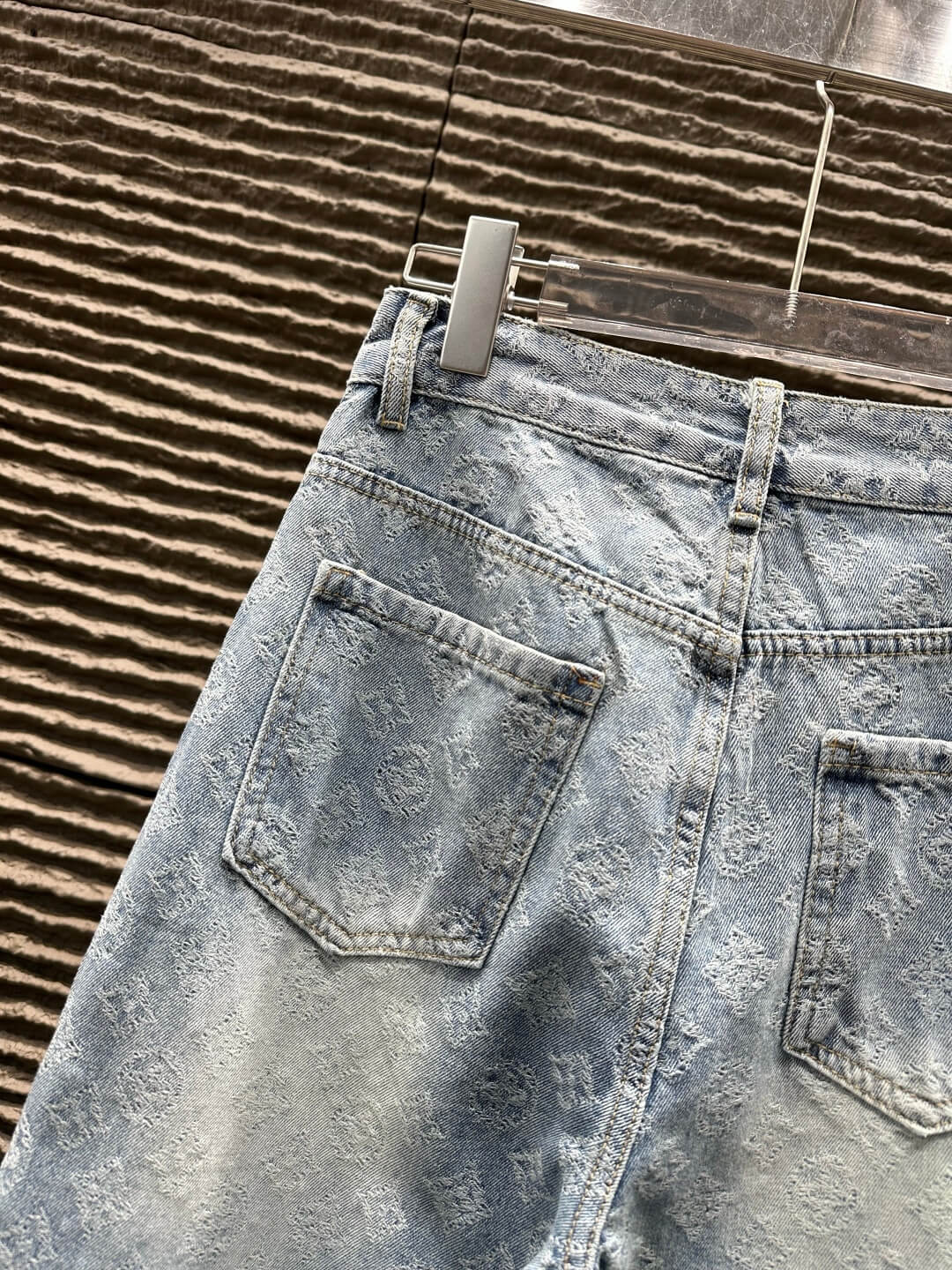 Crafted in light blue washed denim, these statement jeans feature an all-over LV monogram jacquard pattern subtly woven into the fabric, creating depth, texture, and unmistakable brand presence. The heavy-duty hot-stamping technique enhances the detailing, while the vintage-inspired faded wash adds dimension and a worn-in, high-fashion aesthetic.