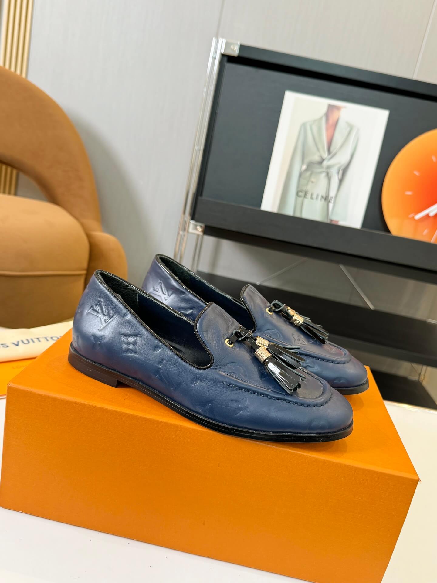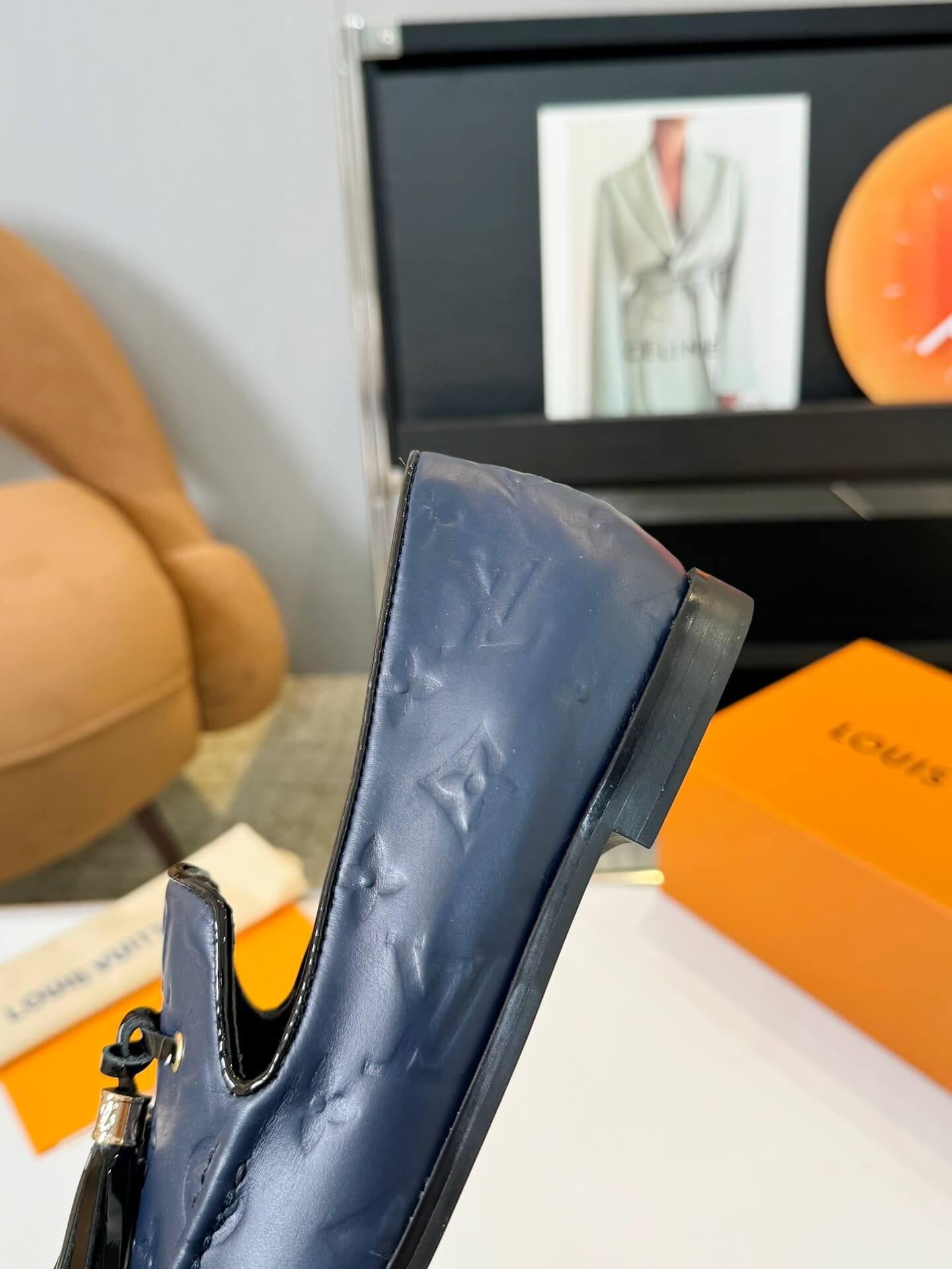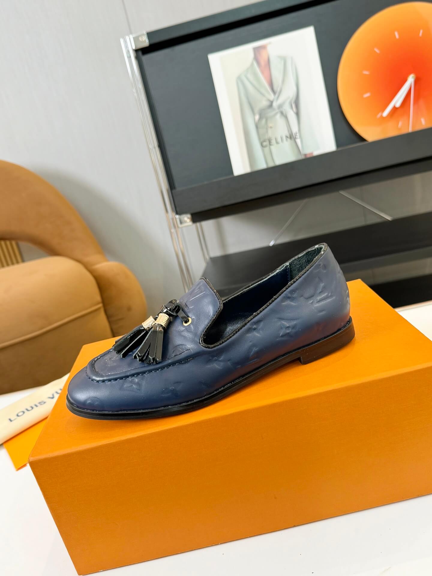 Elevate your wardrobe with the Louis Vuitton Monogram Society Loafers, a statement of refined elegance and timeless sophistication. Crafted in supple navy blue leather with an embossed monogram pattern, these loafers feature exquisite tassel detailing with gold-tone accents, adding a touch of effortless glamour. The sleek slip-on silhouette ensures all-day comfort, while the luxurious craftsmanship speaks to the heritage of Louis Vuitton. Whether paired with tailored trousers or a chic dress, these loafers offer a polished finishing touch to any ensemble.