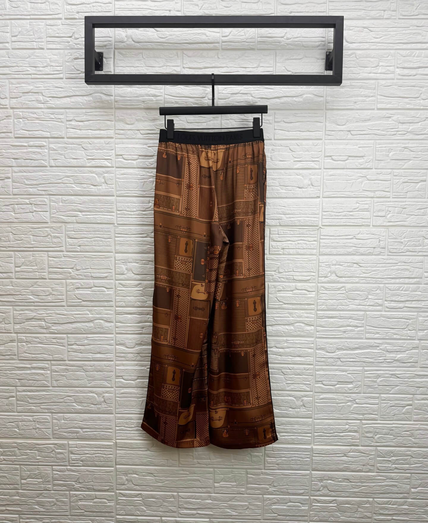 This silk skirt is a modern interpretation of classic travel-inspired motifs, featuring an all-over monogram trunk print that nods to Louis Vuitton’s iconic heritage. The flowing, relaxed silhouette is balanced by a tailored waistband, offering a flattering fit and fluid movement. Crafted in a luxurious silk blend, it transitions seamlessly from spring to summer, with a print that feels both nostalgic and fresh. The versatile brown tones and monogram pattern make it the perfect statement piece for casual elegance or elevated day-to-night styling.