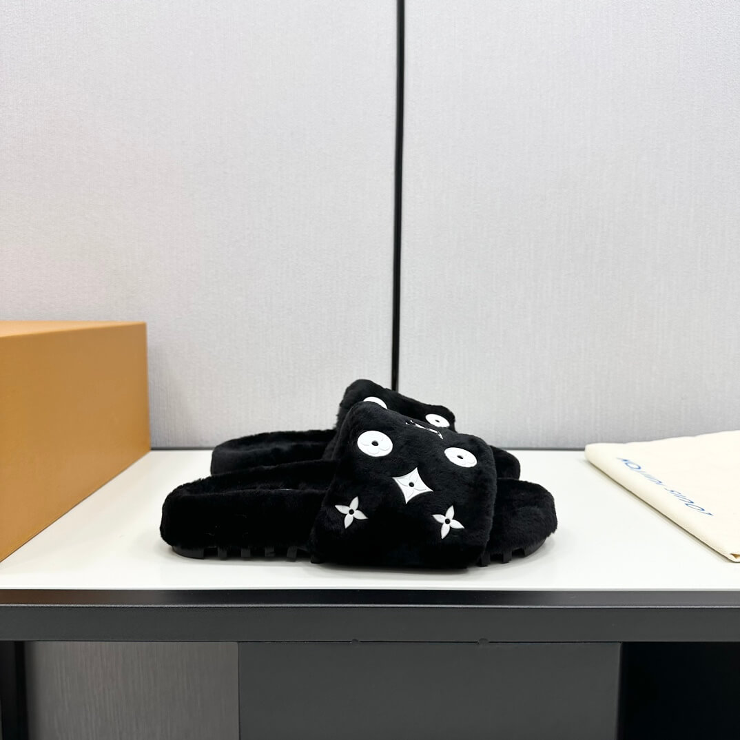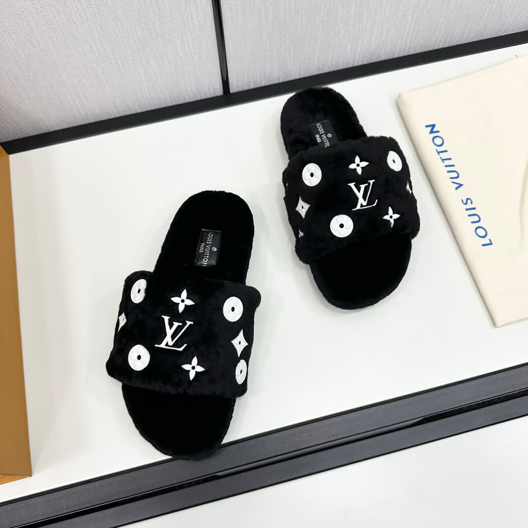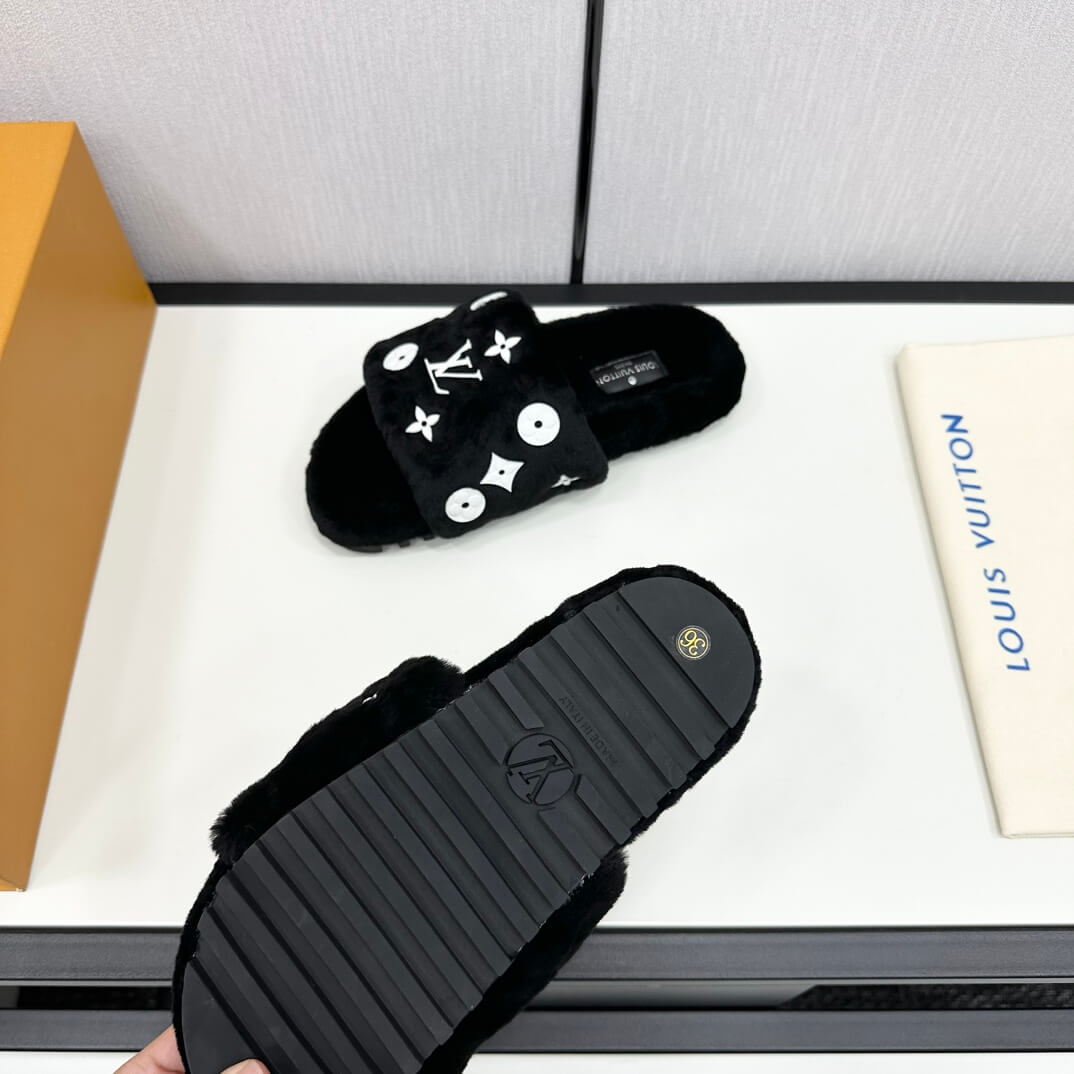 Wrap your feet in ultimate luxury with the Louis Vuitton Monogram Wool Slippers in black. These ultra-cozy slippers feature plush wool construction, offering exceptional warmth and comfort. The signature LV monogram and floral motifs in contrasting white embroidery elevate the design, making them a stylish addition to your lounge wardrobe. Finished with a durable rubber outsole for effortless indoor and outdoor wear, these slippers blend fashion with functionality for the perfect statement piece.