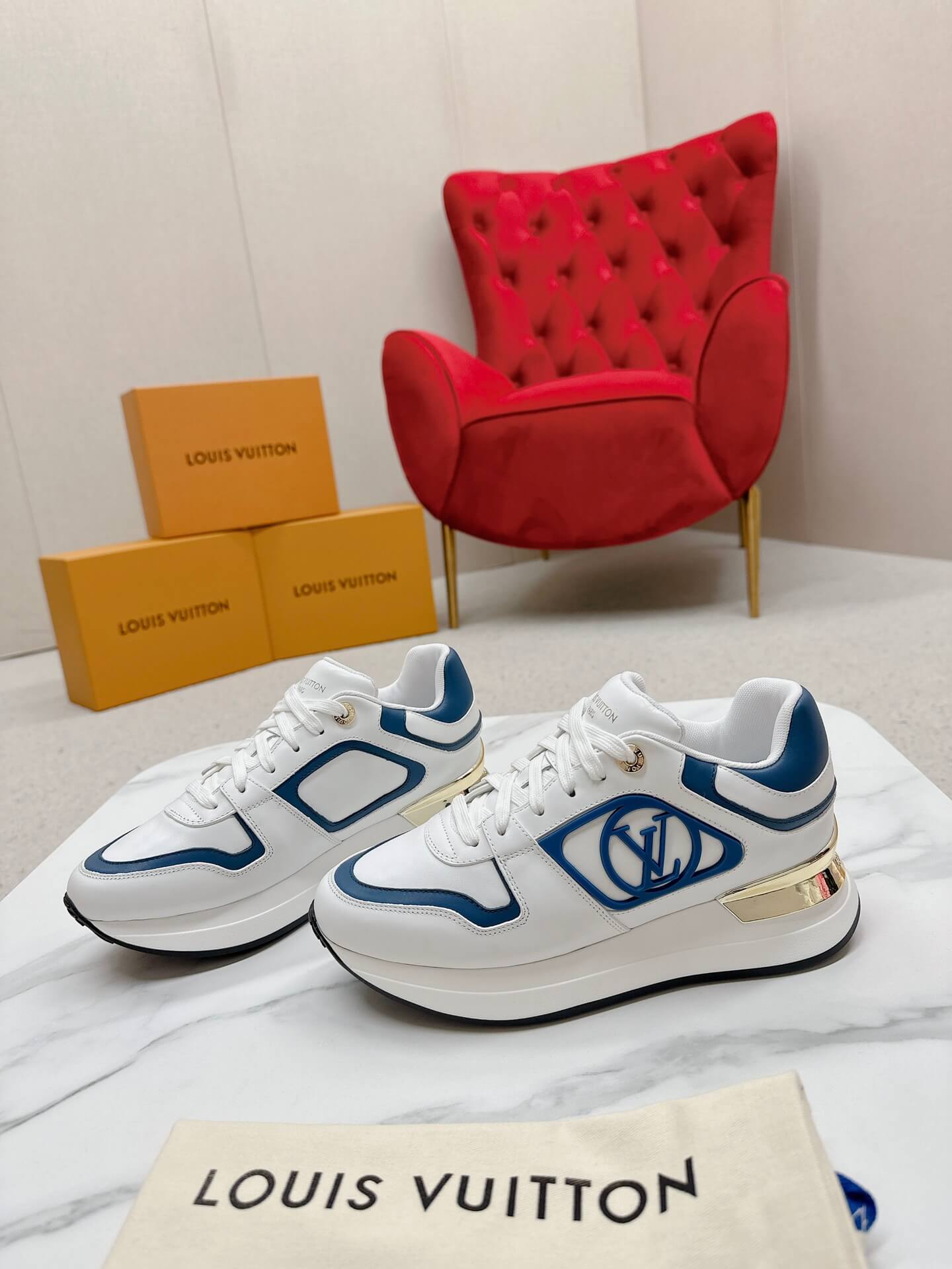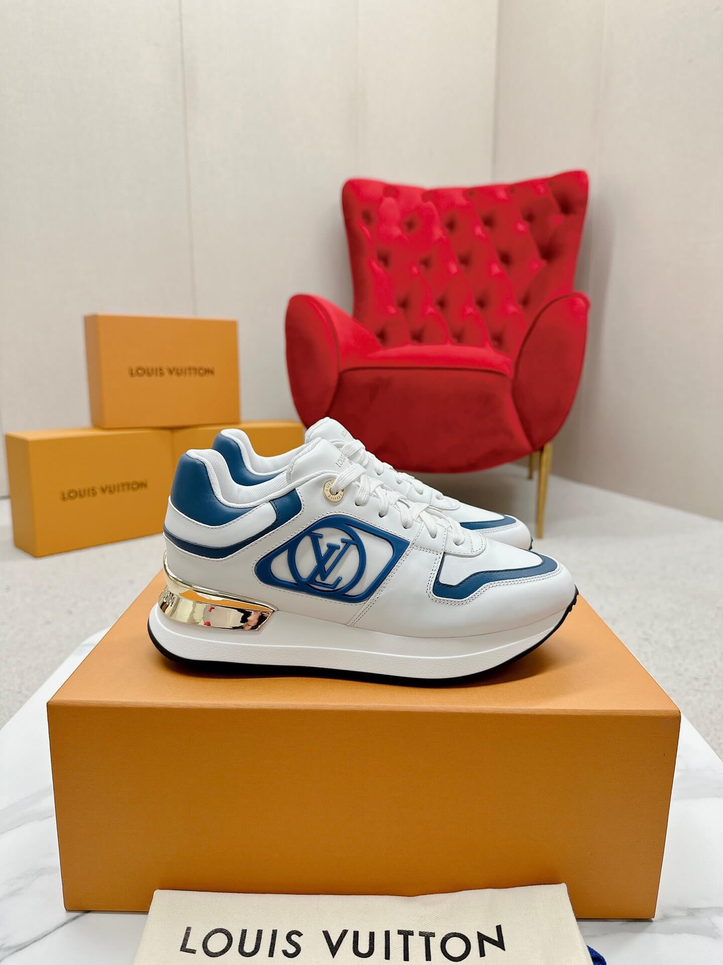 The Louis Vuitton Neo Run Away Sneaker in White/Blue, an updated version of the iconic Run Away, offers a sleek and contemporary design inspired by classic running shoes. Crafted from luxurious calf leather in a striking bicolor palette, this sneaker highlights its distinctive wedge-shaped outsole and signature Louis Vuitton details. Let these sneakers be a reflection of your dynamic lifestyle and appreciation for high-end design.
