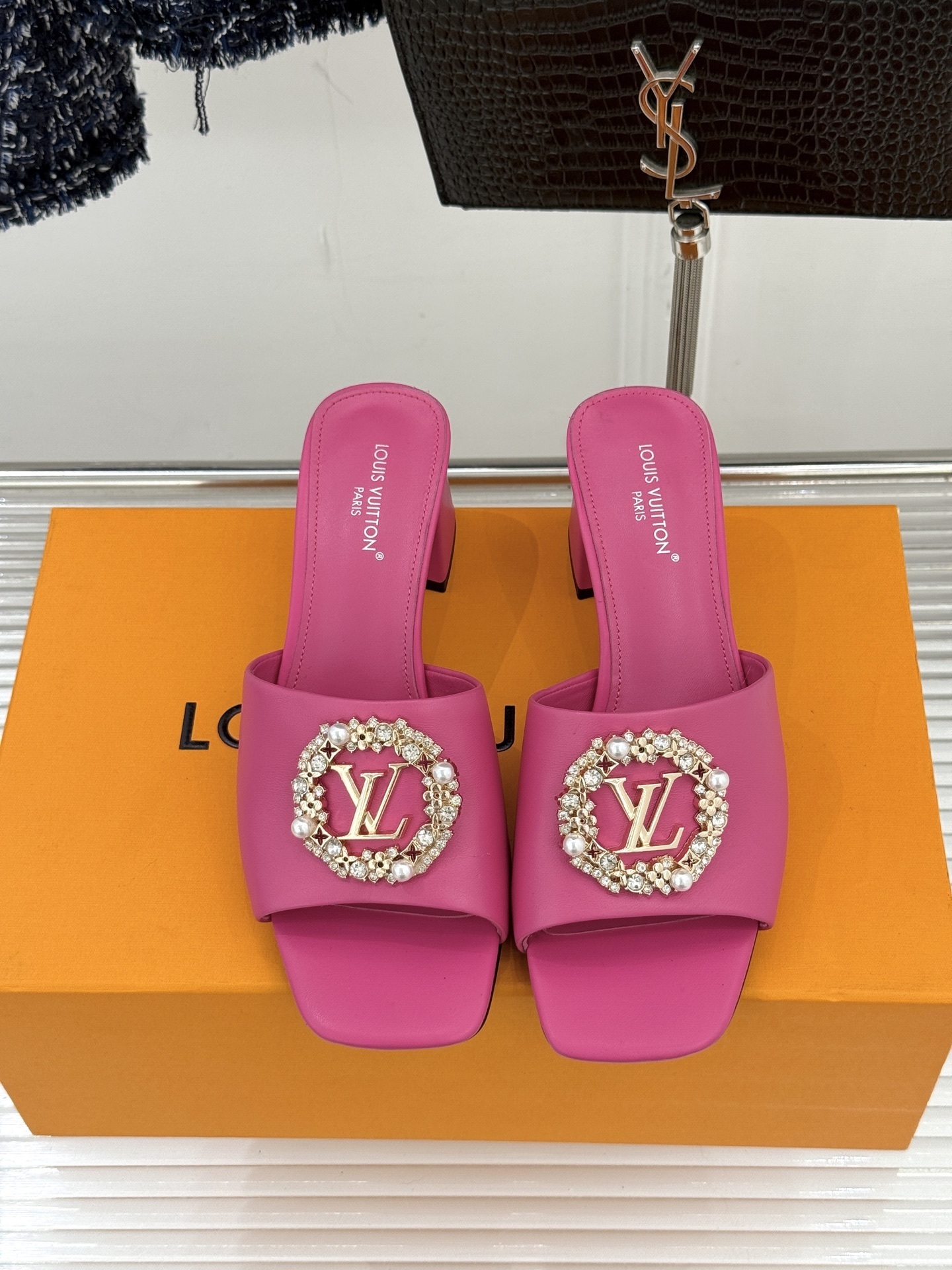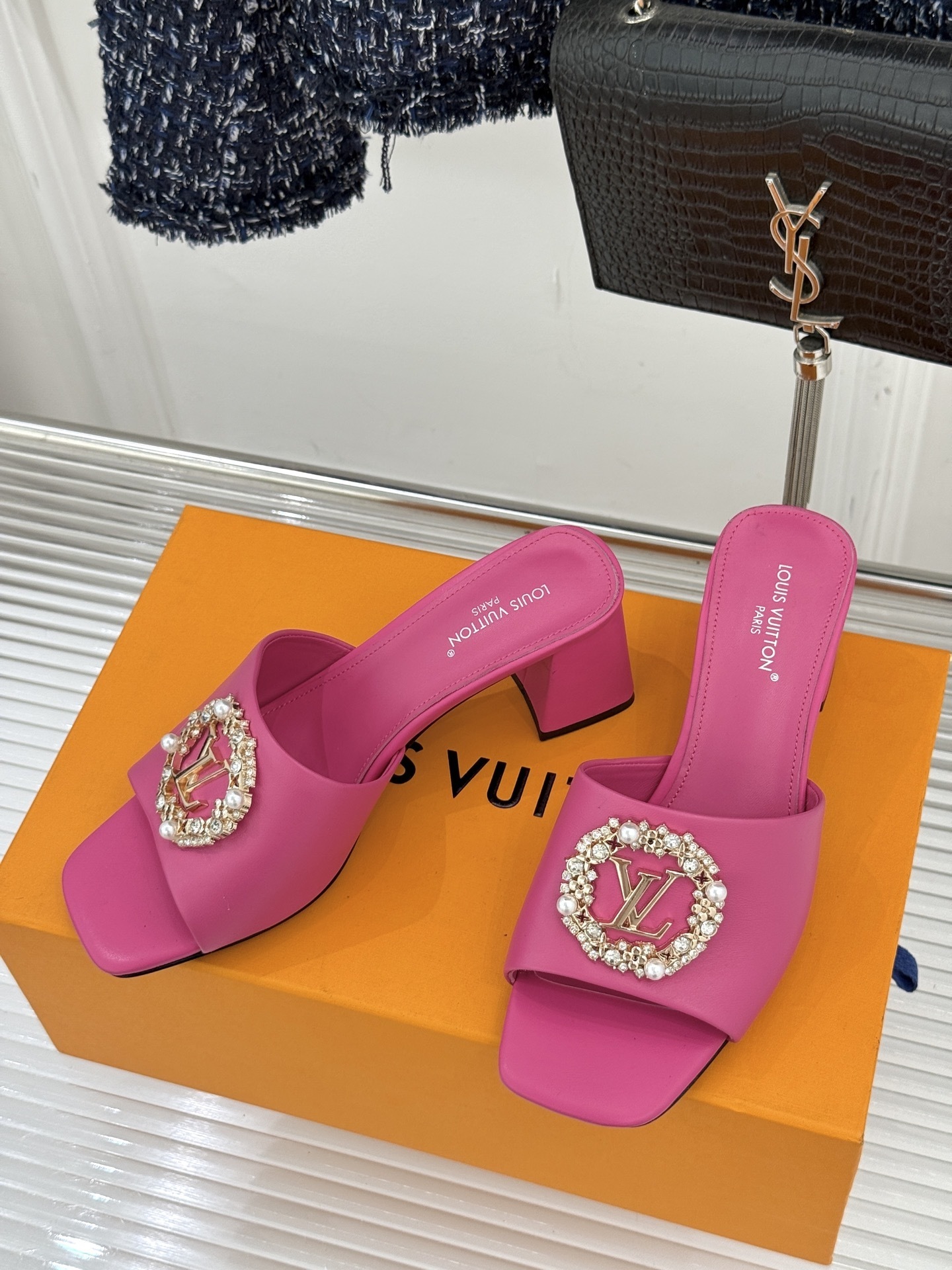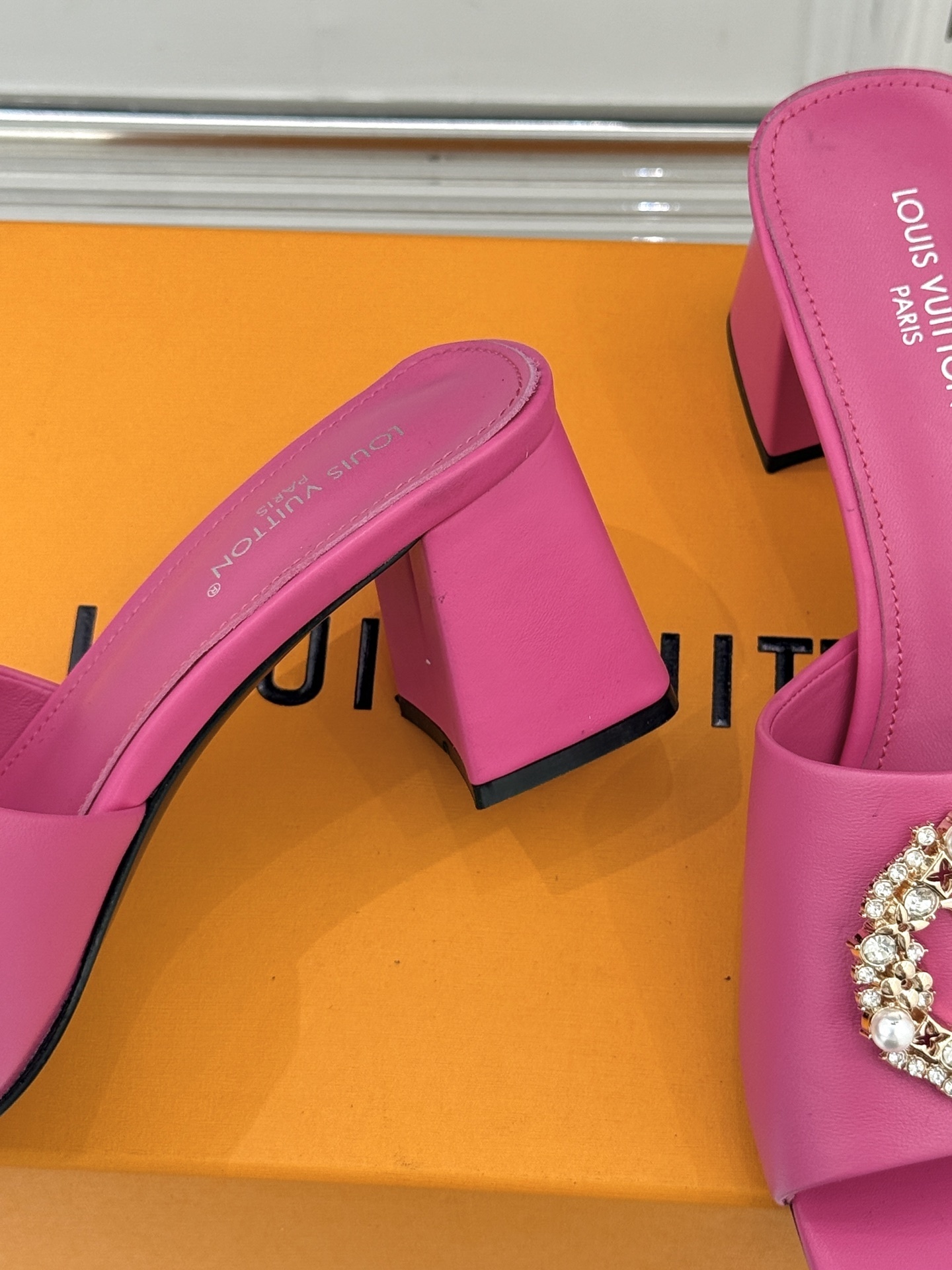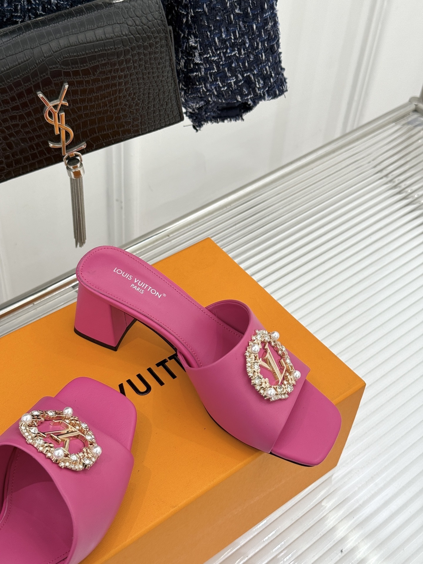 Design Features: Crystal-embellished LV logo, slip-on mule design, structured silhouette