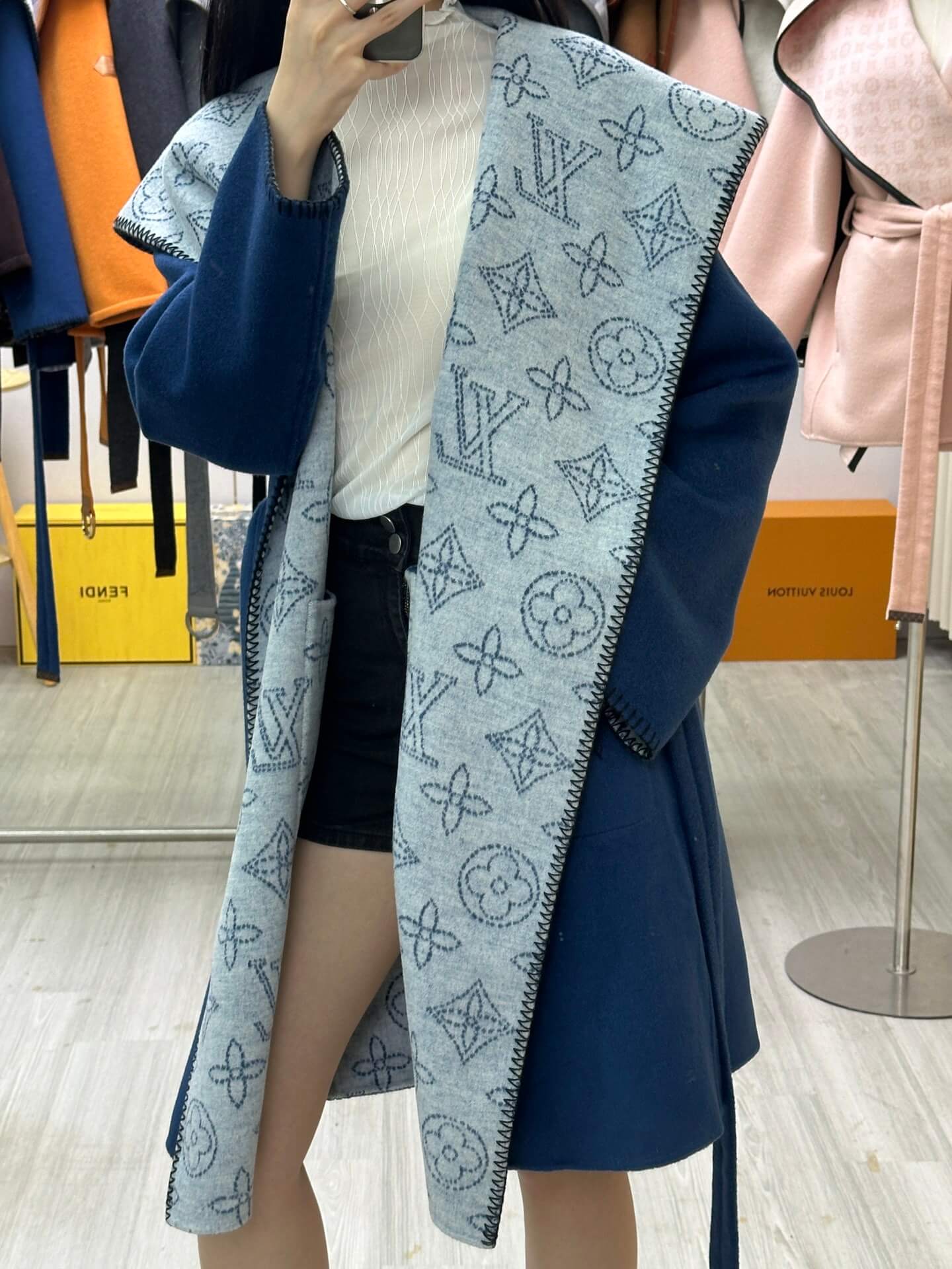 Drape yourself in pure luxury with the Louis Vuitton Reversible Monogram Hooded Wrap Coat. Crafted from an exquisite wool-cashmere blend, this coat is designed for effortless sophistication. The deep navy blue exterior exudes understated elegance, while the reversible monogram jacquard lining adds a touch of iconic LV heritage. A belted waist and oversized hood provide both warmth and a refined silhouette, making it the perfect statement piece for cool-weather layering.