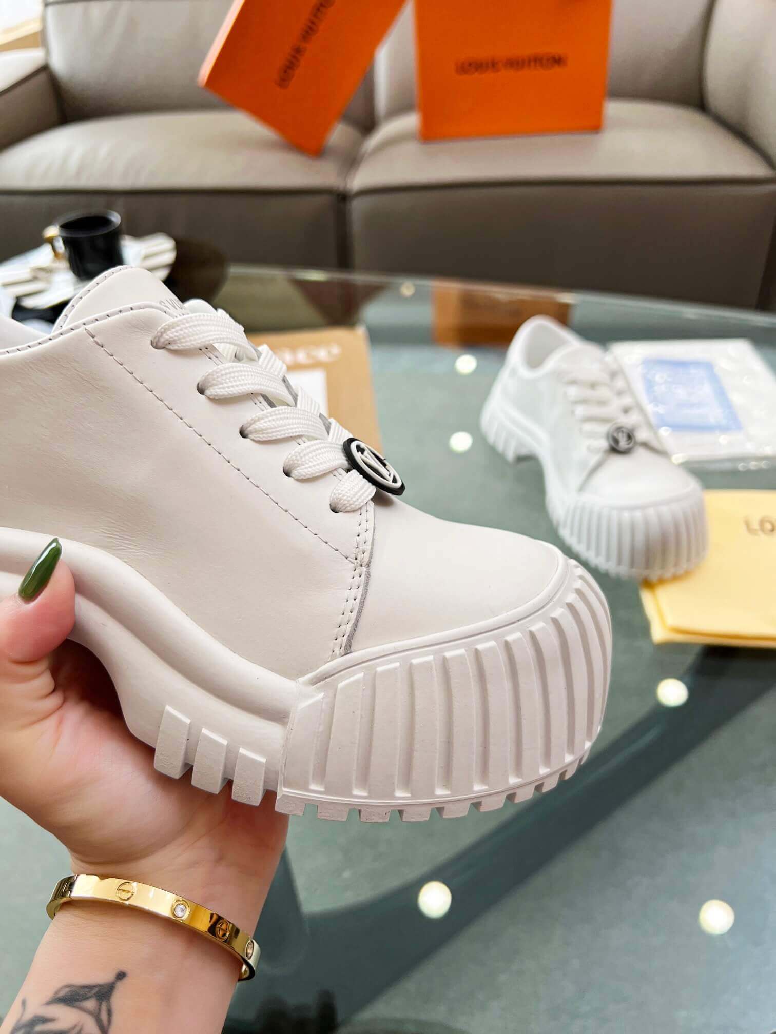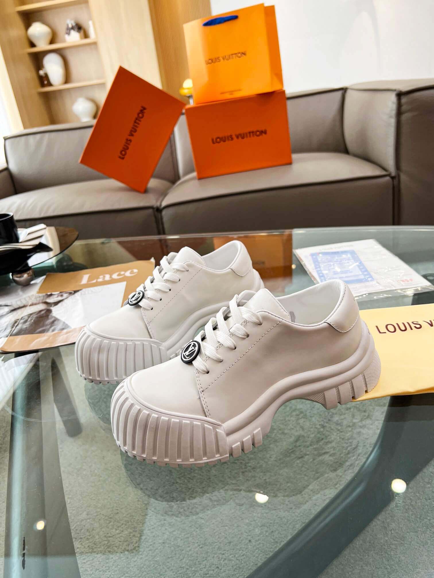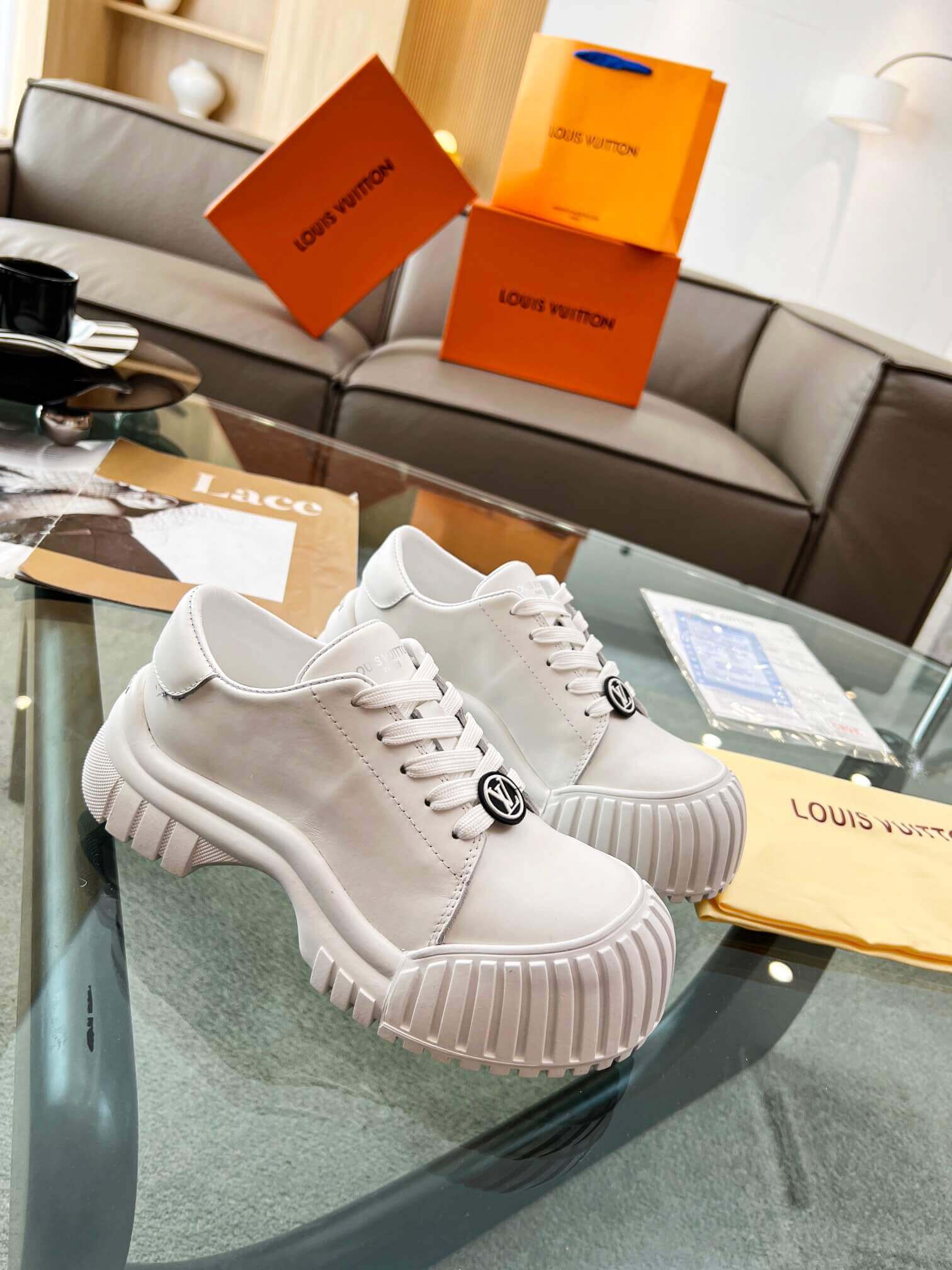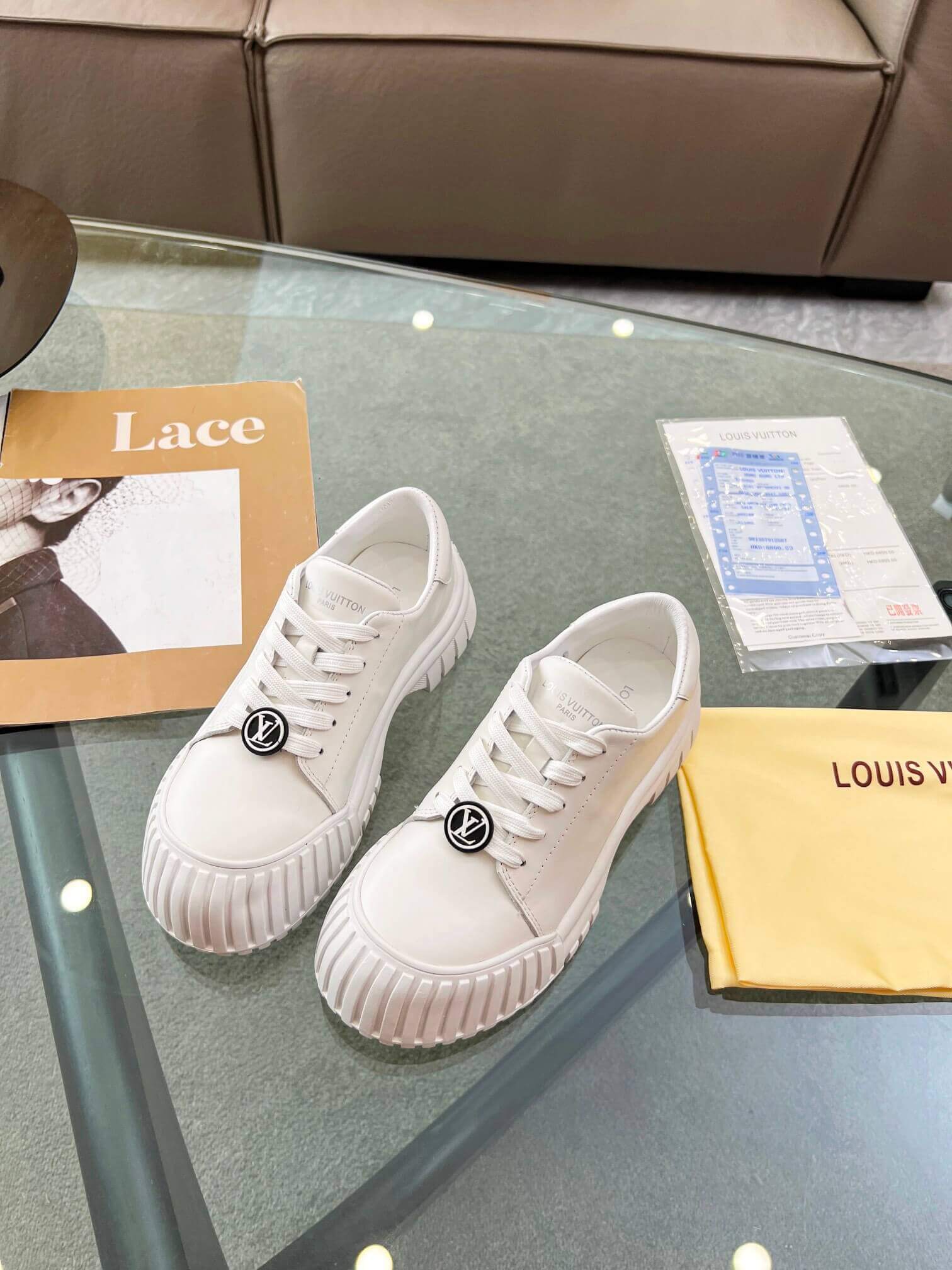 Define modern cool with the Louis Vuitton Ruby Flat Derby Shoe. This on-trend design in crisp white features coordinating laces that complement its fresh, boyish appeal. Grounded by a chunky yet remarkably lightweight white rubber outsole, a key signature of the Ruby line, this shoe boasts distinctive vertical grooves and a prominent LV Circle logo, making it a bold and pristine statement for any contemporary wardrobe.