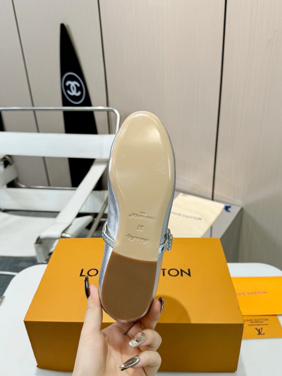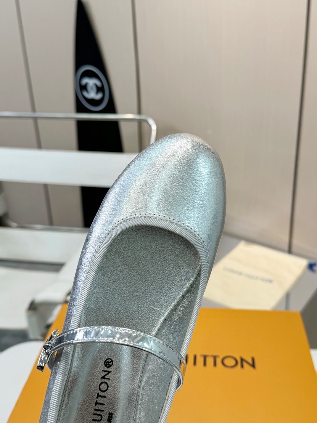 These Louis Vuitton Silver Metallic Leather Ballet Flats radiate modern elegance, showcasing luxurious metallic leather finished in a captivating silver hue. Beautifully detailed with a delicate glossy strap featuring the iconic LV buckle, these ballet flats effortlessly enhance any look, from sophisticated office attire to chic weekend ensembles. Designed for everyday wear, the comfortable yet stylish silhouette combines practicality and premium fashion, making them a versatile addition to your shoe collection.