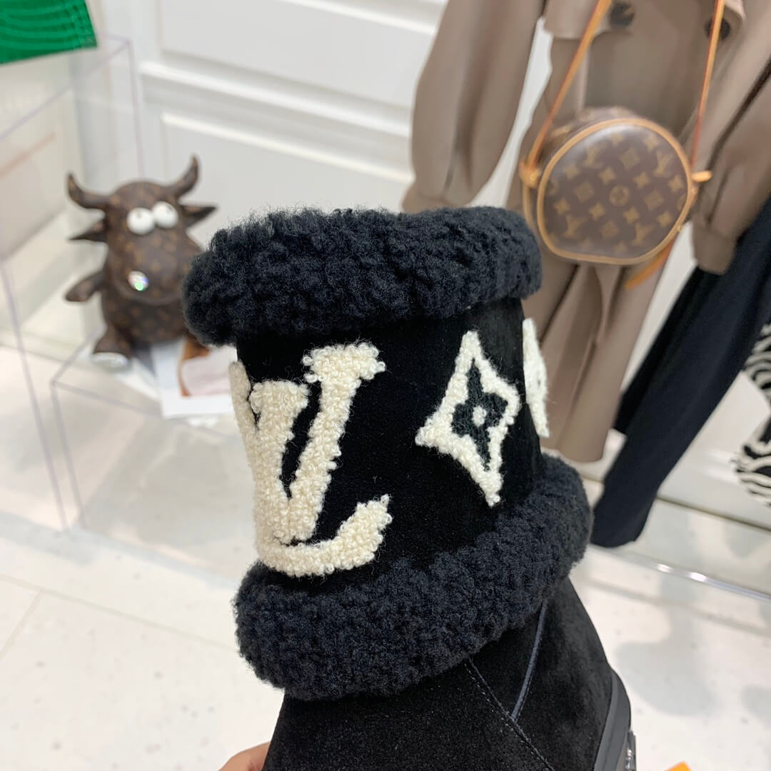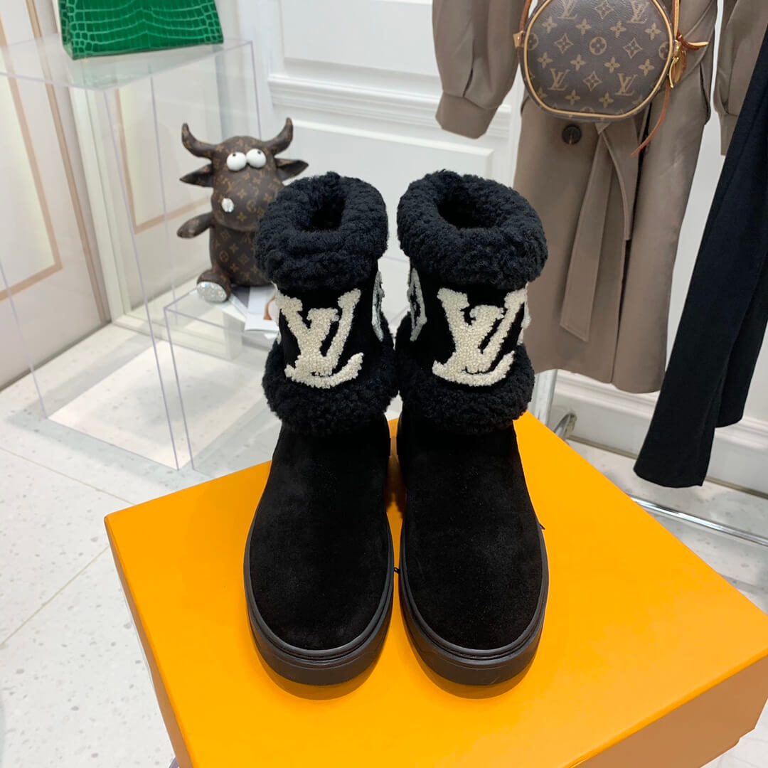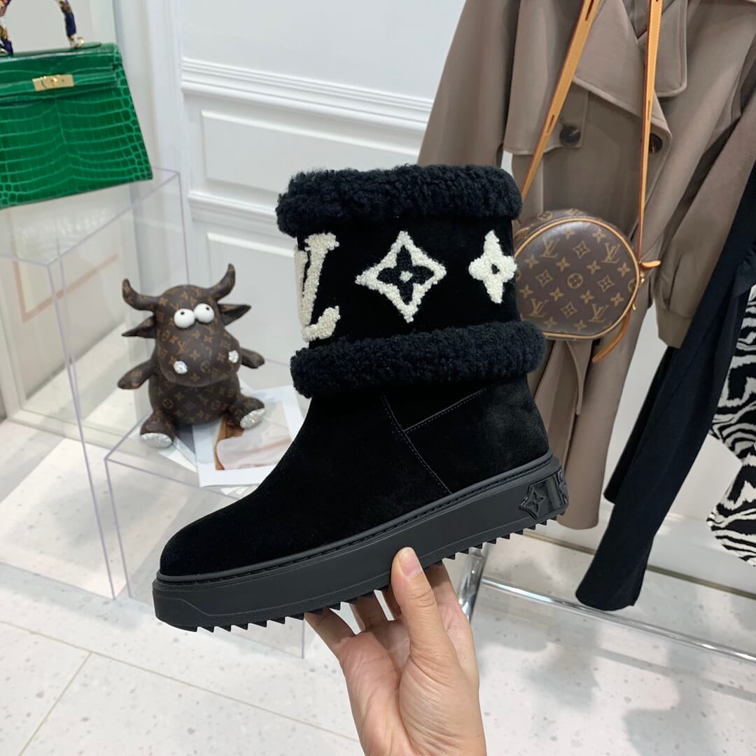 Elevate your winter wardrobe with the Louis Vuitton Snowdrop Flat Ankle Boot in black suede, a luxurious blend of warmth and elegance. Designed for effortless chic, this boot features a plush shearling cuff with bold LV monogram detailing, adding a signature touch to your cold-weather ensemble. The supple suede exterior offers a refined feel, while the sturdy rubber sole ensures durability and comfort with every step. Whether paired with casual denim or a sophisticated winter coat, these boots redefine cozy sophistication for the modern fashion-forward woman.