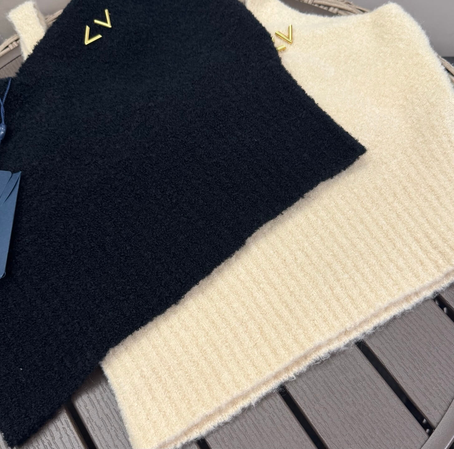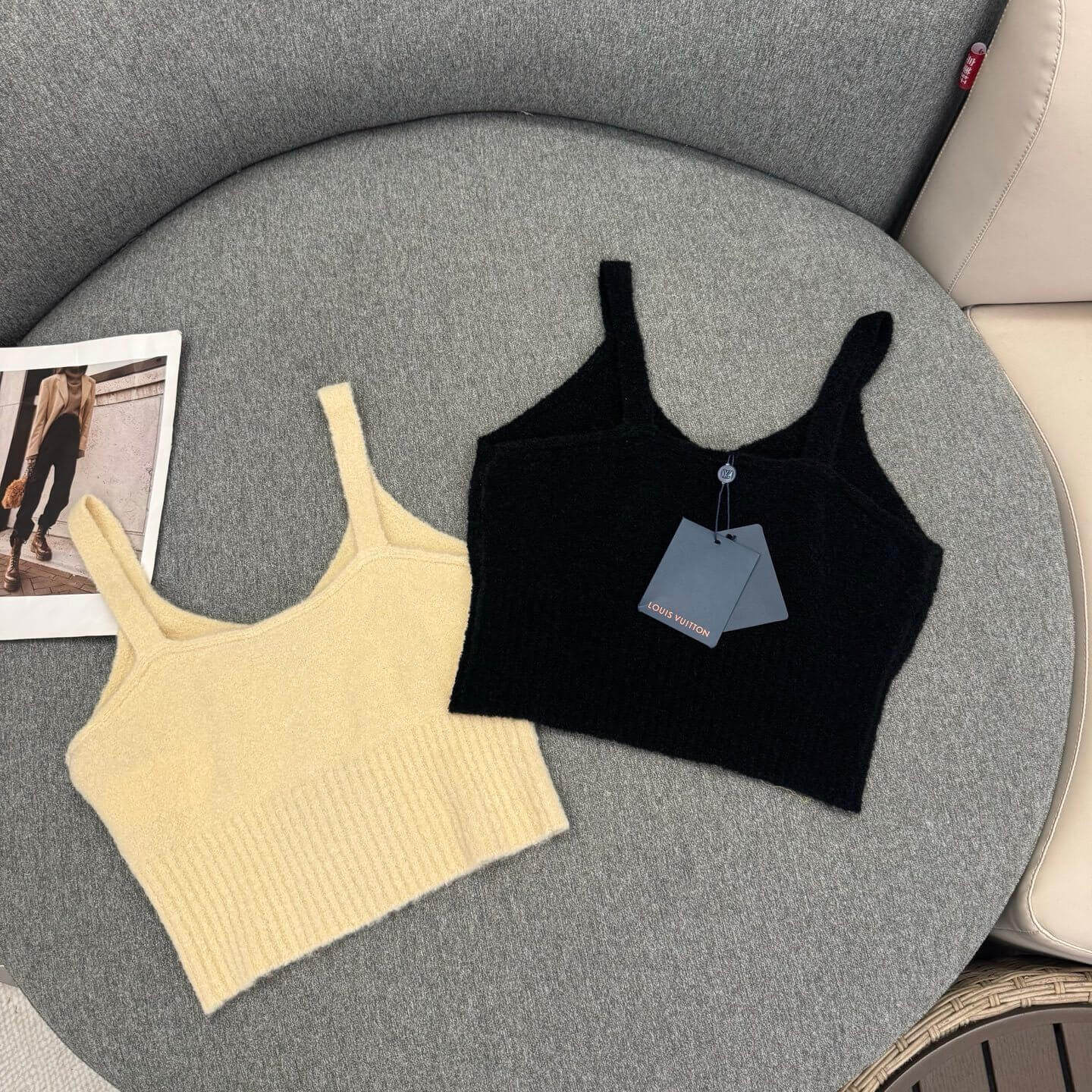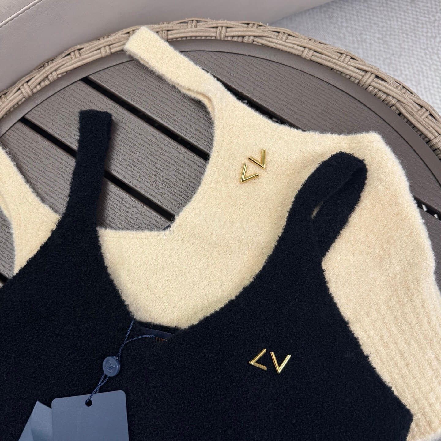The Louis Vuitton V-Neck Cropped Knit Camisole Top with Gold LV Logo Accent is inspired by minimalist luxury knitwear that emphasizes clean lines and subtle branding. Designed as part of an early-spring concept, this camisole reinterprets classic knit construction into a modern, versatile piece that transitions seamlessly from casual wear to elevated layering.