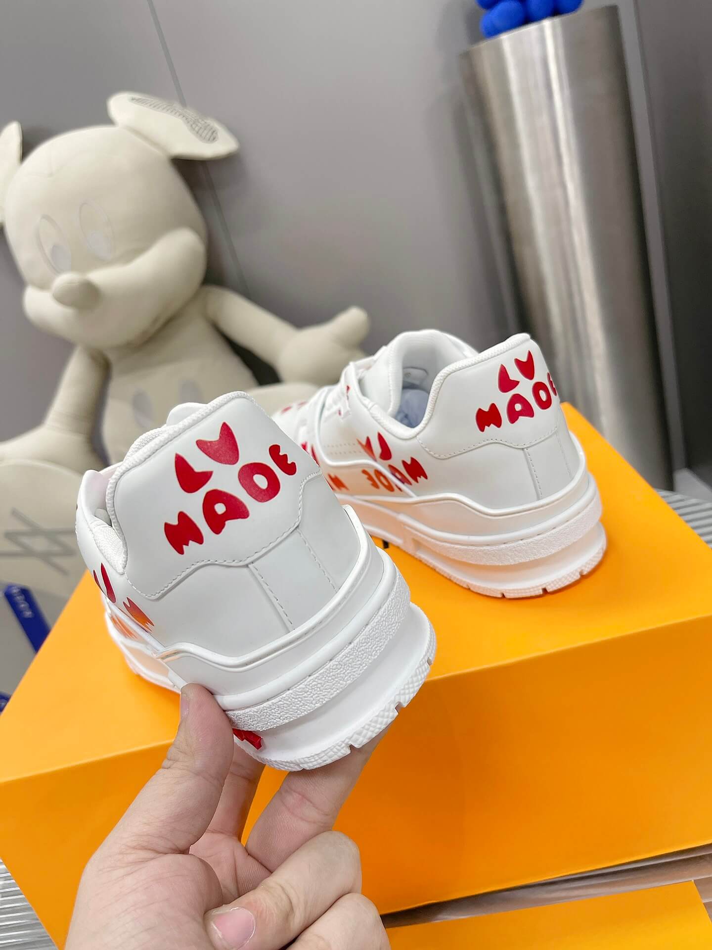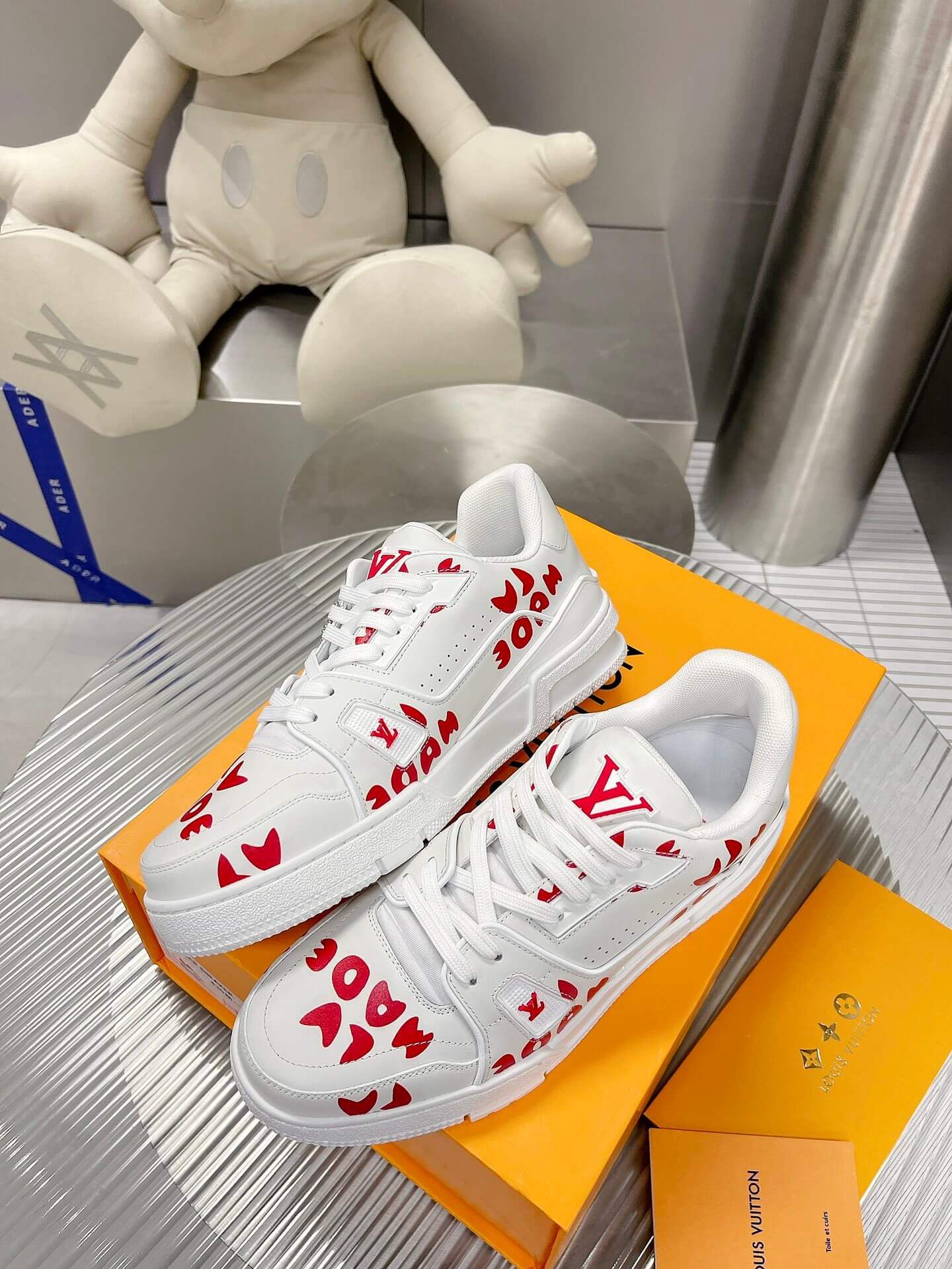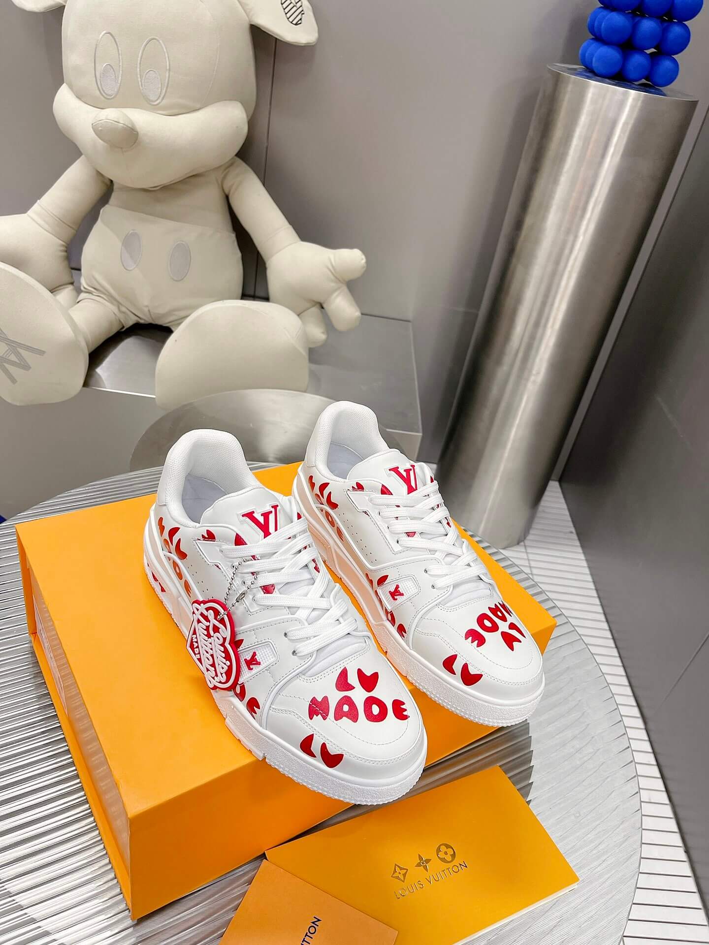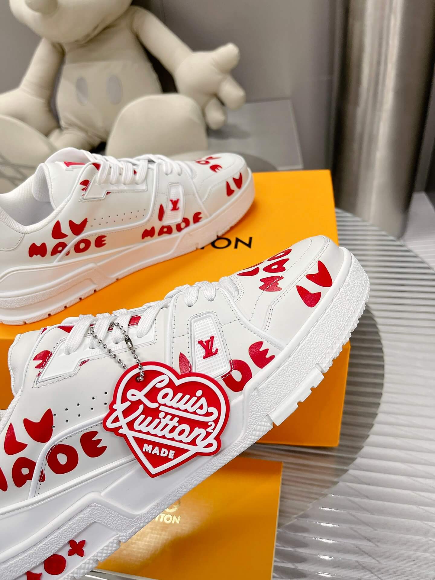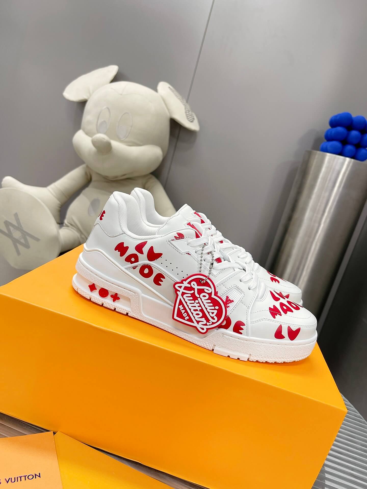A collision of streetwear sensibility and high-fashion artistry, the Louis Vuitton X Nigo LV Made Trainer Sneaker makes a bold statement with its unique collaboration design. This special edition LV Trainer, born from the collaboration with Japanese designer Nigo, features a clean white leather base adorned with striking red graphic prints. The playful “LV Made” branding and Nigo’s signature heart motif add a touch of youthful energy to the iconic silhouette. Featuring an elaborately constructed upper and refined details, this sneaker offers a perfect blend of high-fashion style and contemporary streetwear appeal. Let these trainers be a reflection of your appreciation for unique collaborations and bold design.