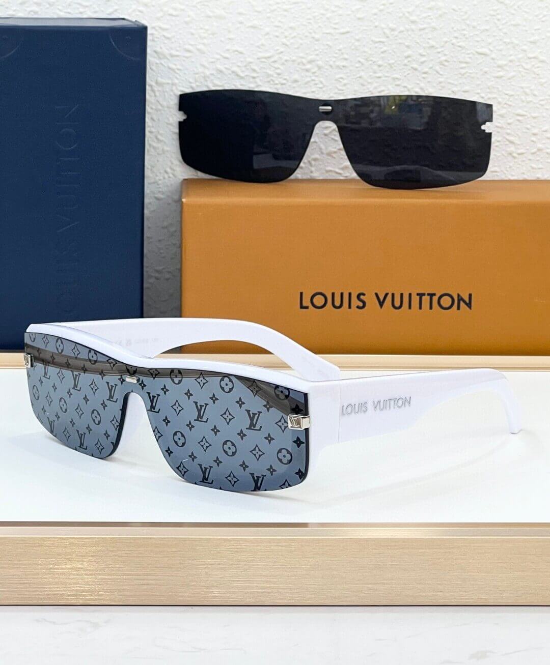 Make a bold statement with the LV Shadow Square Sunglasses, a perfect fusion of streetwear attitude and high-end luxury. Designed with a chunky square frame, these sunglasses feature interchangeable monogram lenses, allowing you to switch up your look effortlessly. The Louis Vuitton monogram pattern is elegantly etched onto the lenses, offering a unique, fashion-forward appeal. The LV initials on the temples add a refined finishing touch, making these sunglasses a must-have for trendsetters.