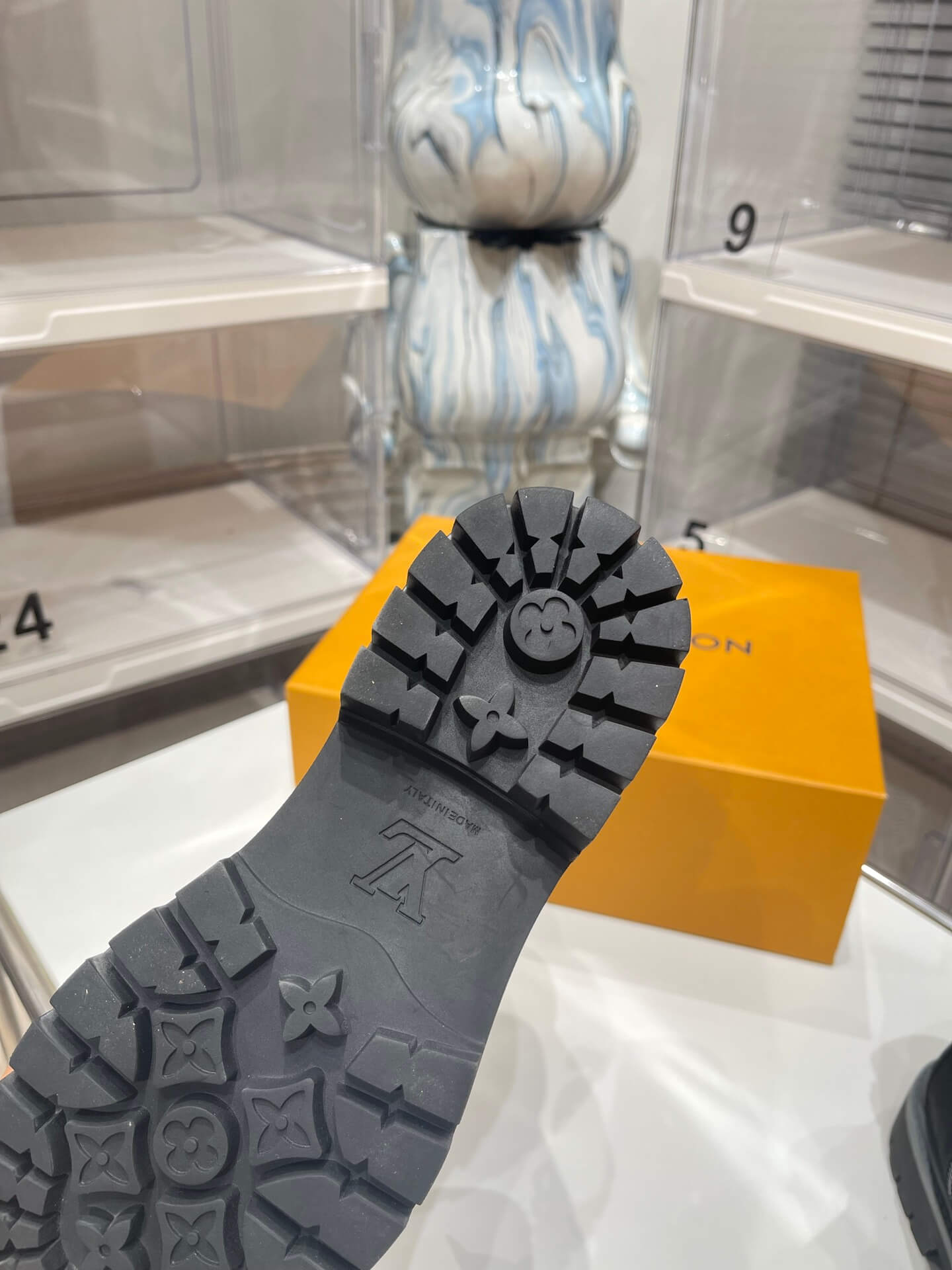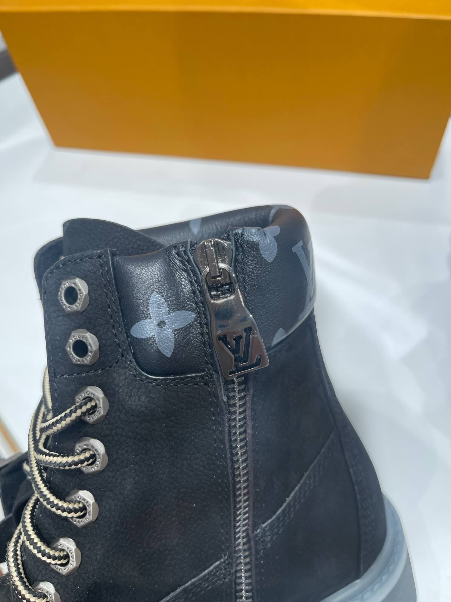 The LV x Timberland Black Ankle Boot brings together the iconic craftsmanship of Louis Vuitton and the rugged durability of Timberland in a bold, fashion-forward design. Crafted from premium black suede, these boots feature a sturdy rubber sole with deep treads for superior grip and all-day comfort. The sleek, lace-up silhouette is enhanced by metal eyelets and contrast rope laces, while the signature LV monogram accents on the ankle add a touch of refined elegance. Whether you’re navigating city streets or embracing the outdoors, these ankle boots offer the perfect blend of street-style edge and high-fashion sophistication.