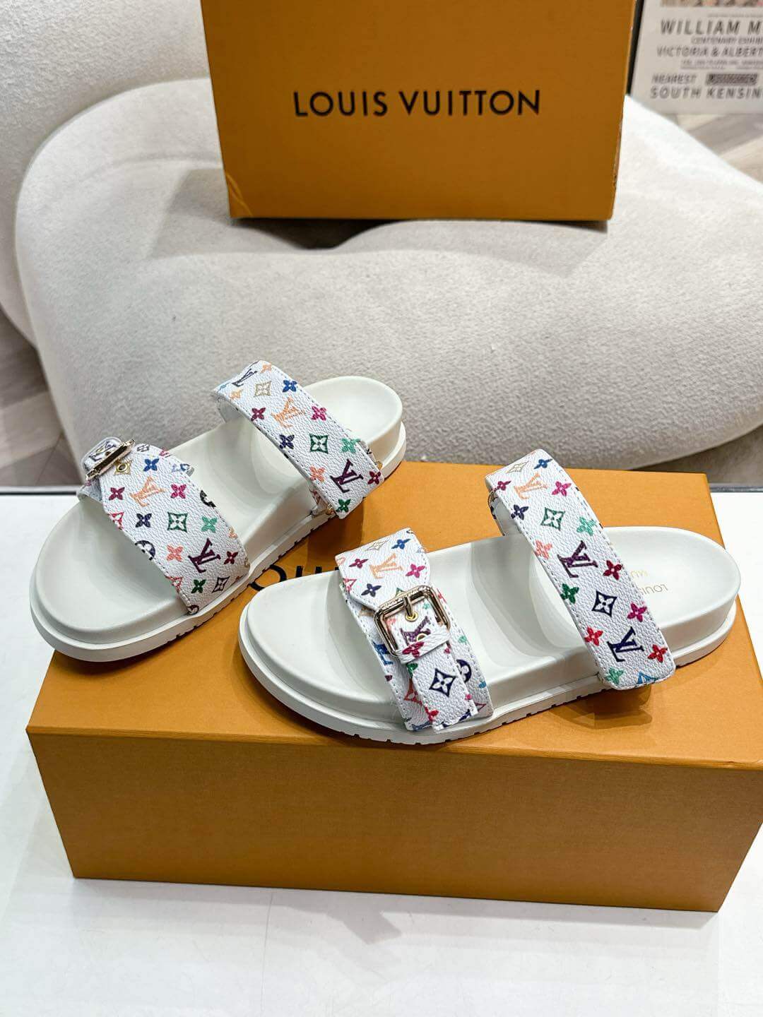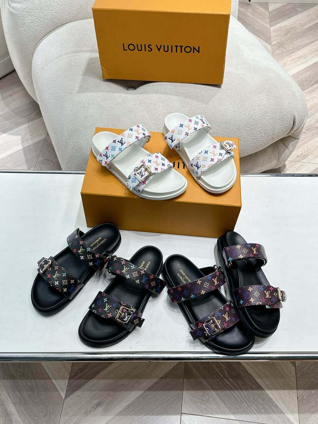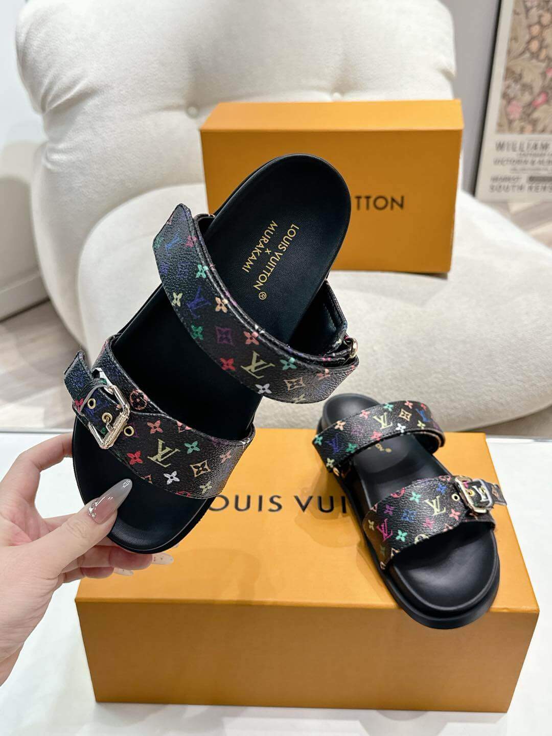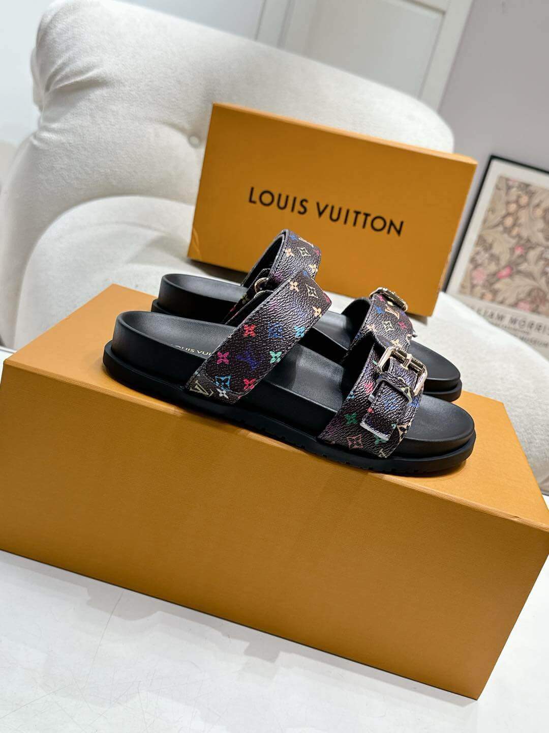 Step into luxury and style with the LV x TM Bom Dia Flat Comfort Mule, a bold and trendy footwear inspired by Louis Vuitton’s iconic design. This striking piece features the signature monogram canvas and vibrant multi-colored details, delivering the perfect blend of high-fashion aesthetics and everyday comfort. The sleek buckle strap and cushioned sole ensure a comfortable fit for all-day wear, while the striking patterns make a statement wherever you go.