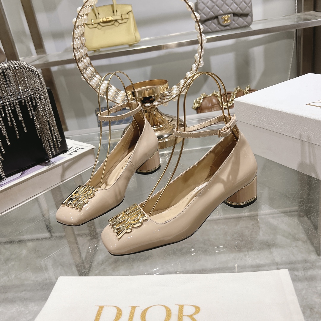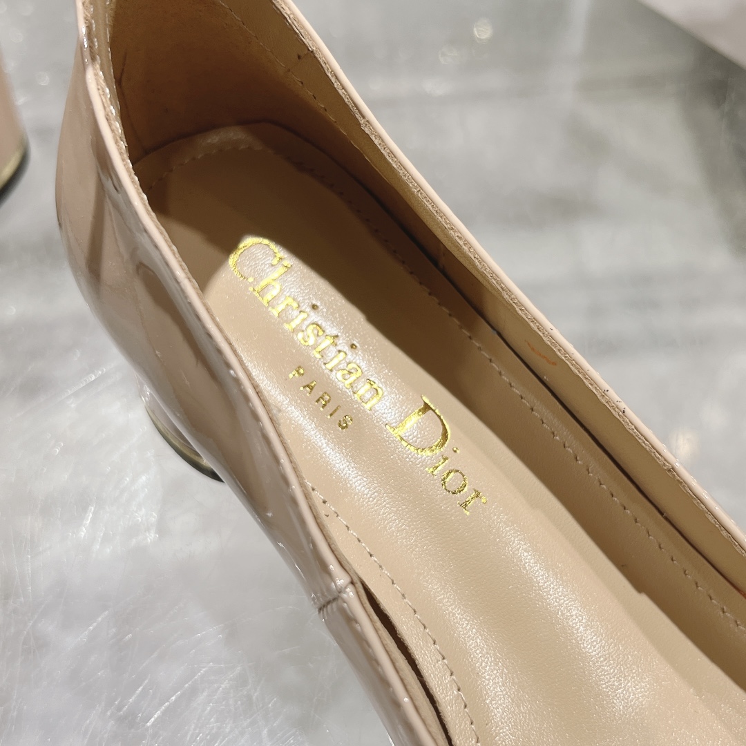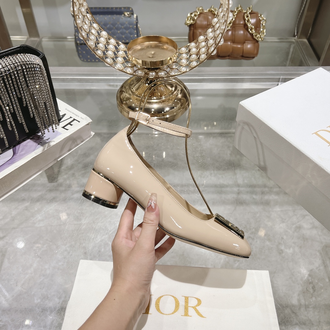 The Miss Dior Beige Patent Leather Pumps are a chic and timeless addition to any wardrobe. Crafted from high-quality calfskin, these pumps feature a square toe for a sleek, modern look. The standout detail is the gold-tone “DIOR” logo embellishment on the toe, adding a touch of luxury to the design. A block heel, measuring 40mm (approximately 1.5 inches), offers a comfortable and practical height, while the adjustable ankle strap ensures a secure fit.