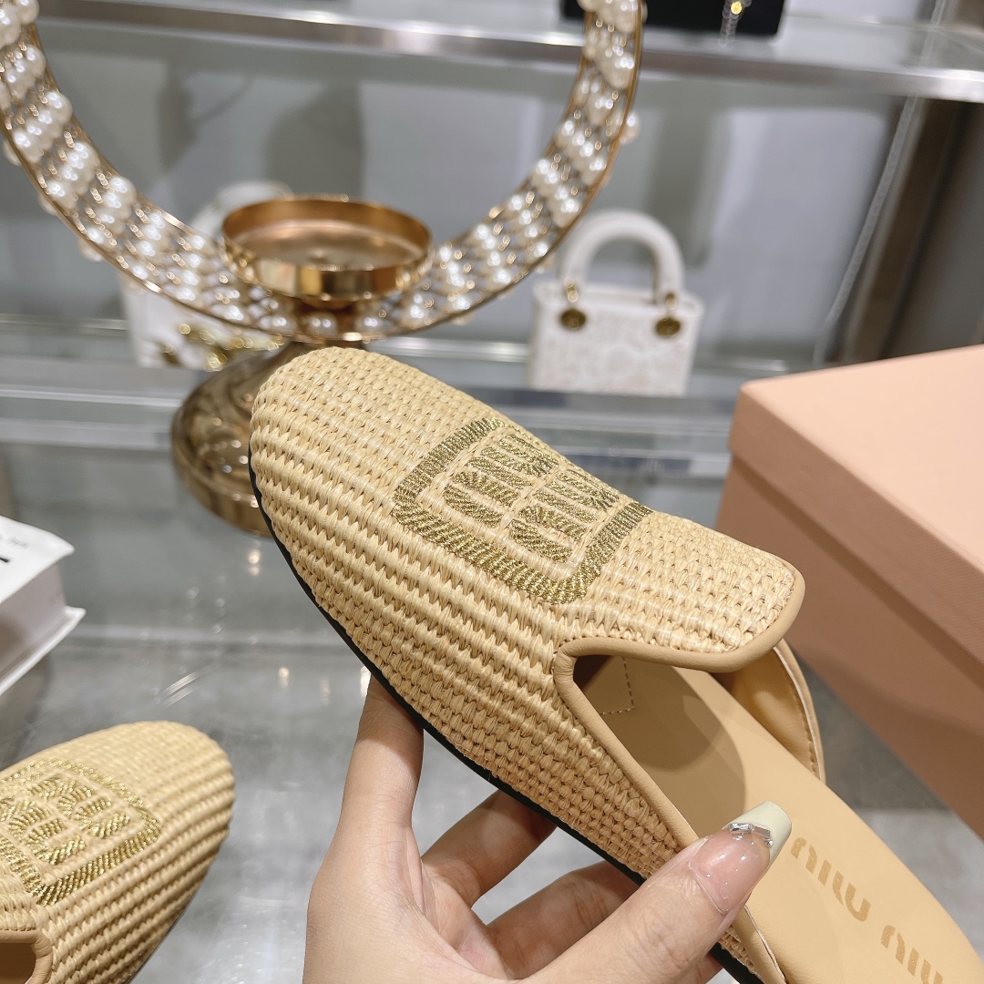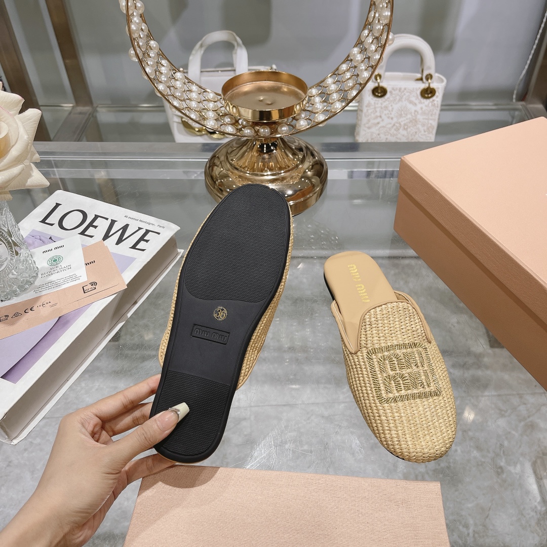 These luxurious slip-on slippers feature a sophisticated raffia texture in a neutral beige tone, accented by the iconic MIU MIU logo embroidered in a contrasting soft green.