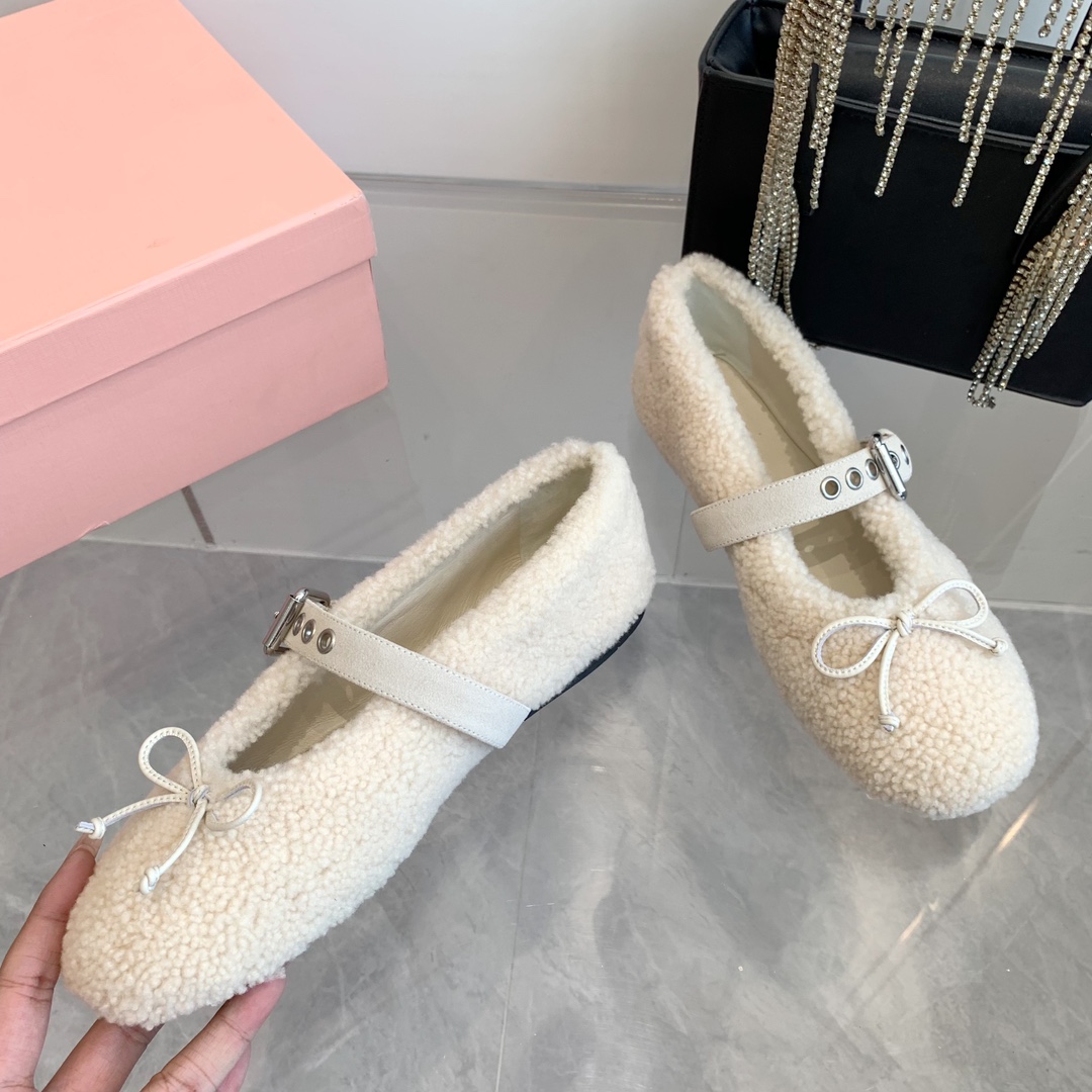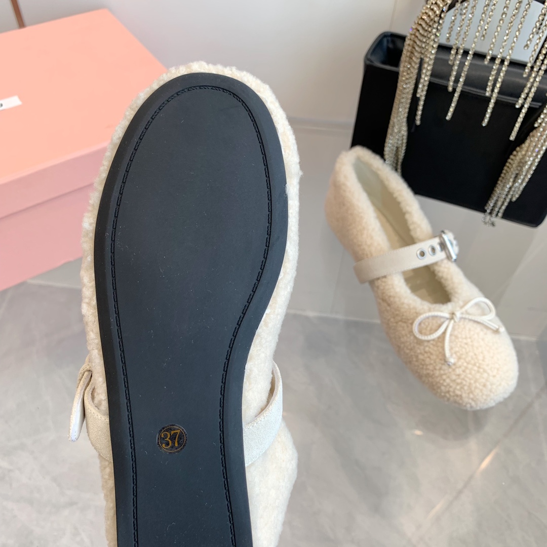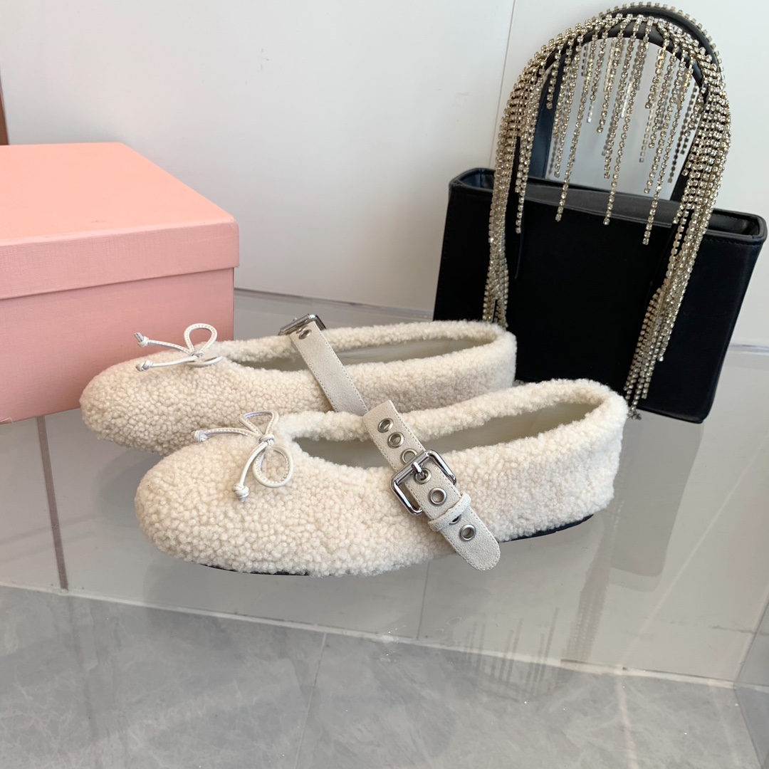 These Miu Miu ballet flats combine comfort with high-fashion allure, crafted from soft shearling material for a cozy and chic look.