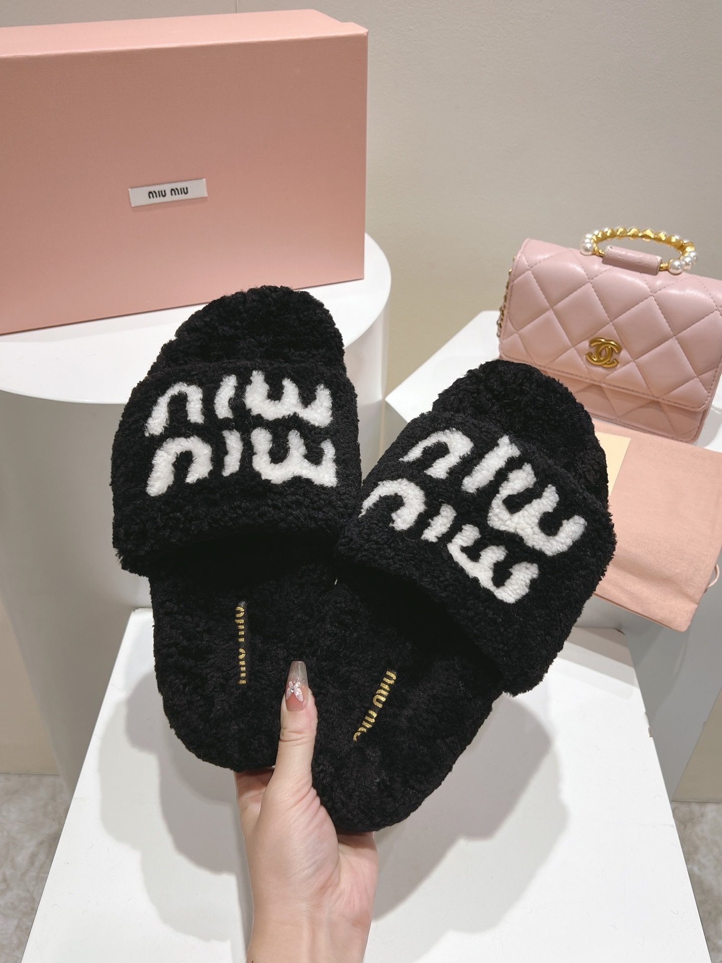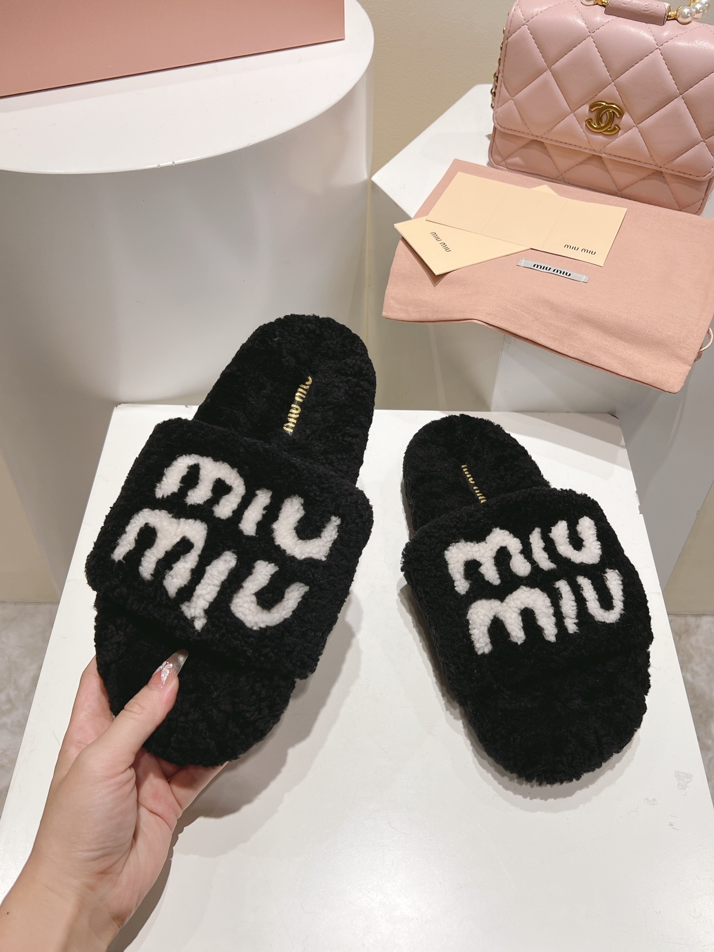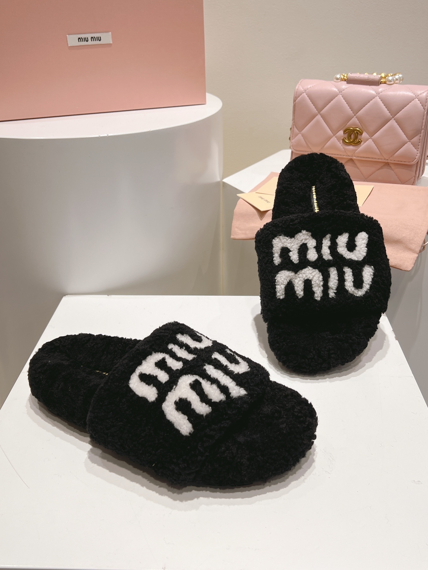 The Miu Miu Black and White Logo Shearling Slides combine plush comfort with bold branding. Crafted from ultra-soft black shearling, these open-toe slides are designed for both relaxation and effortless style. The wide strap is accented with the oversized Miu Miu logo in contrasting white, adding a striking graphic detail. A cushioned shearling foot-bed ensures all-day comfort, while the durable sole provides grip for indoor and light outdoor wear. Perfect for elevating cozy loungewear or adding a chic edge to casual outfits, these slides epitomize luxury leisure.