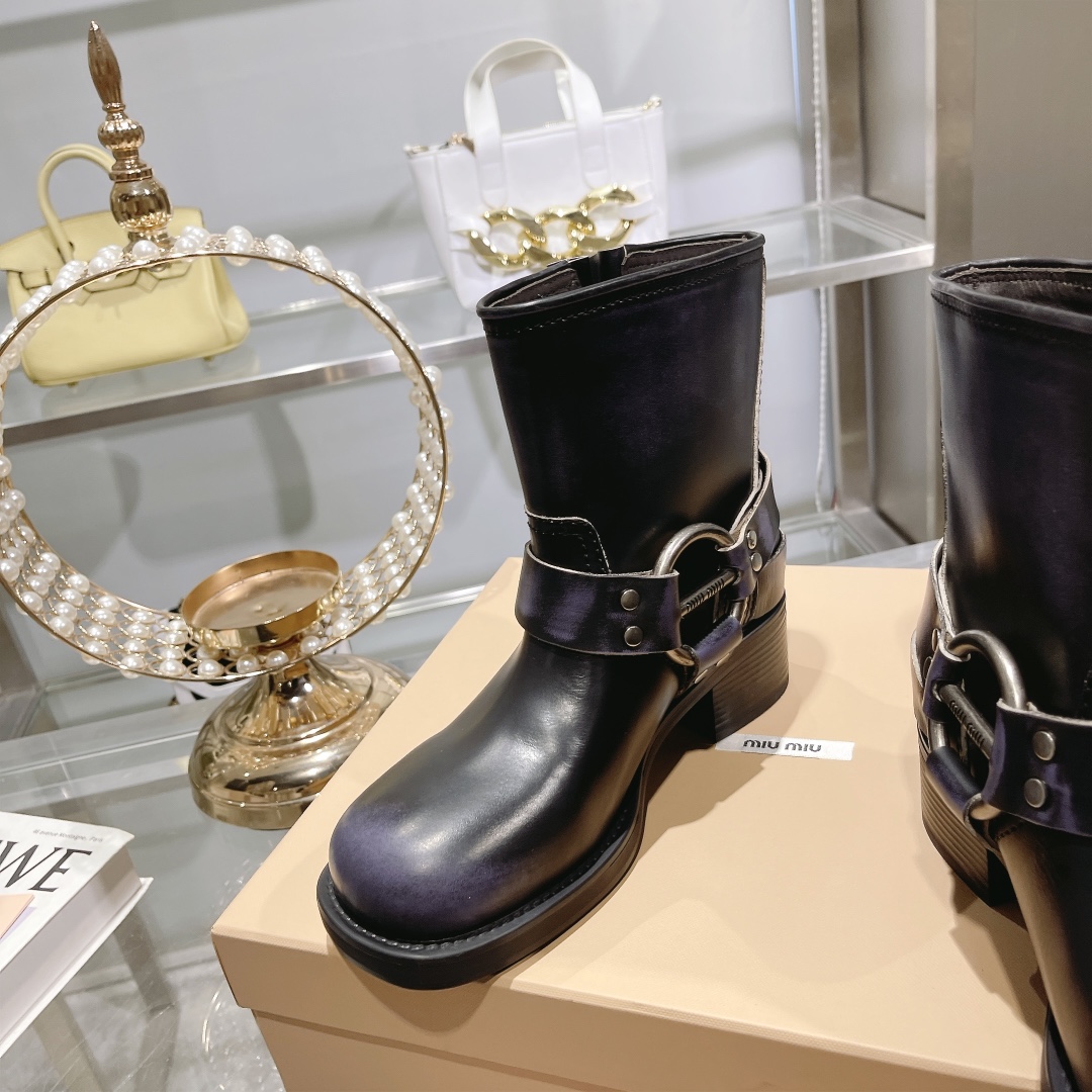 Command attention in these authentic Miu Miu biker boots, reimagined in striking black leather with an iridescent purple sheen.