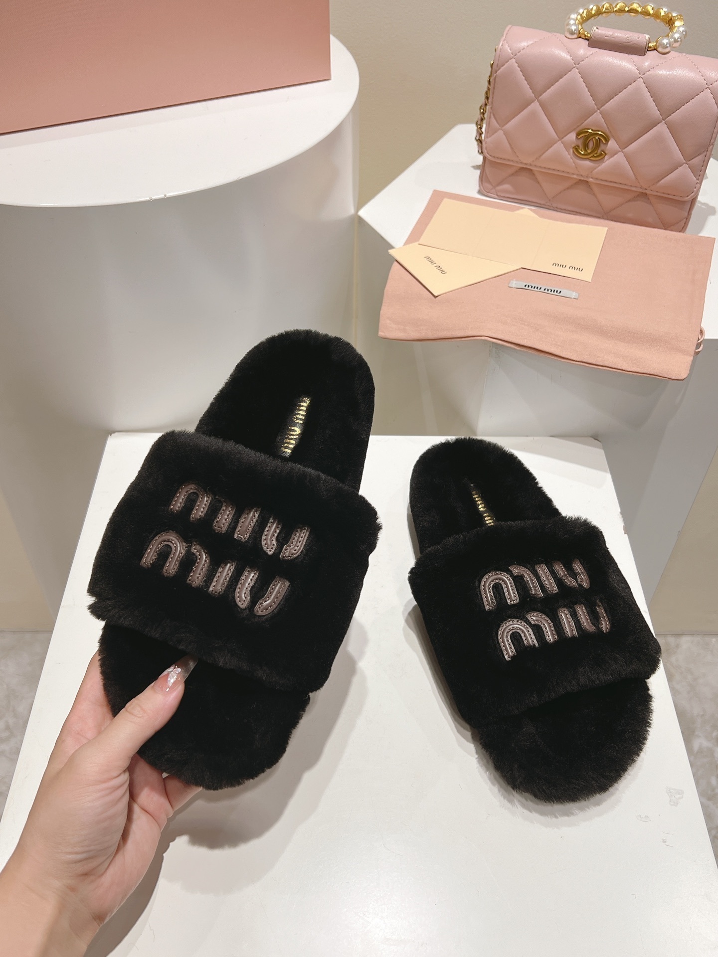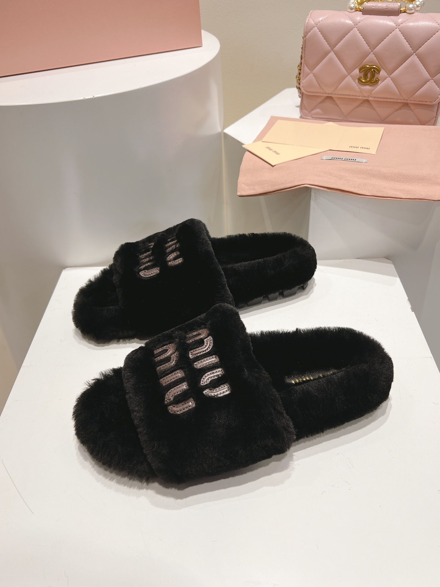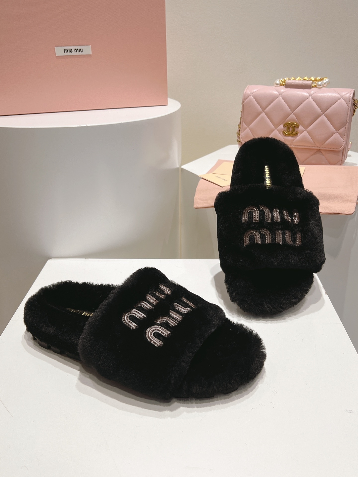 The Miu Miu Black Logo Shearling Slides are a cozy yet luxurious essential, perfect for adding comfort and style to your off-duty looks. Crafted from plush black shearling, these slides feature the signature Miu Miu logo embroidered in soft contrast tones across the wide strap. The cushioned foot-bed and durable sole offer both warmth and support, making them ideal for lounging at home or elevating a casual streetwear ensemble. A chic expression of relaxed sophistication, these slides embody Miu Miu’s playful yet refined aesthetic.