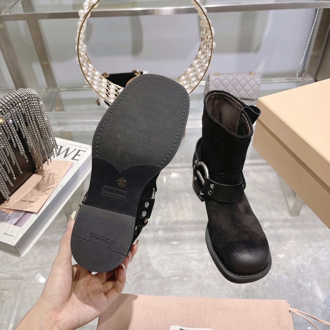 Step into bold Italian luxury with these authentic Miu Miu black suede biker boots, a perfect fusion of edgy street style and high-fashion elegance.