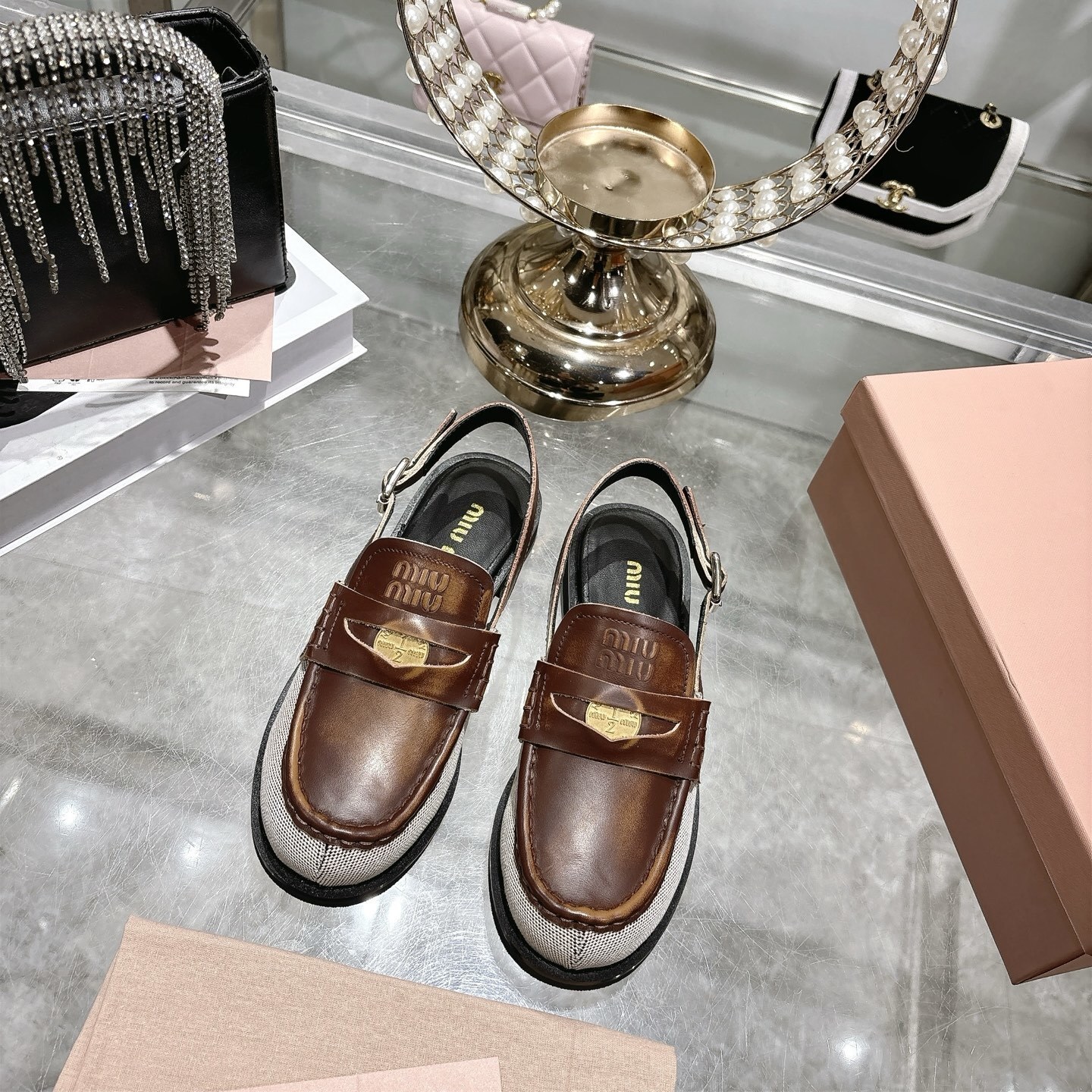 The Miu Miu Vintage Effect Leather Slingback Penny Loafers combine classic menswear inspiration with modern feminine styling. Crafted from rich brown vintage-finish leather, these loafers feature a timeless penny loafer silhouette enhanced with a contemporary slingback strap for a refined yet relaxed feel.
