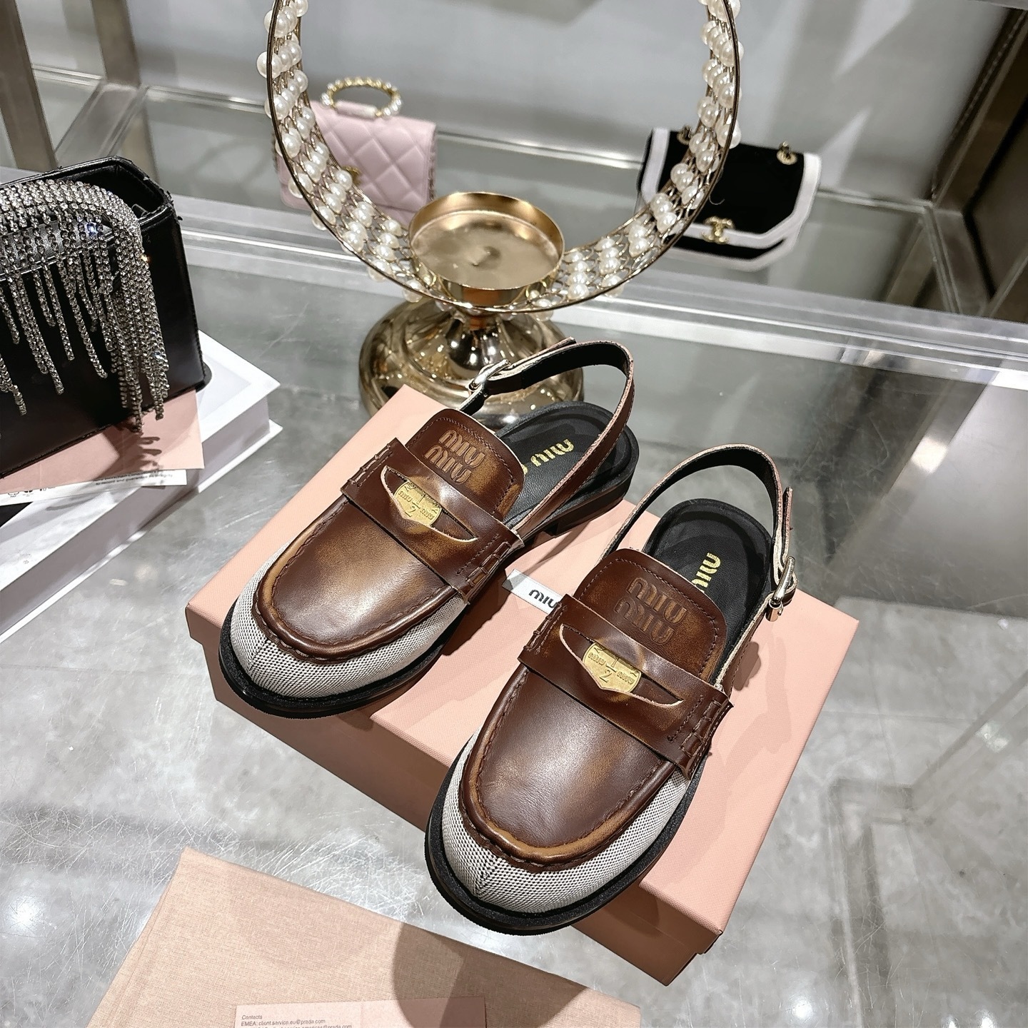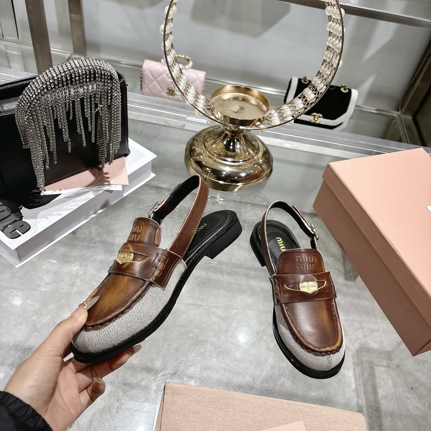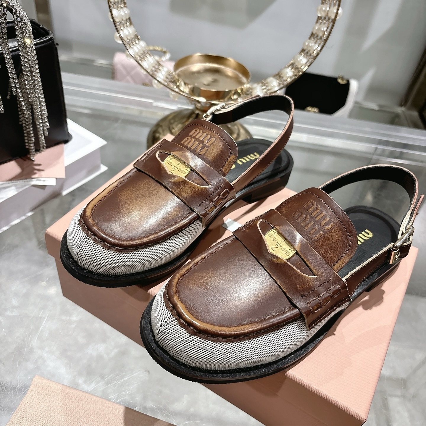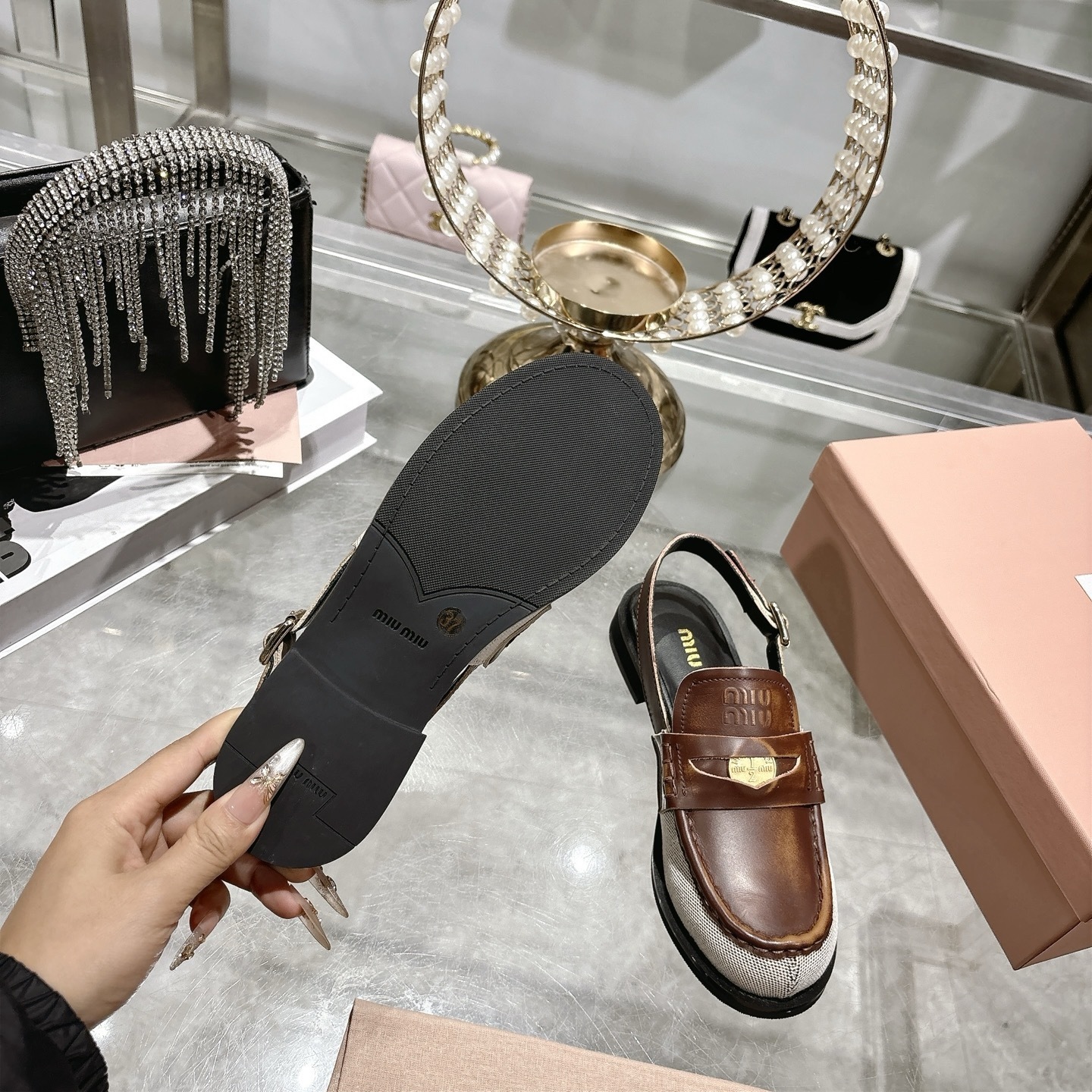 Features: Embossed Miu Miu logo, gold-tone coin detail, penny loafer strap, adjustable slingback buckle, contrast canvas toe cap
