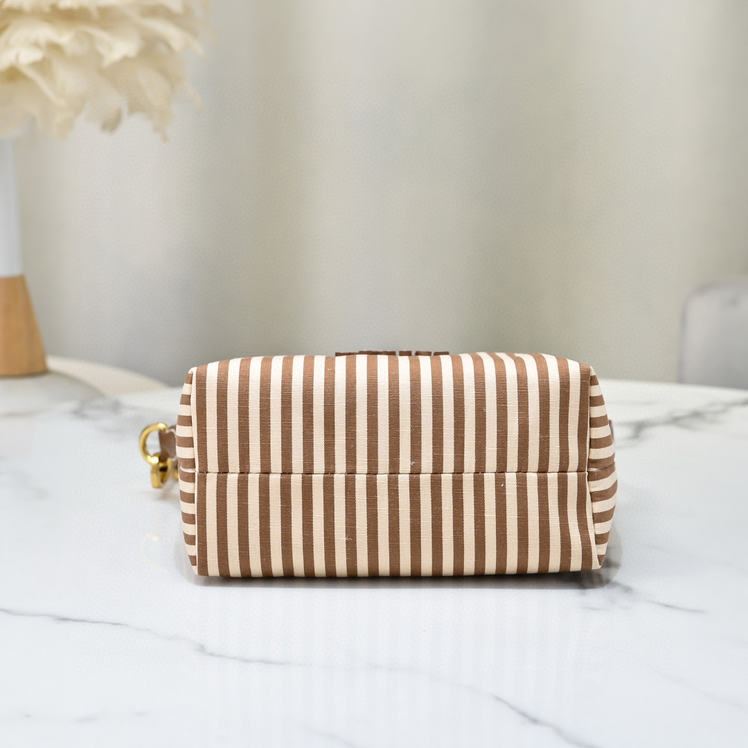 Elevate your casual chic style with the Miu Miu Spirit Fabric Mini Bag, crafted from durable striped canvas in warm brown and beige tones. Accented with a stitched Miu Miu logo on the front, this playful yet elegant mini bag is finished with a detachable leather strap and gold-tone hardware.