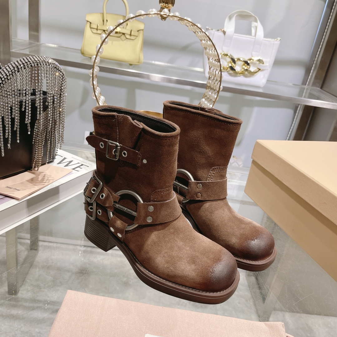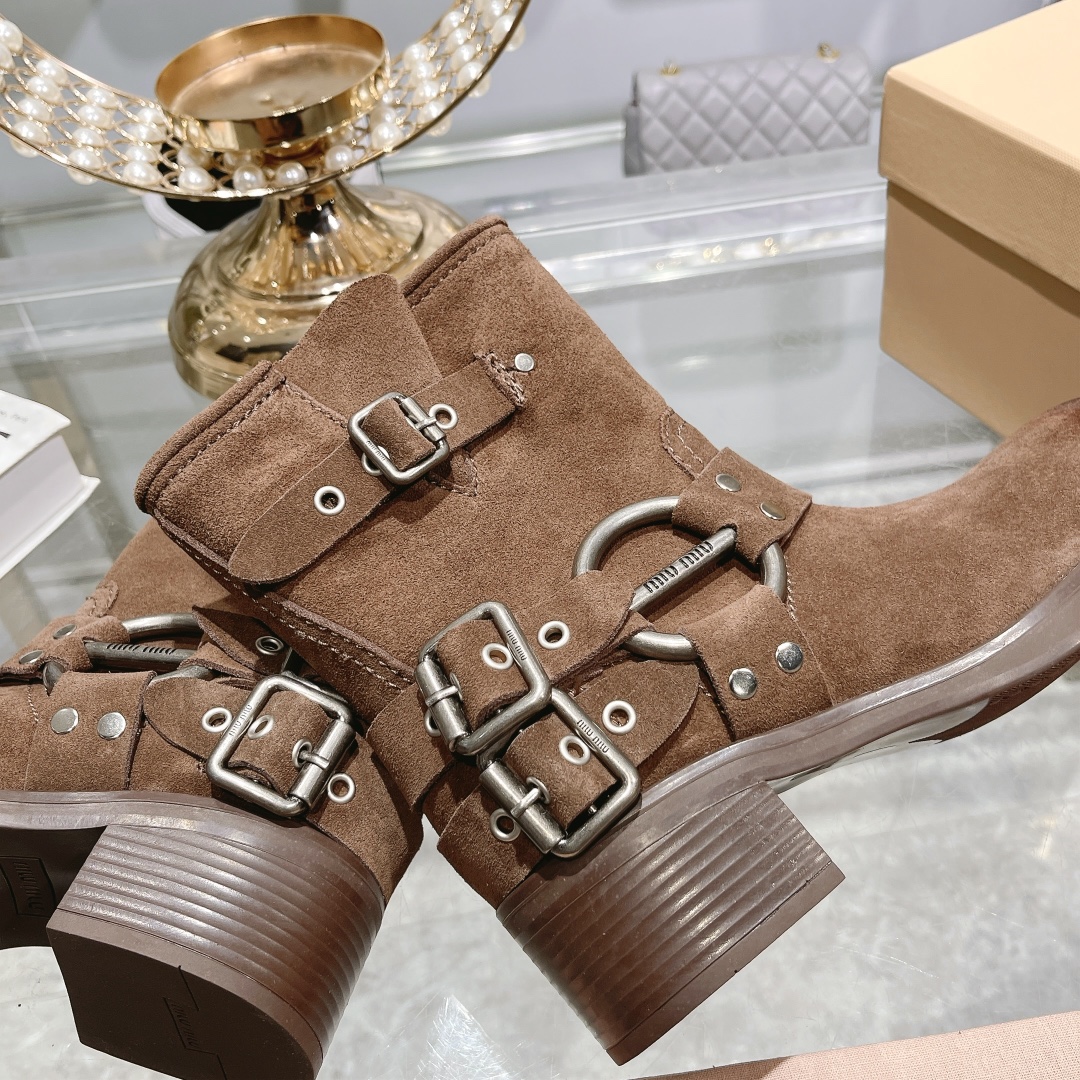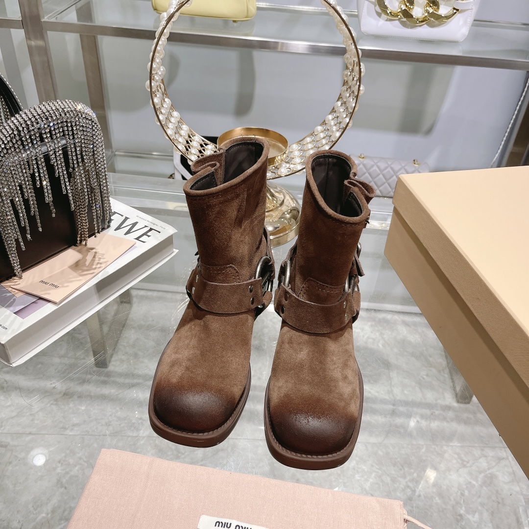 Step into statement style with these authentic Miu Miu biker boots in rich brown suede—a luxurious twist on the iconic combat silhouette.