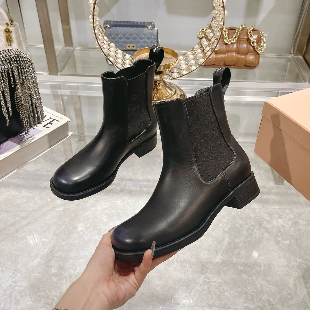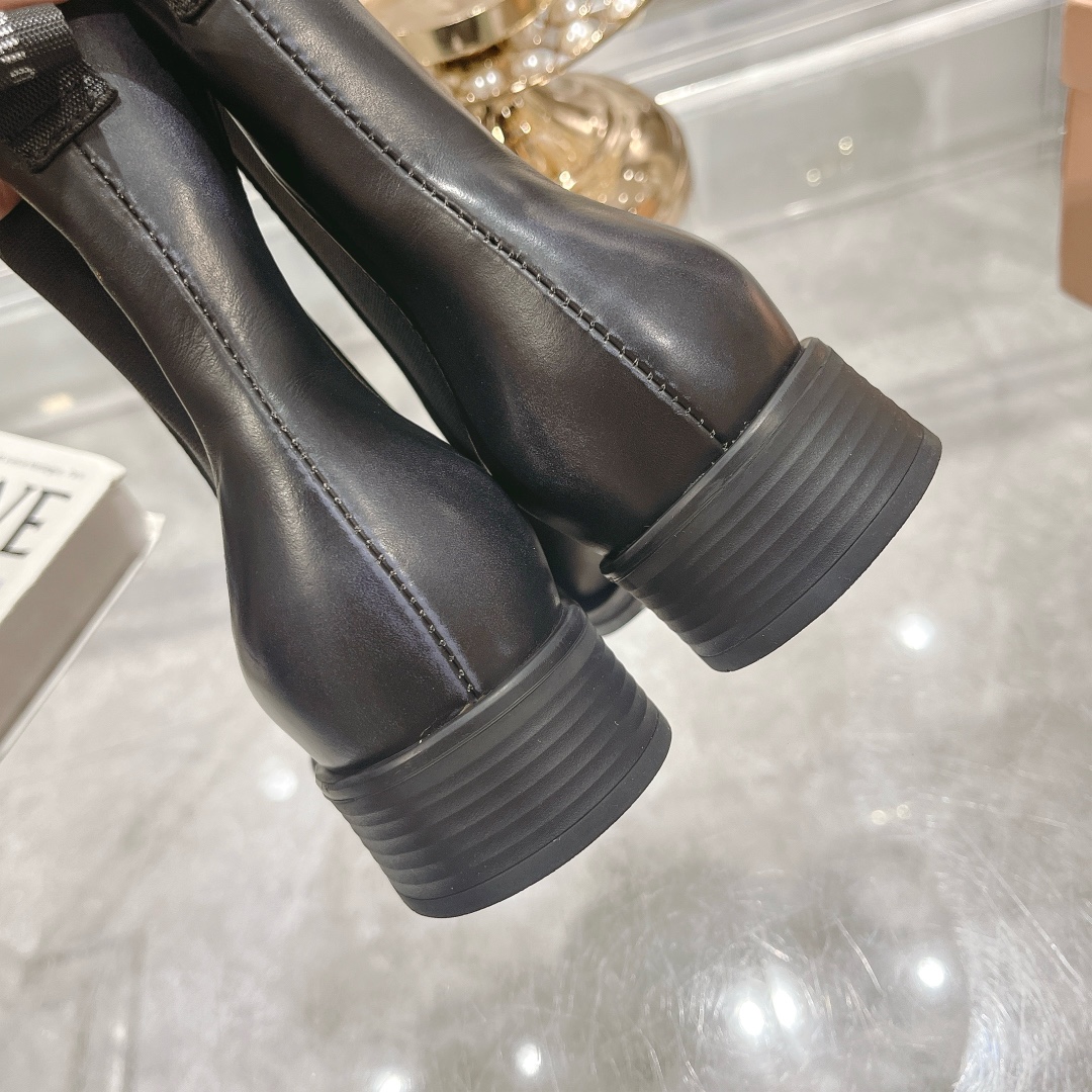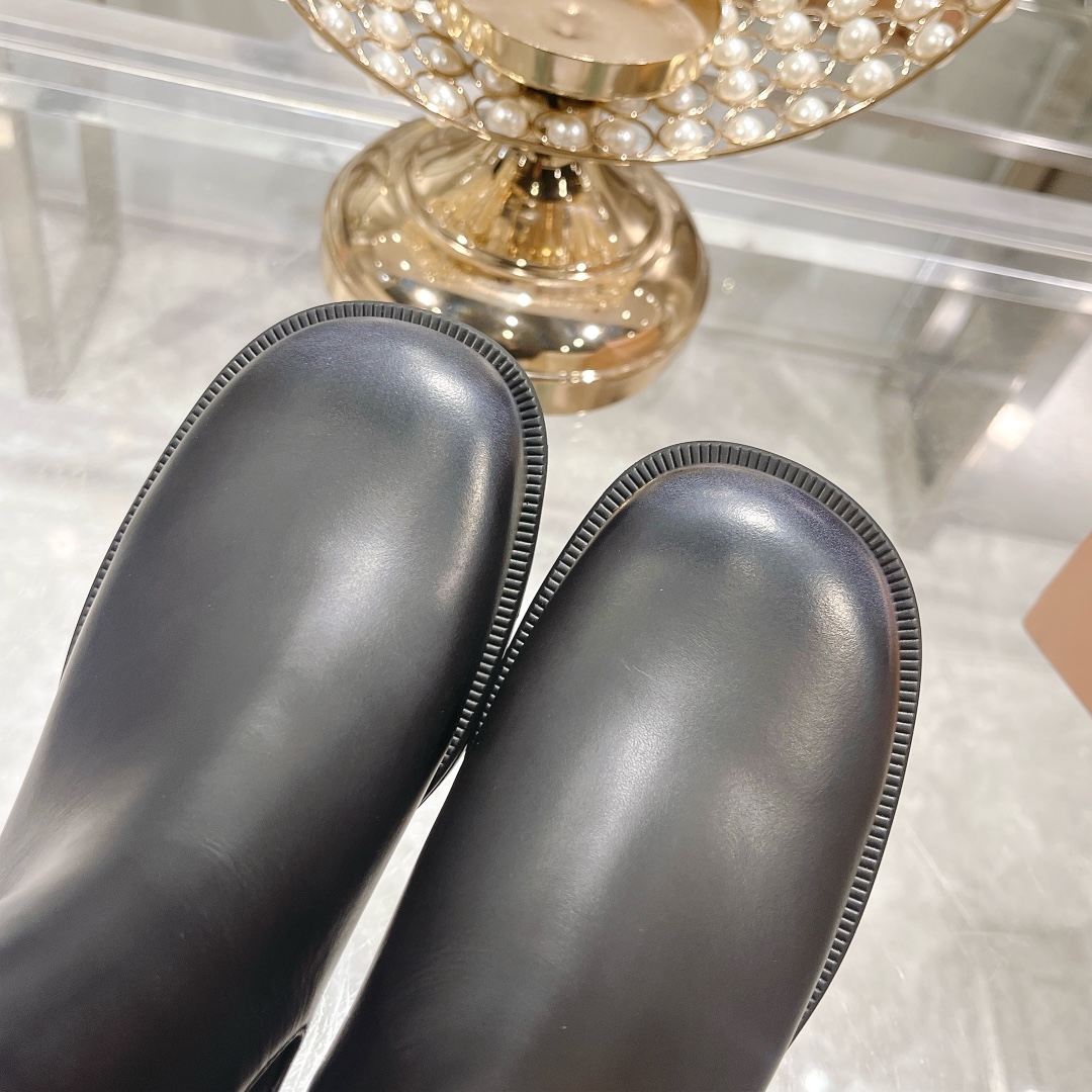The boots are set on a durable rubber lug sole that offers excellent grip, making them ideal for all-day wear. A low block heel adds a touch of elevation without sacrificing comfort, and the subtle Miu Miu logo on the pull tab serves as a discreet nod to the brand’s iconic luxury.