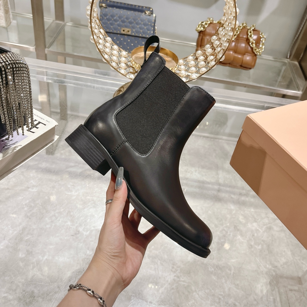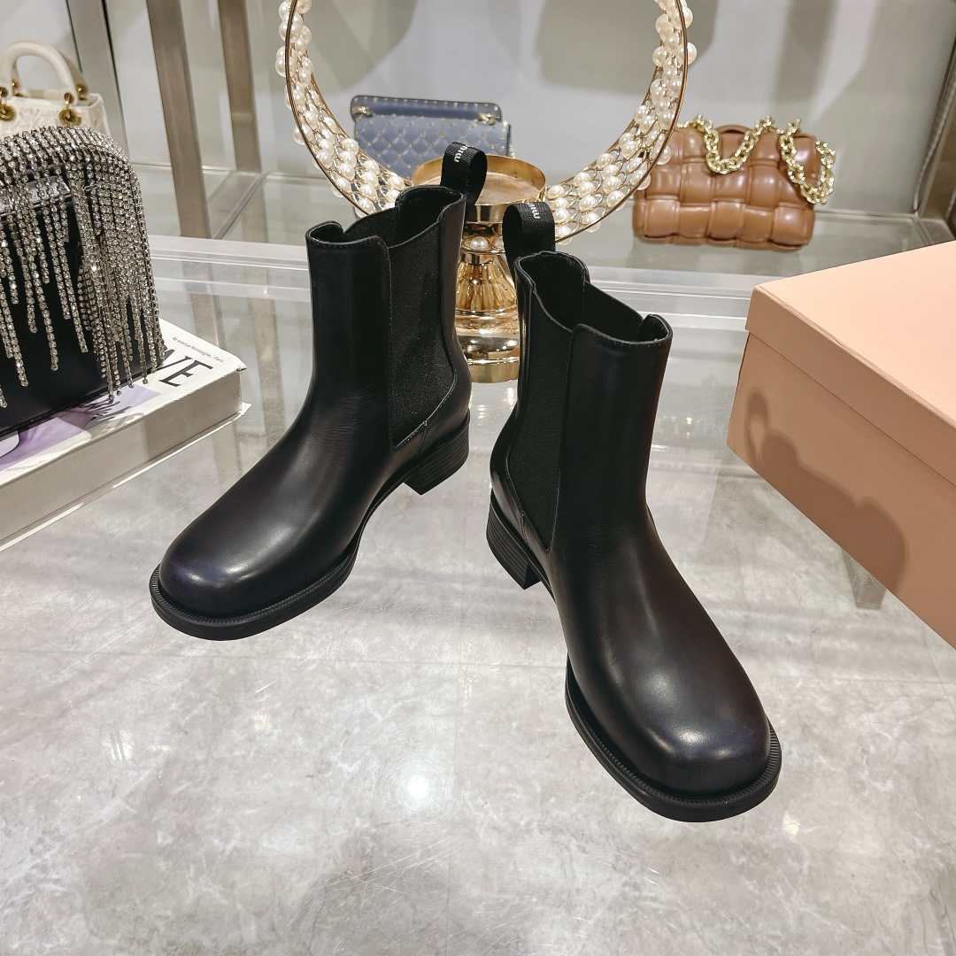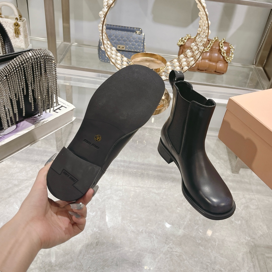 The boots are set on a durable rubber lug sole that offers excellent grip, making them ideal for all-day wear. A low block heel adds a touch of elevation without sacrificing comfort, and the subtle Miu Miu logo on the pull tab serves as a discreet nod to the brand’s iconic luxury.