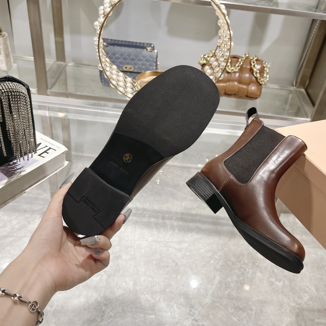 Crafted from premium leather, the Miu Miu Classic Leather Chelsea Boots in brown epitomize luxury and practicality.